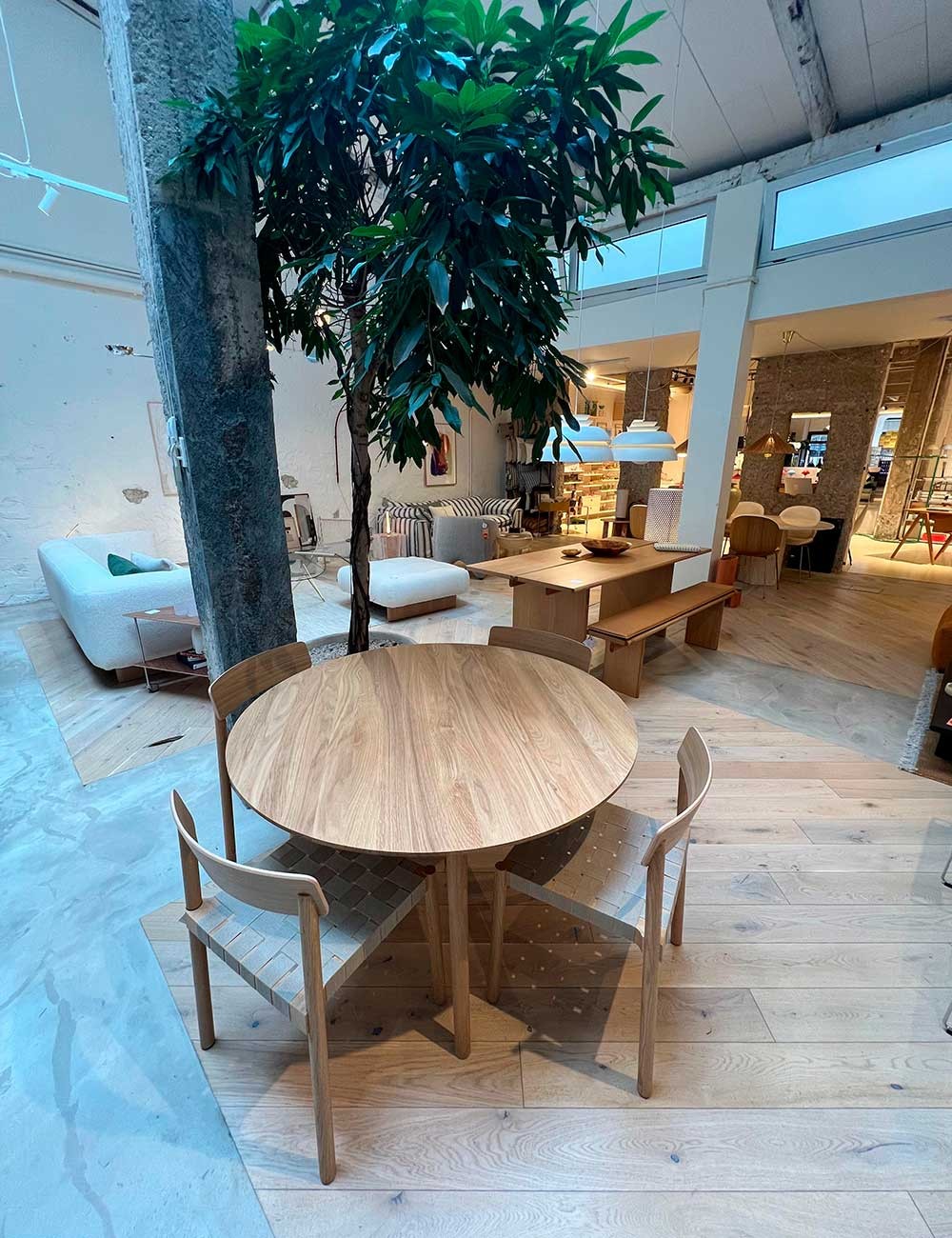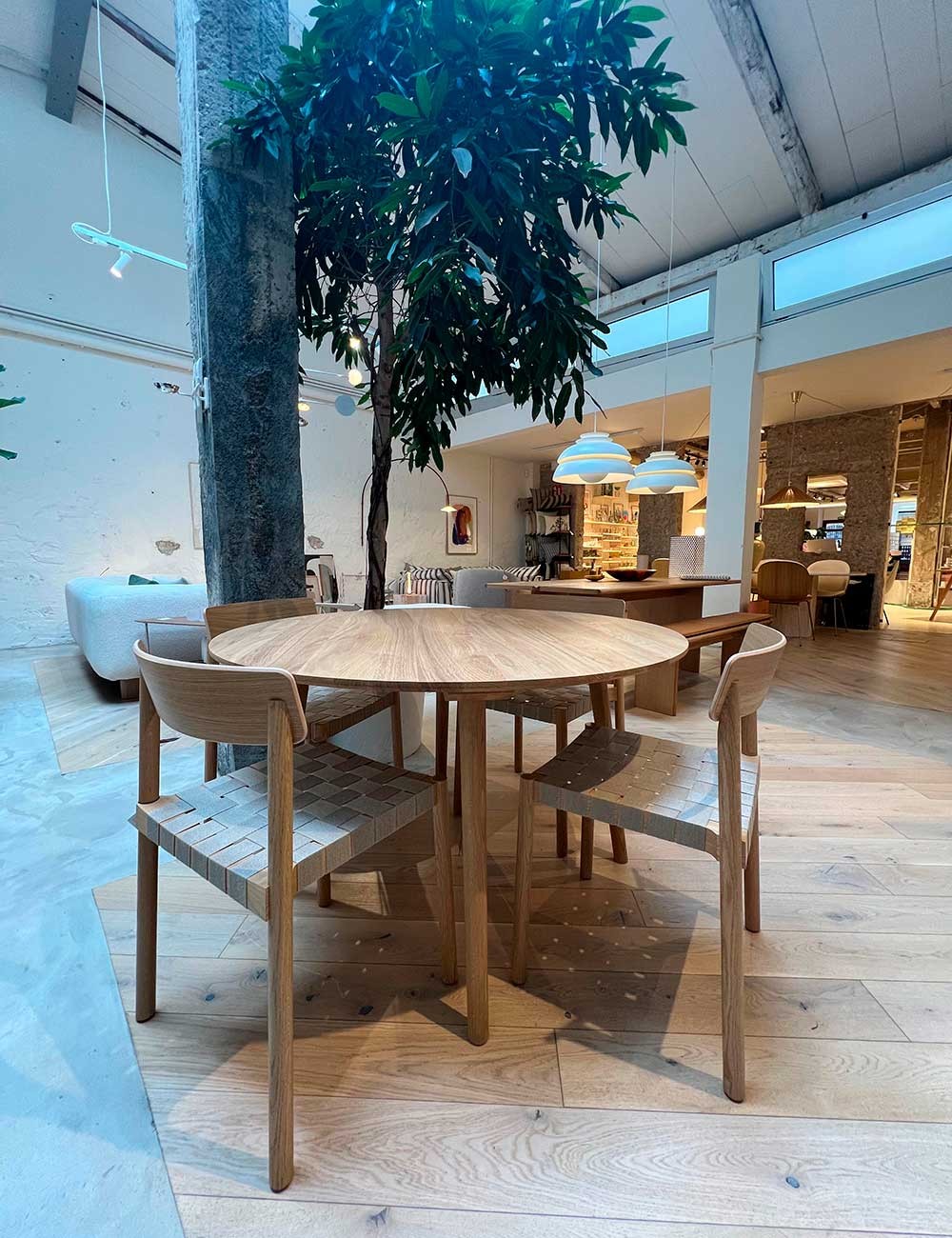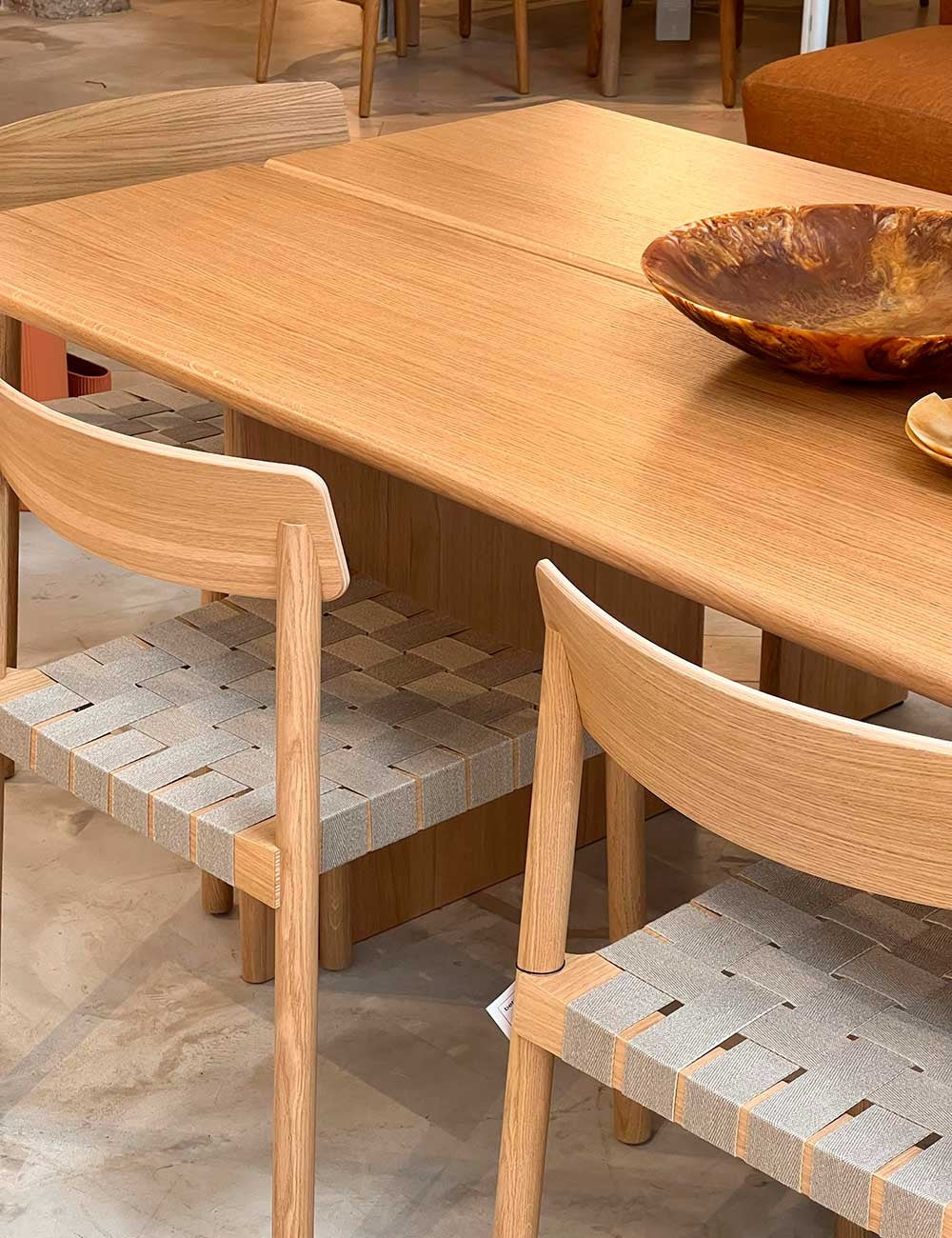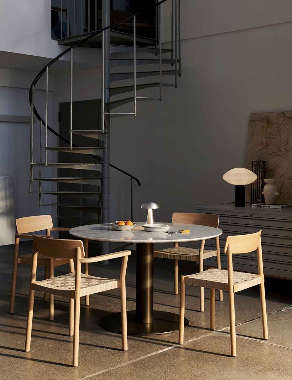 Diseñadas por Thau & Kallio para &Tradition, Betty comprende una serie de taburetes, sillas y bancos realizados en madera maciza con asientos palmeados en lino natural.