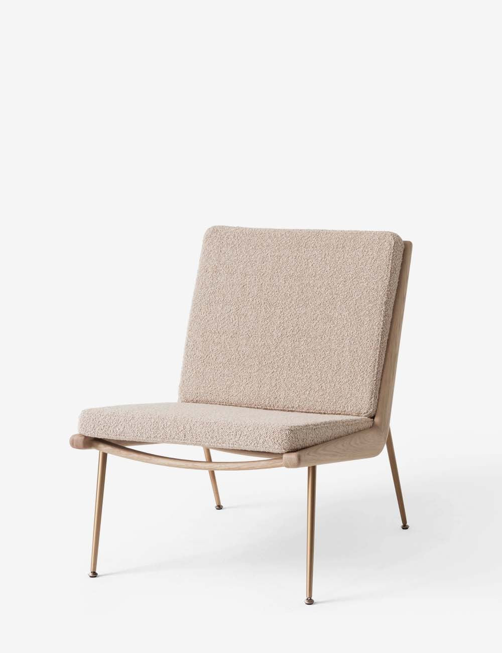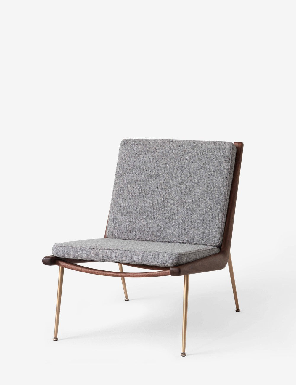 Diseño puro y sencillo donde el marco de madera pulido manualmente, y sus ligeras patas y detalles de latón en la parte trasera del respaldo hacen de Boomerang una butaca extremadamente confortable y elegante.