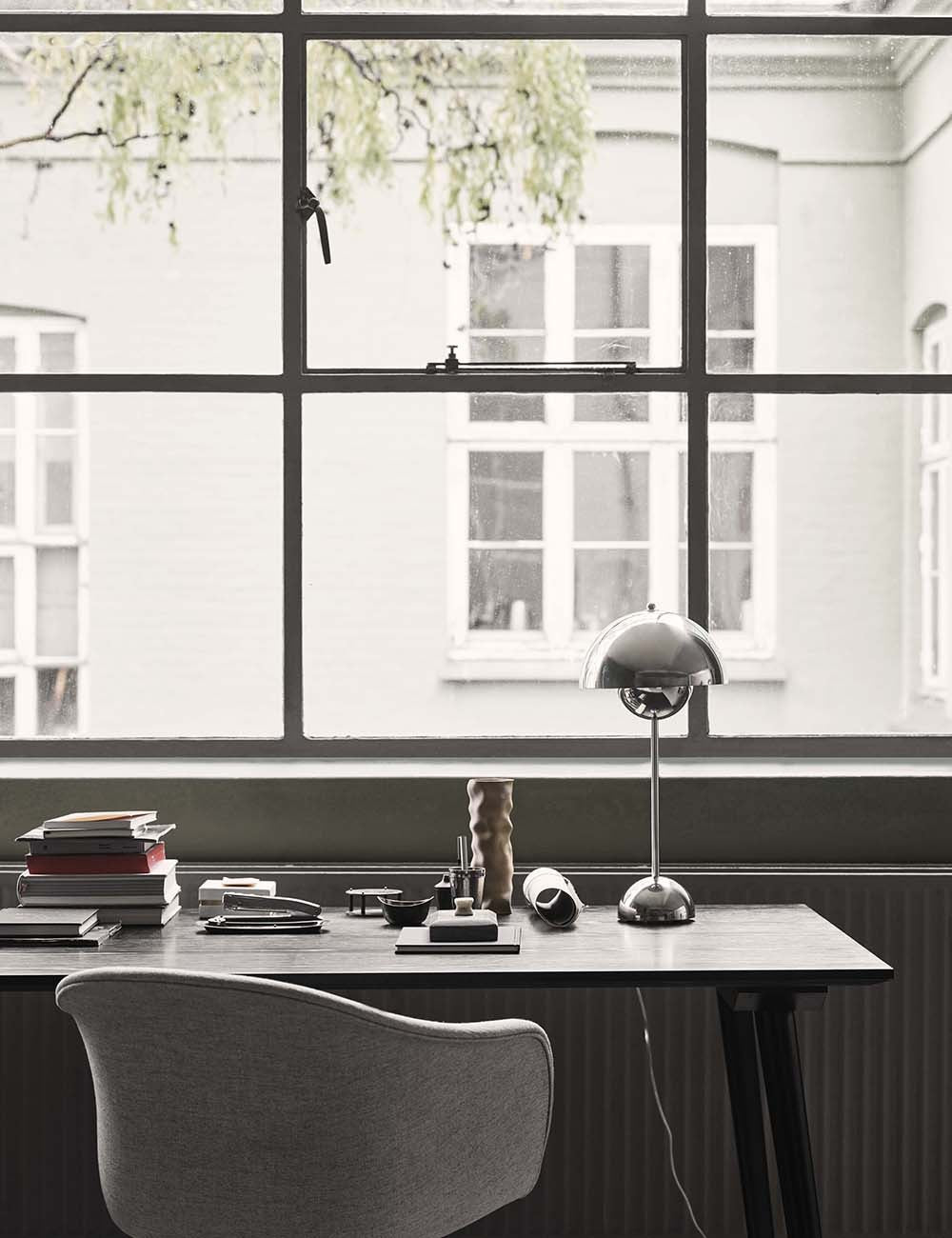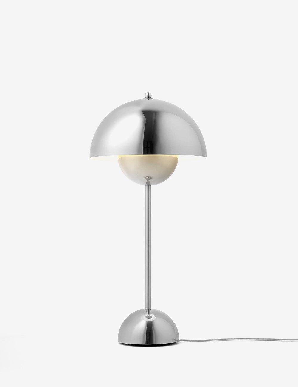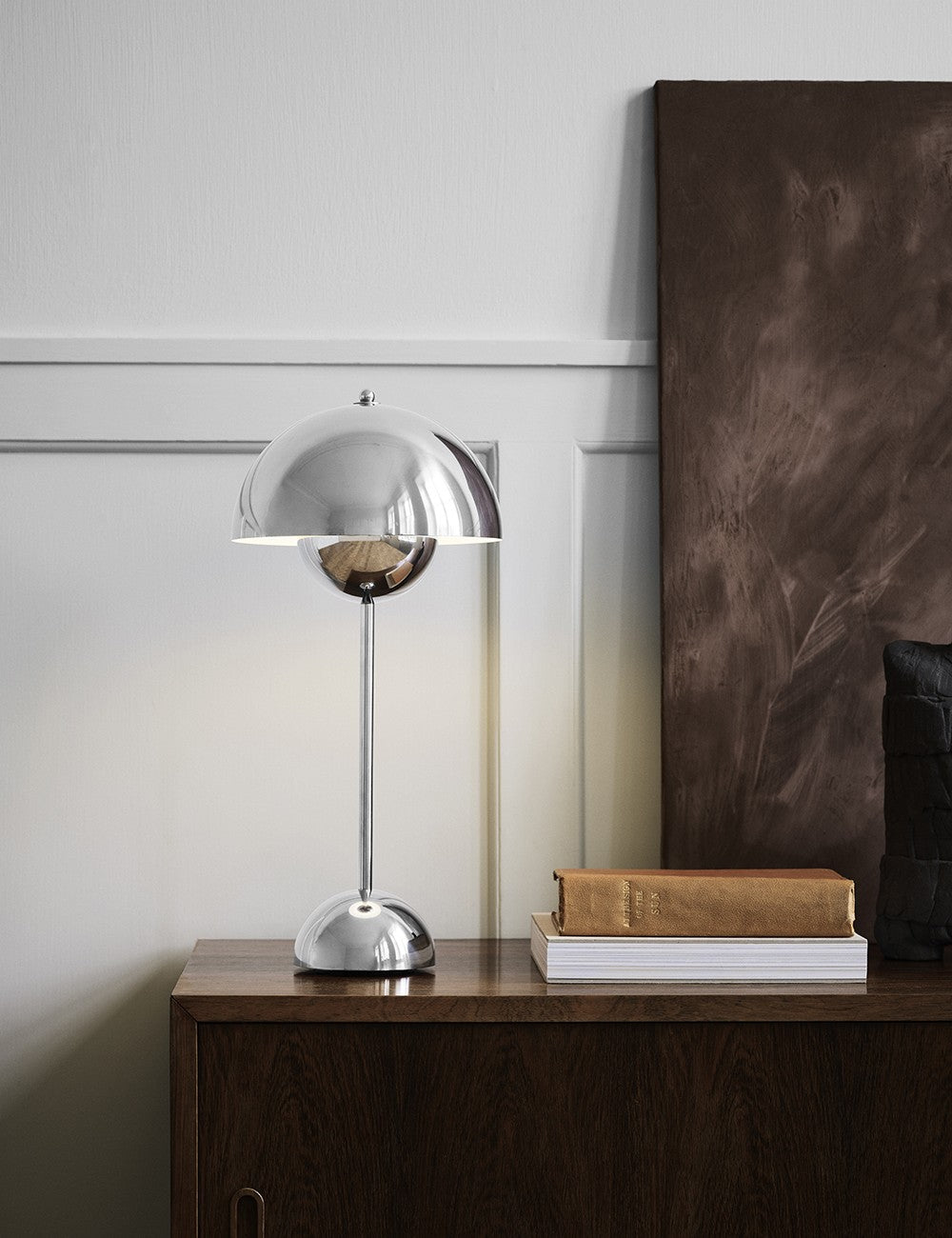 Flowerpot VP3 con diseño original en 1969 por Verner Panton, es una lámpara de mesa donde dos pantallas posicionadas paralelamente reflejan de la una a la otra la fuente de luz, consiguiendo así una iluminación difusa.