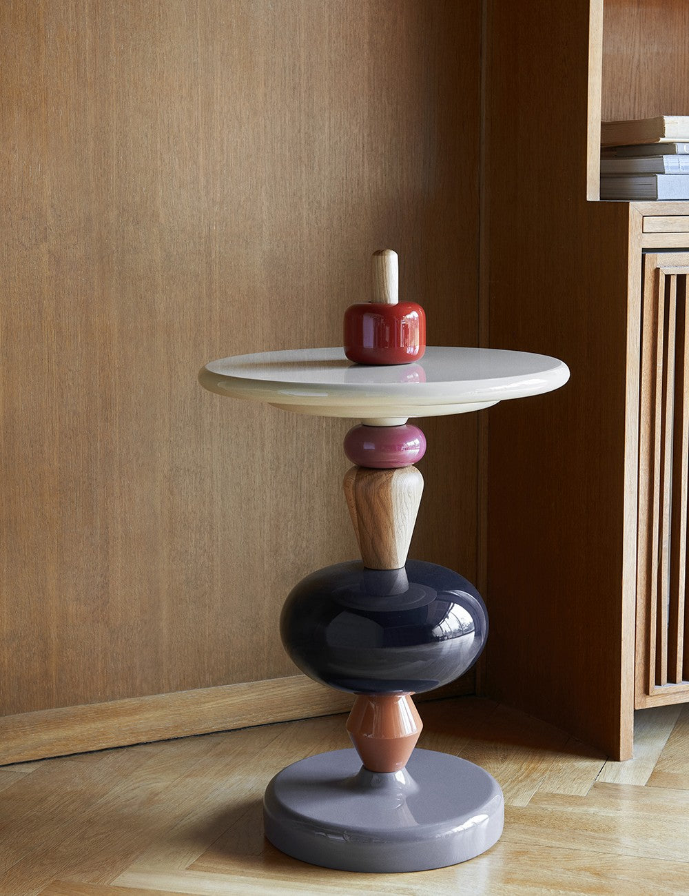 El conjunto de las diferentes piezas de colores están lacadas en alto brillo, a excepción del poste central y una pieza cónica de madera teñida, esto proporciona una aspecto sofisticado además de hacer la mesa extra duradera y resistente.