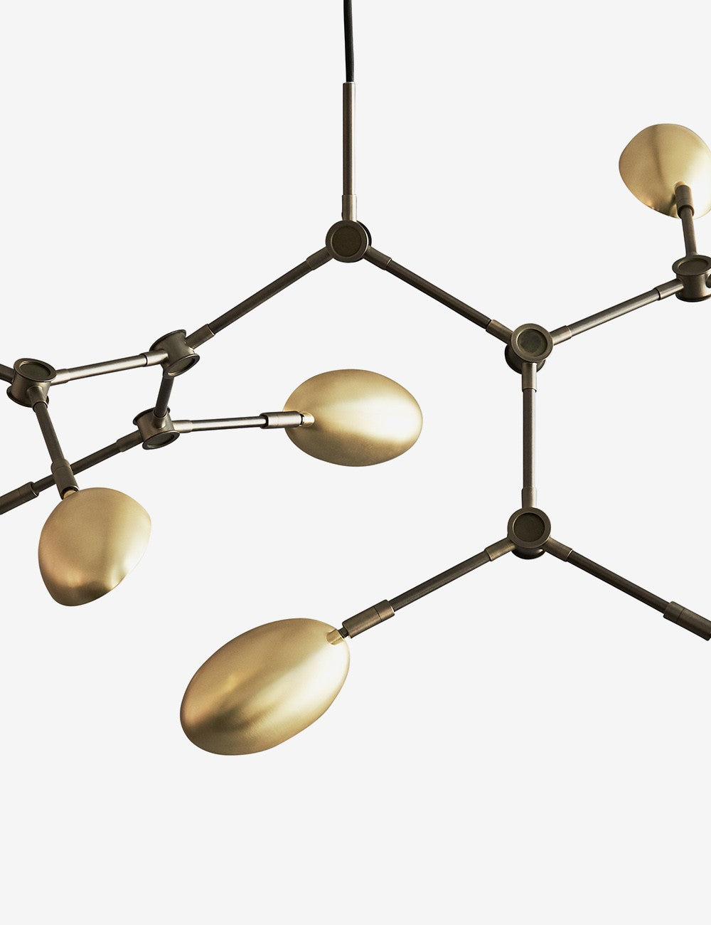 O design do Drop é composto por 14 braços flexíveis e 8 abajures levemente curvos, resultando em uma luminária escultural e funcional.