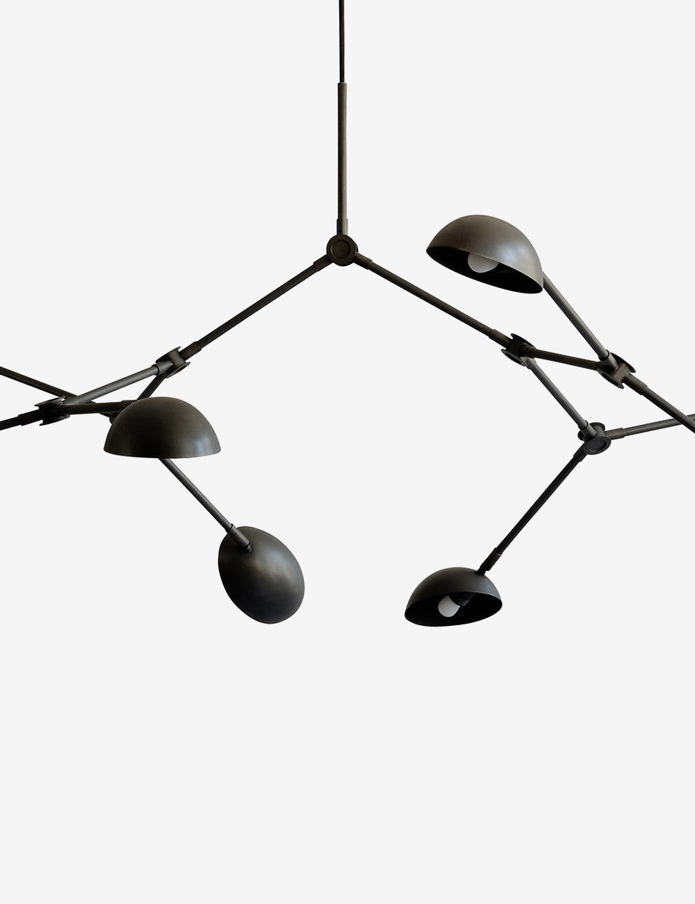 O design do Drop é composto por 14 braços flexíveis e 8 abajures levemente curvos, resultando em uma luminária escultural e funcional.