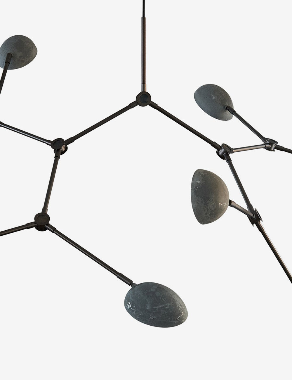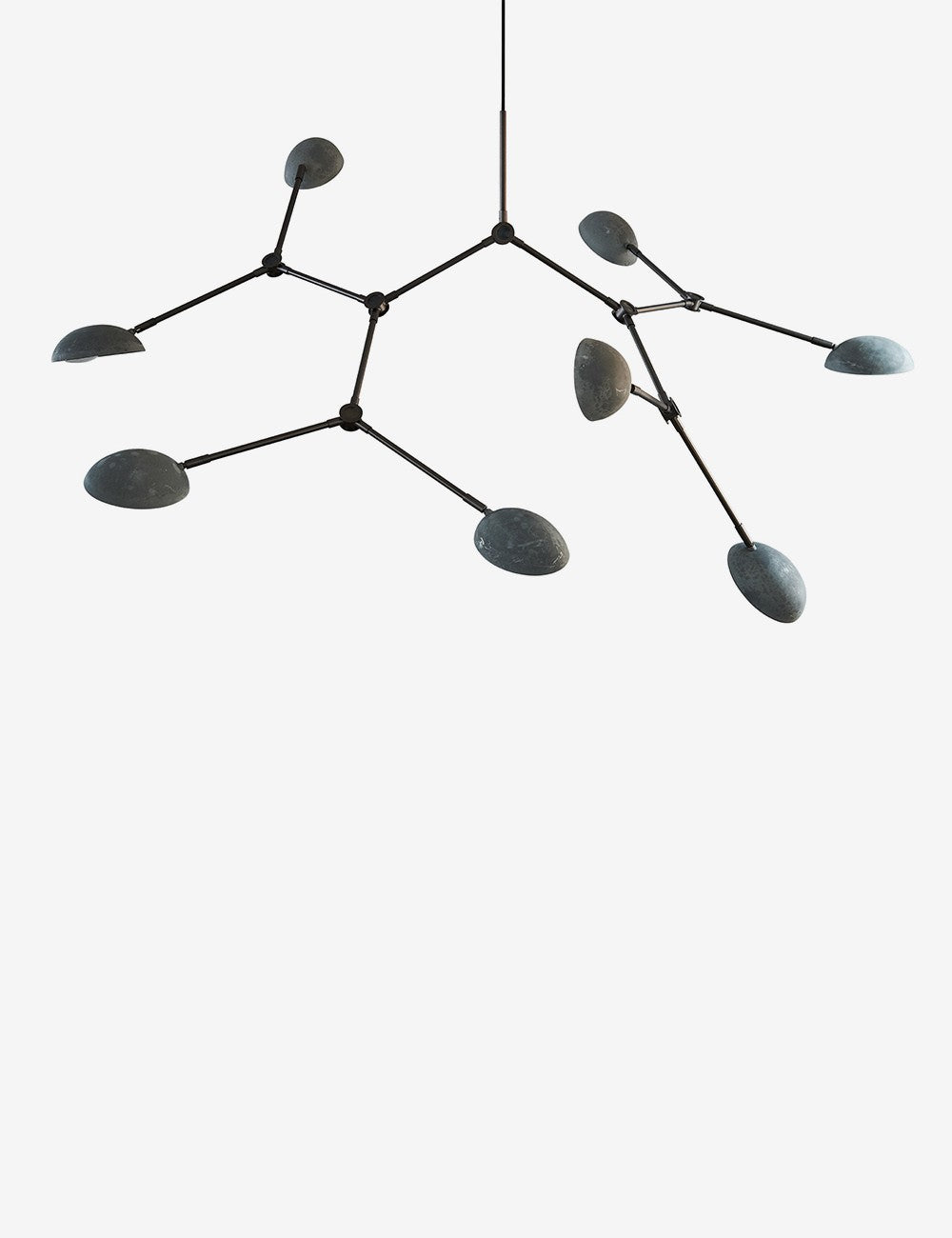 O design do Drop é composto por 14 braços flexíveis e 8 abajures levemente curvos, resultando em uma luminária escultural e funcional.