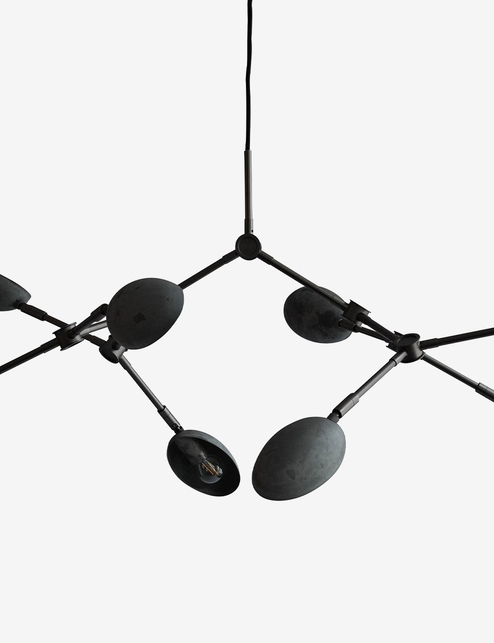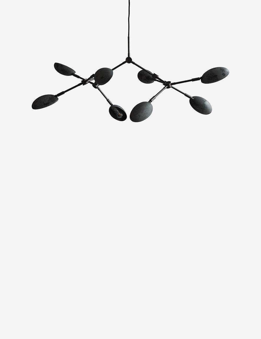 O design do Drop é composto por 14 braços flexíveis e 8 abajures levemente curvos, resultando em uma luminária escultural e funcional.