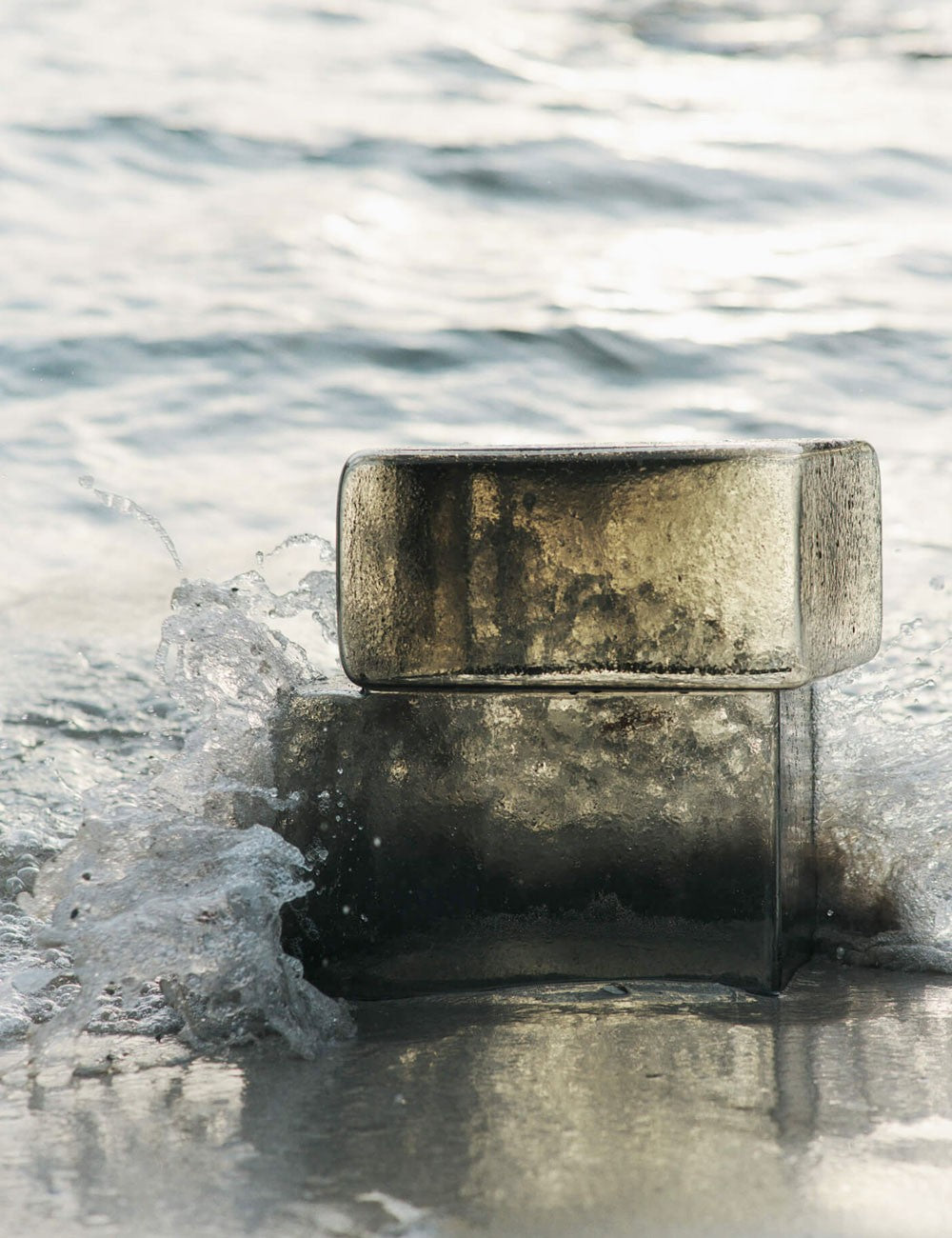 Feita de vidro soprado reciclado e fabricada com um molde de tijolo.