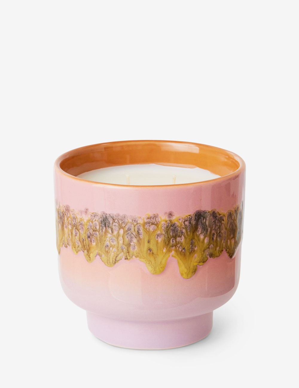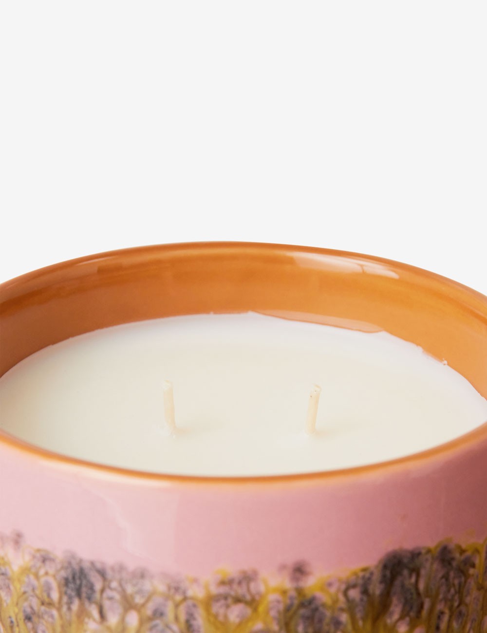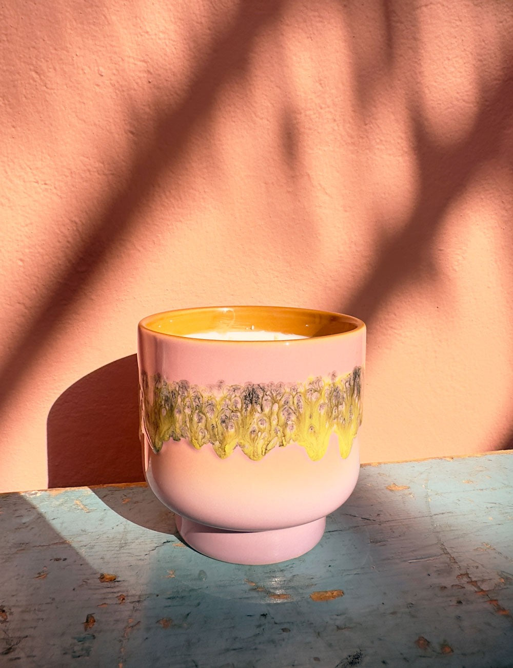 Esta vela colorida e perfumada é feita de uma mistura de cera vegetal, de soja e tradicional com um pavio de algodão e é apresentada num recipiente de cerâmica de estilo retro.