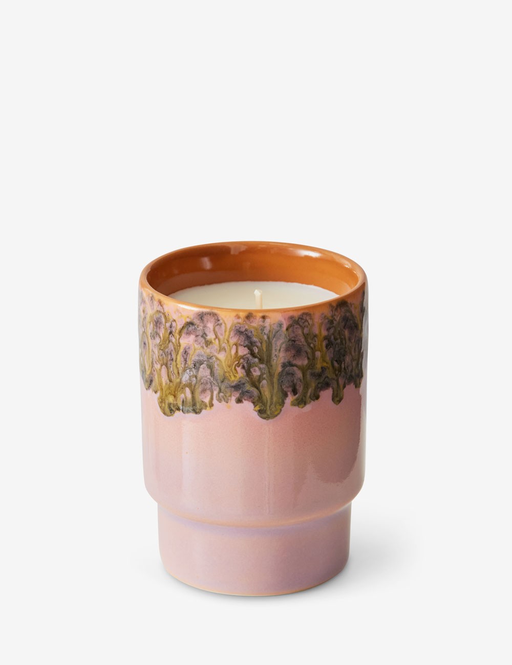 Esta vela colorida e perfumada é feita de uma mistura de cera vegetal, de soja e tradicional com um pavio de algodão e é apresentada num recipiente de cerâmica de estilo retro.
