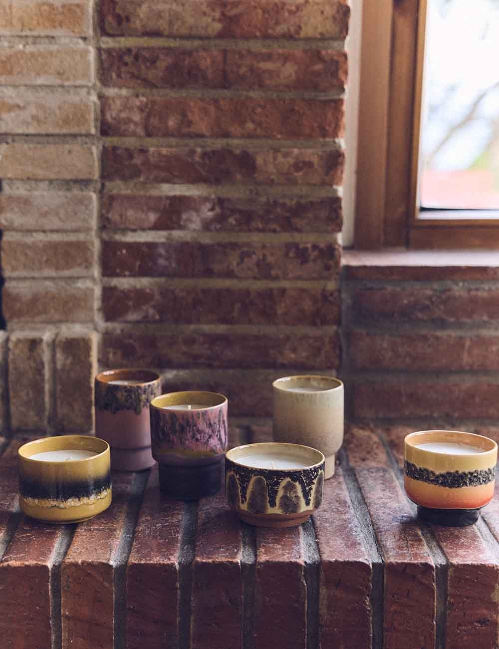 Esta vela colorida e perfumada é feita de uma mistura de cera vegetal, de soja e tradicional com um pavio de algodão e é apresentada num recipiente de cerâmica de estilo retro.