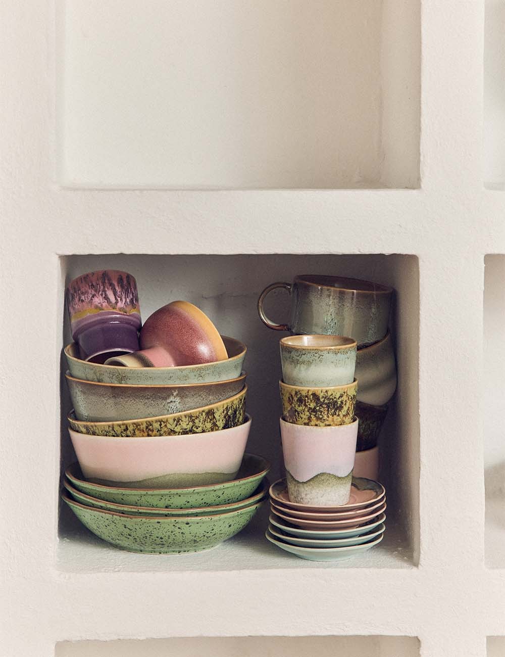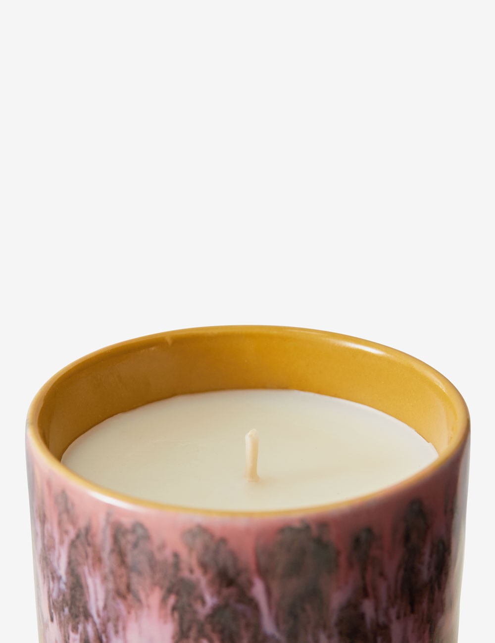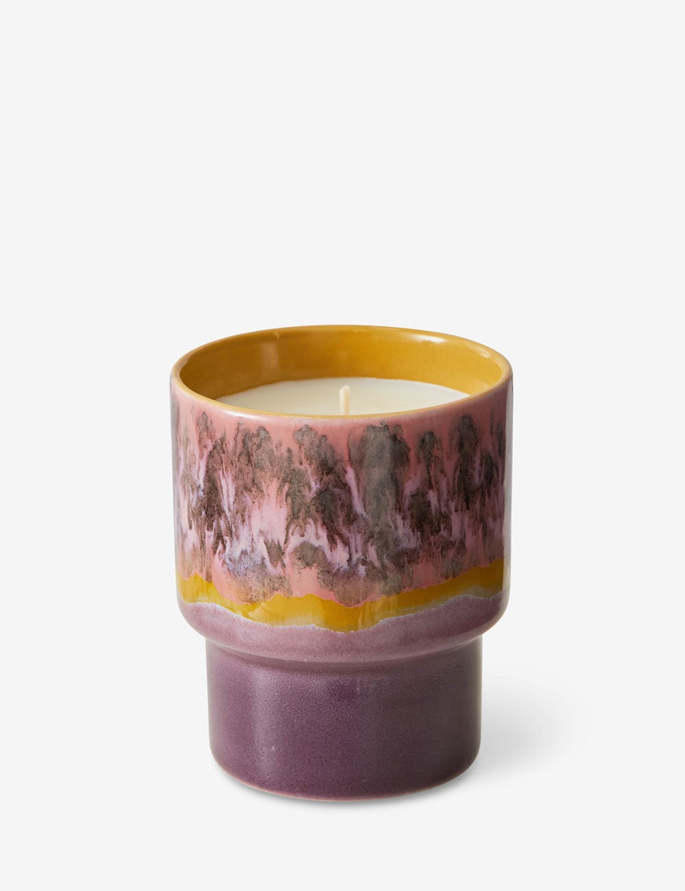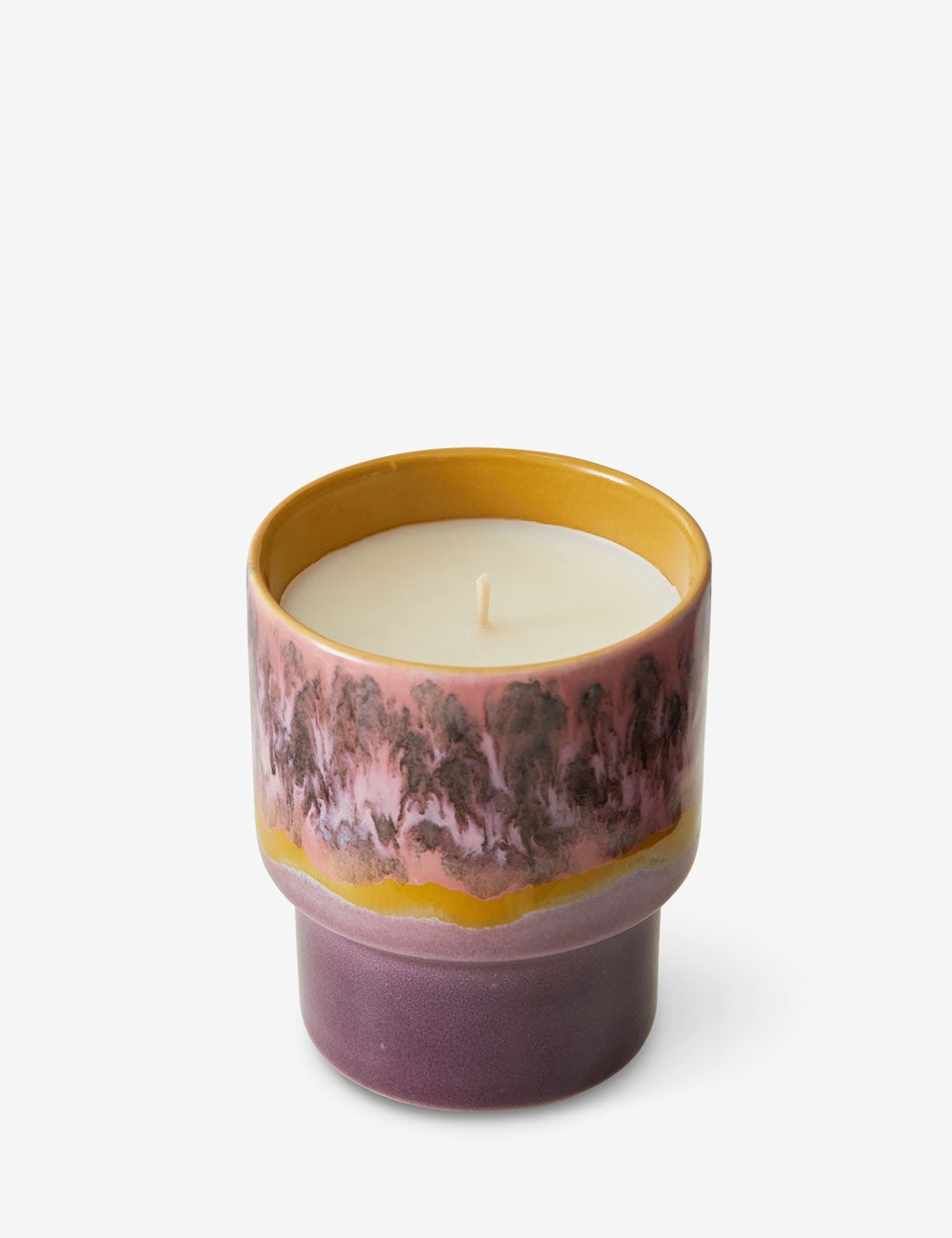 Esta vela colorida e perfumada é feita de uma mistura de cera vegetal, de soja e tradicional com um pavio de algodão e é apresentada num recipiente de cerâmica de estilo retro.