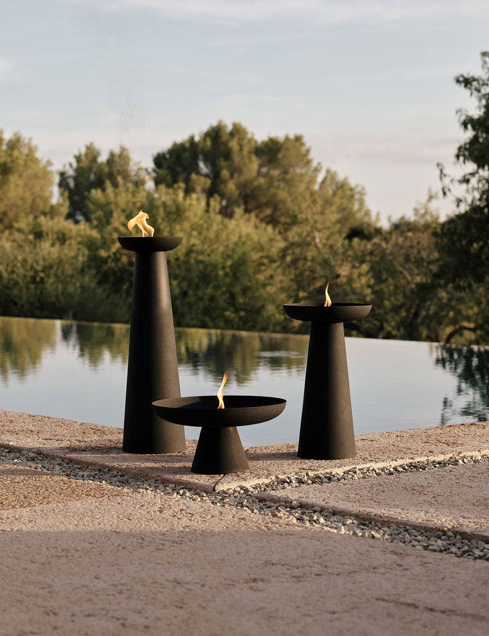 O design da Meira é composto por uma câmara de óleo recarregável e um pavio que proporciona uma chama ampla, resultando em uma tocha a óleo de estilo aconchegante, perfeita para uso tanto em terraços quanto em jardins.