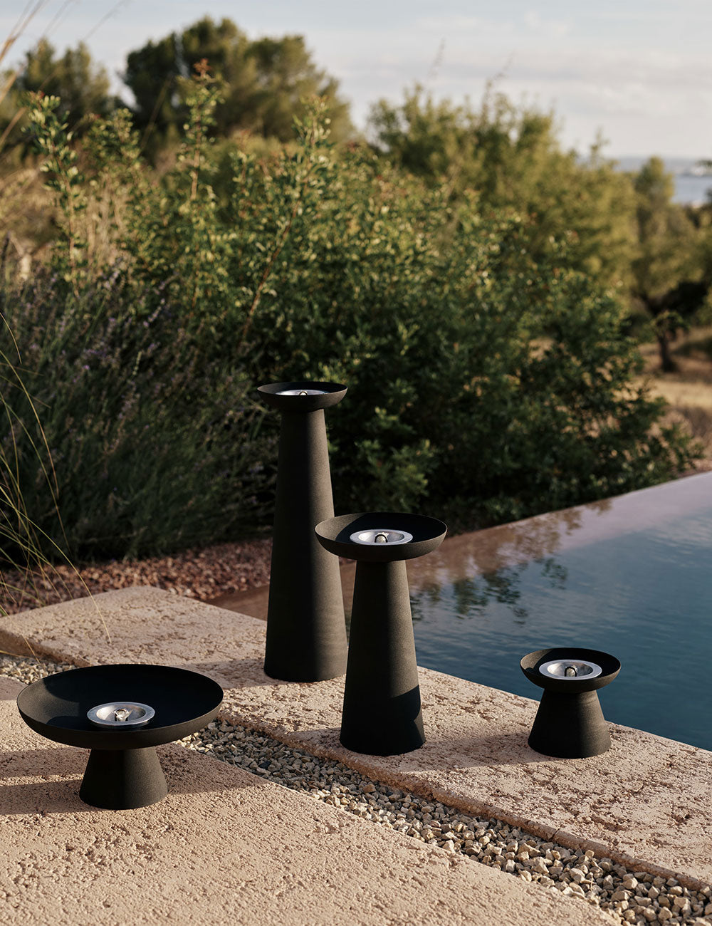 O design da Meira é composto por uma câmara de óleo recarregável e um pavio que proporciona uma chama ampla, resultando em uma tocha a óleo de estilo aconchegante, perfeita para uso tanto em terraços quanto em jardins.