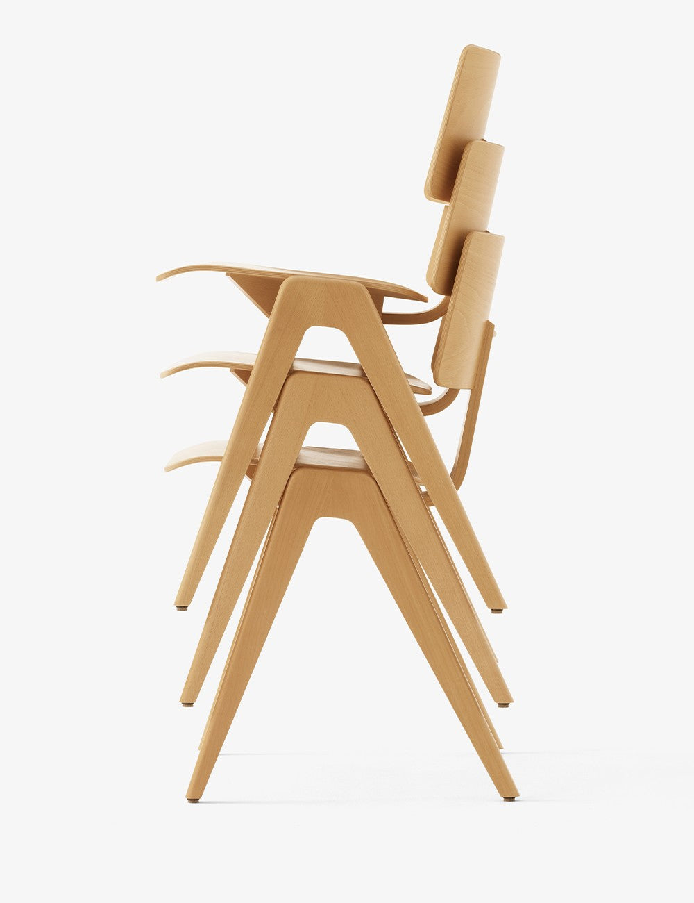 A Daystak, desenhada por Robin Day em 1951, foi criada tendo em mente a possibilidade de empilhamento, resultando numa cadeira funcional com formas simples.