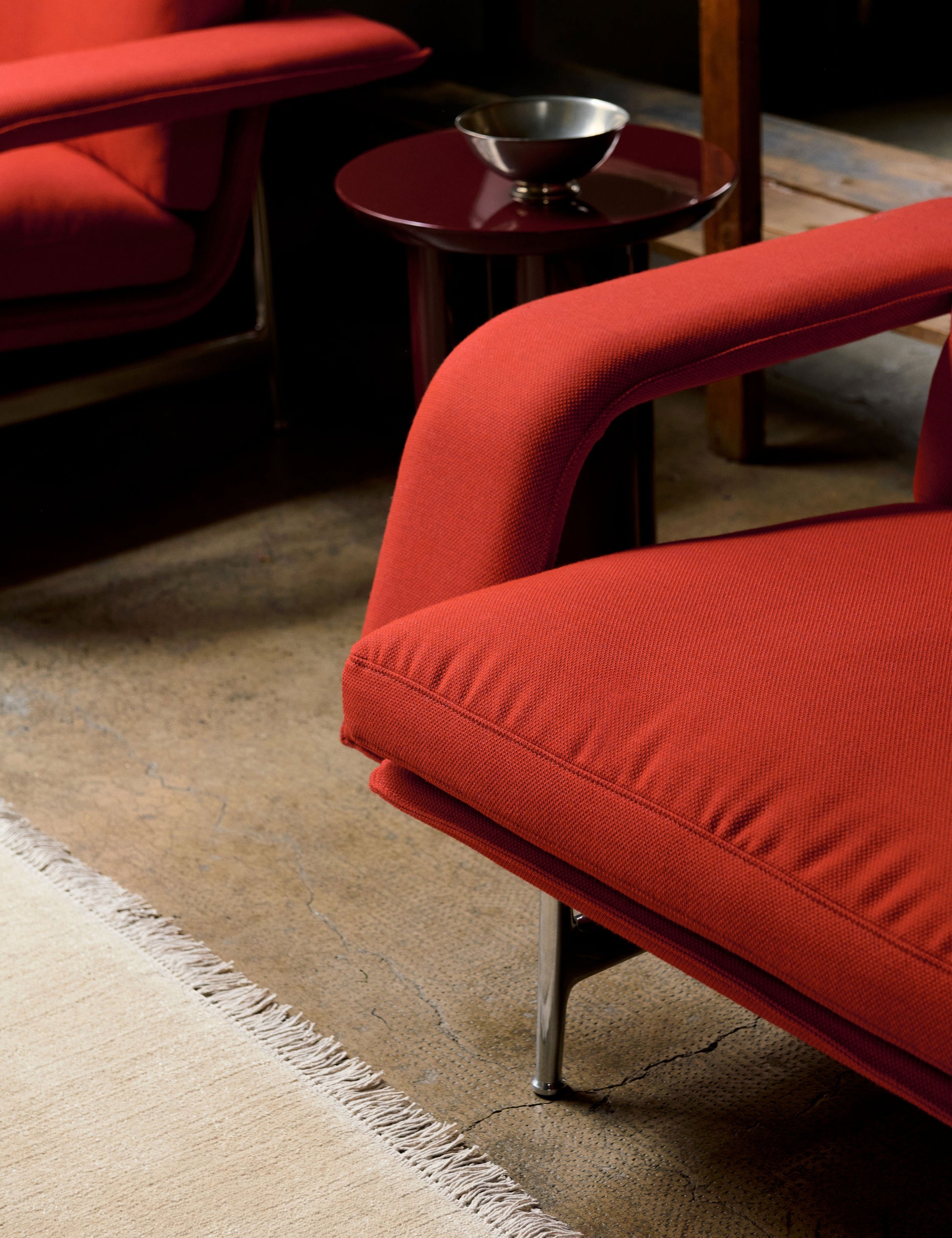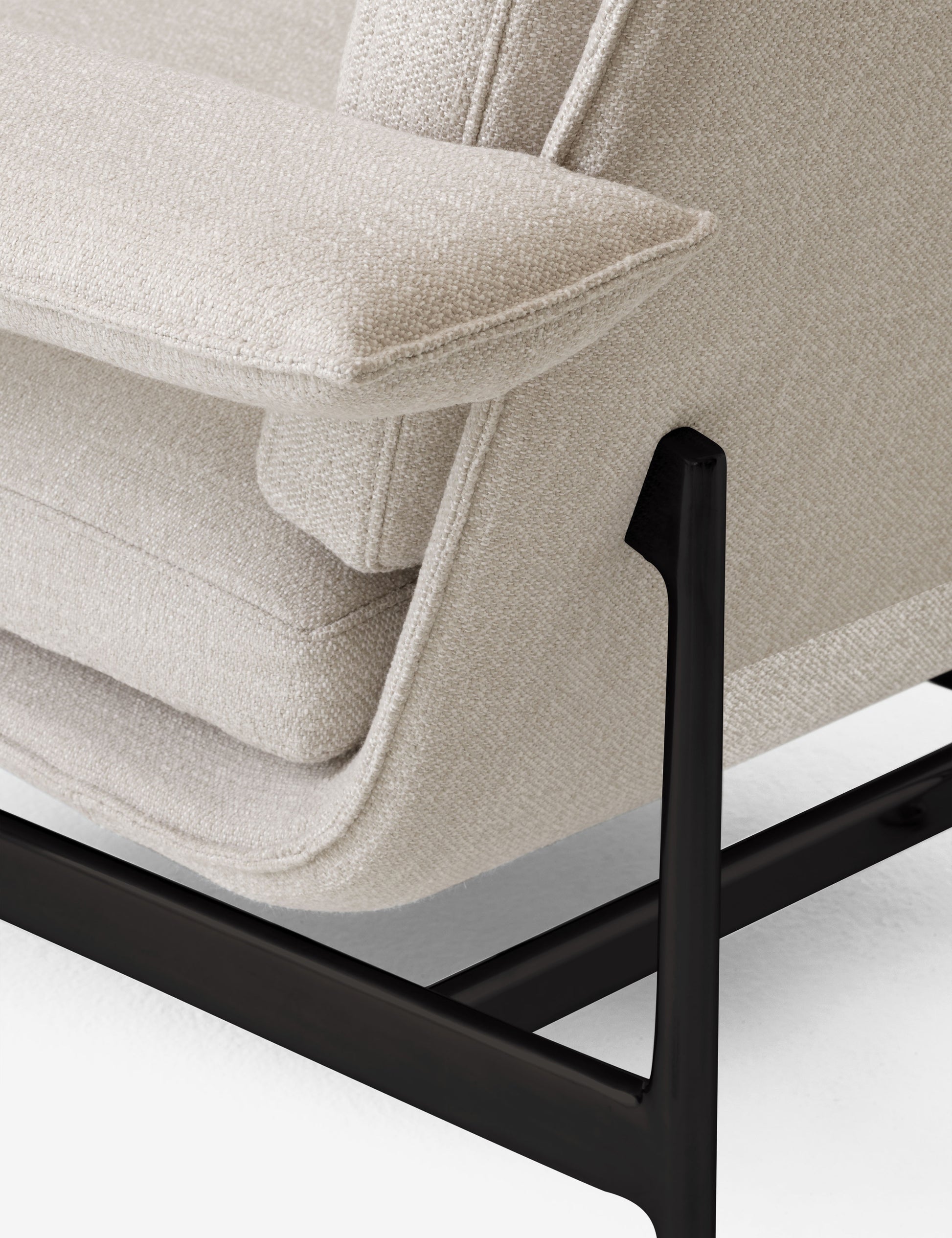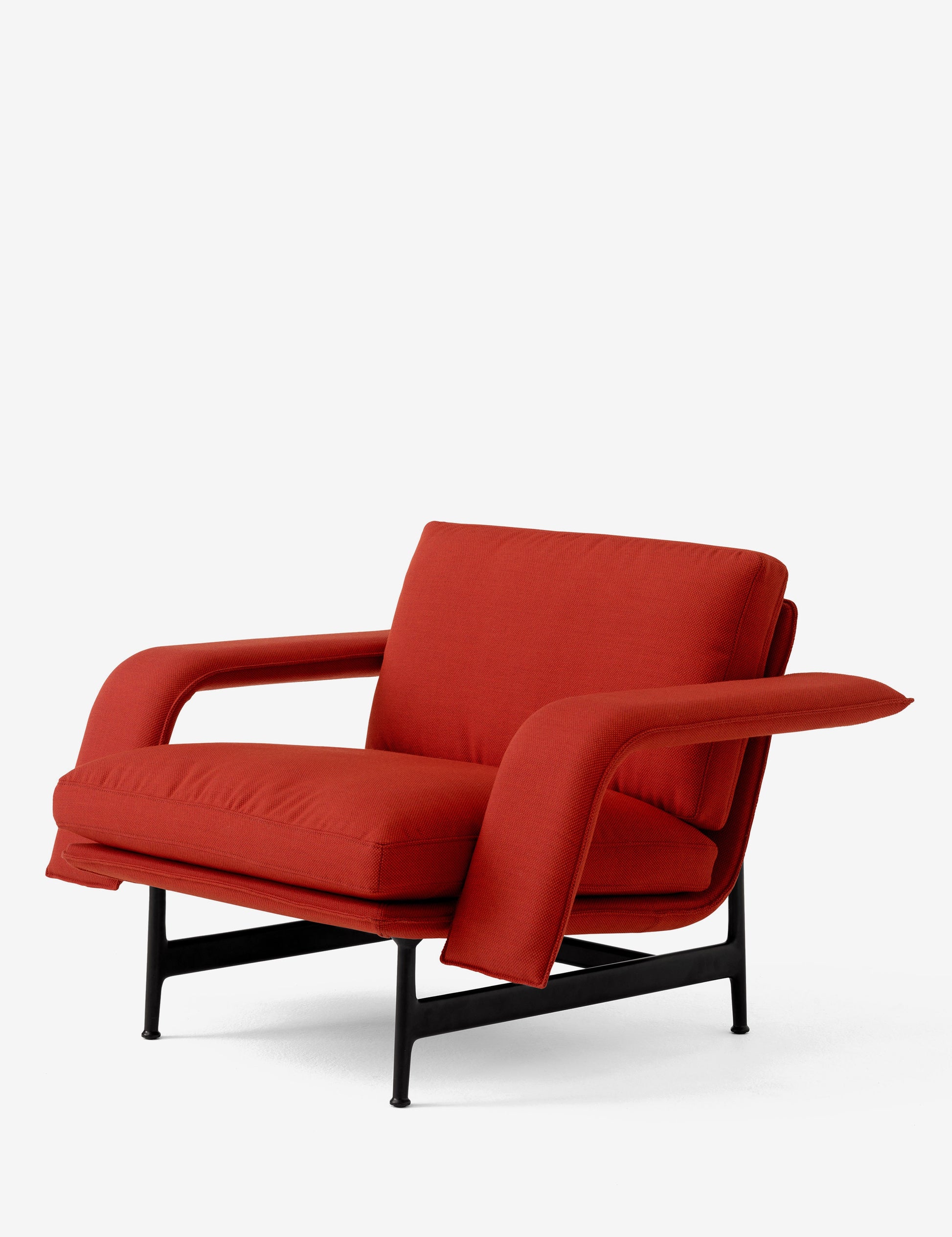 Composto por uma estrutura leve assente num berço de alumínio fundido, as almofadas soltas e finas são configuradas para apresentar um corpo de sofá sólido com linhas paralelas perpendiculares aos apoios de braços que se estendem para fora, a caraterística que define a coleção.