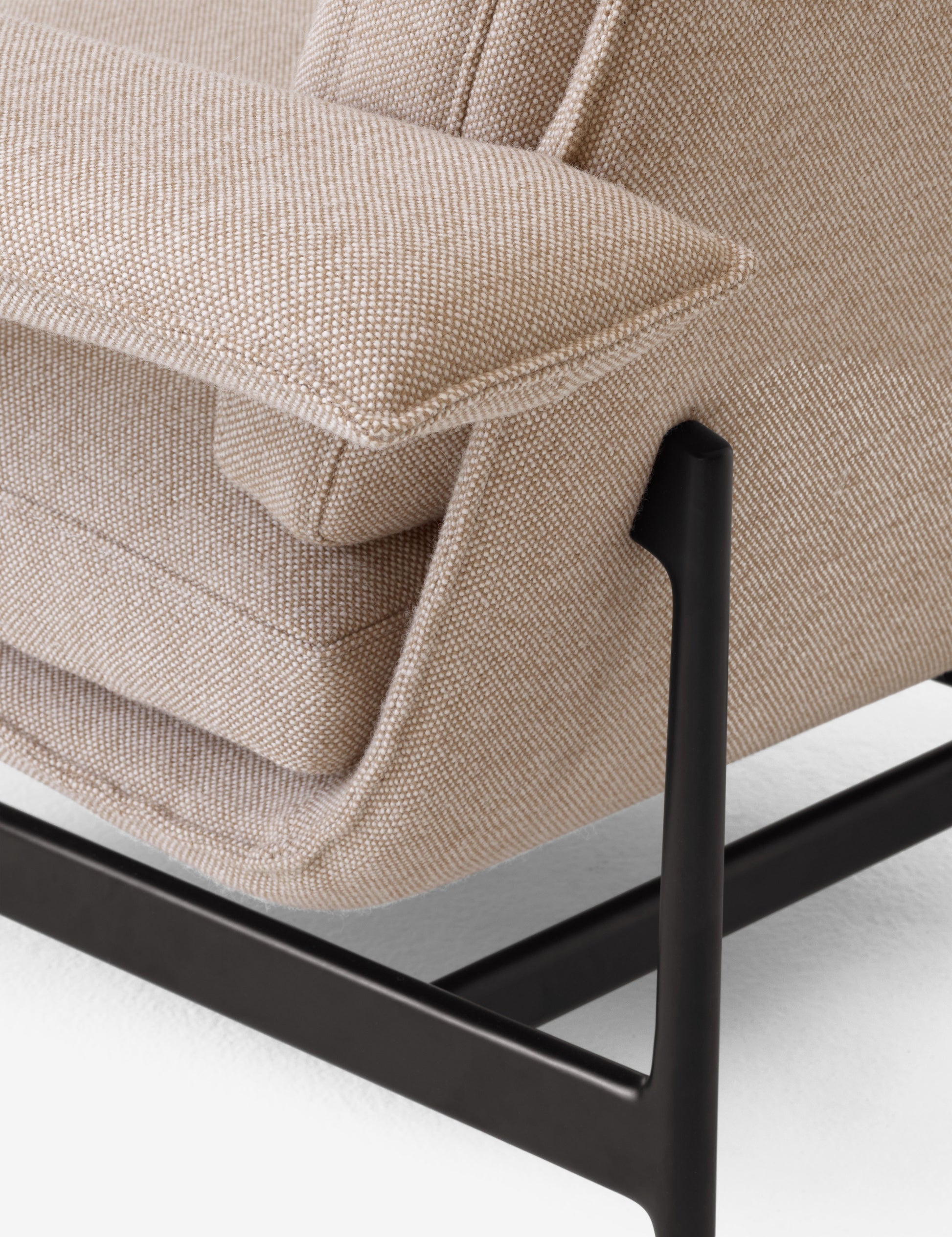Os materiais utilizados na coleção Meantime foram cuidadosamente selecionados para garantir a sua durabilidade. As pernas são em alumínio fundido, disponíveis em preto ou alumínio polido, enquanto os apoios de braços são em aço e a estrutura em madeira, o que proporciona uma base sólida para as almofadas macias.