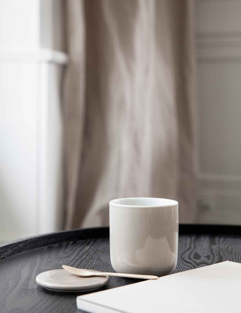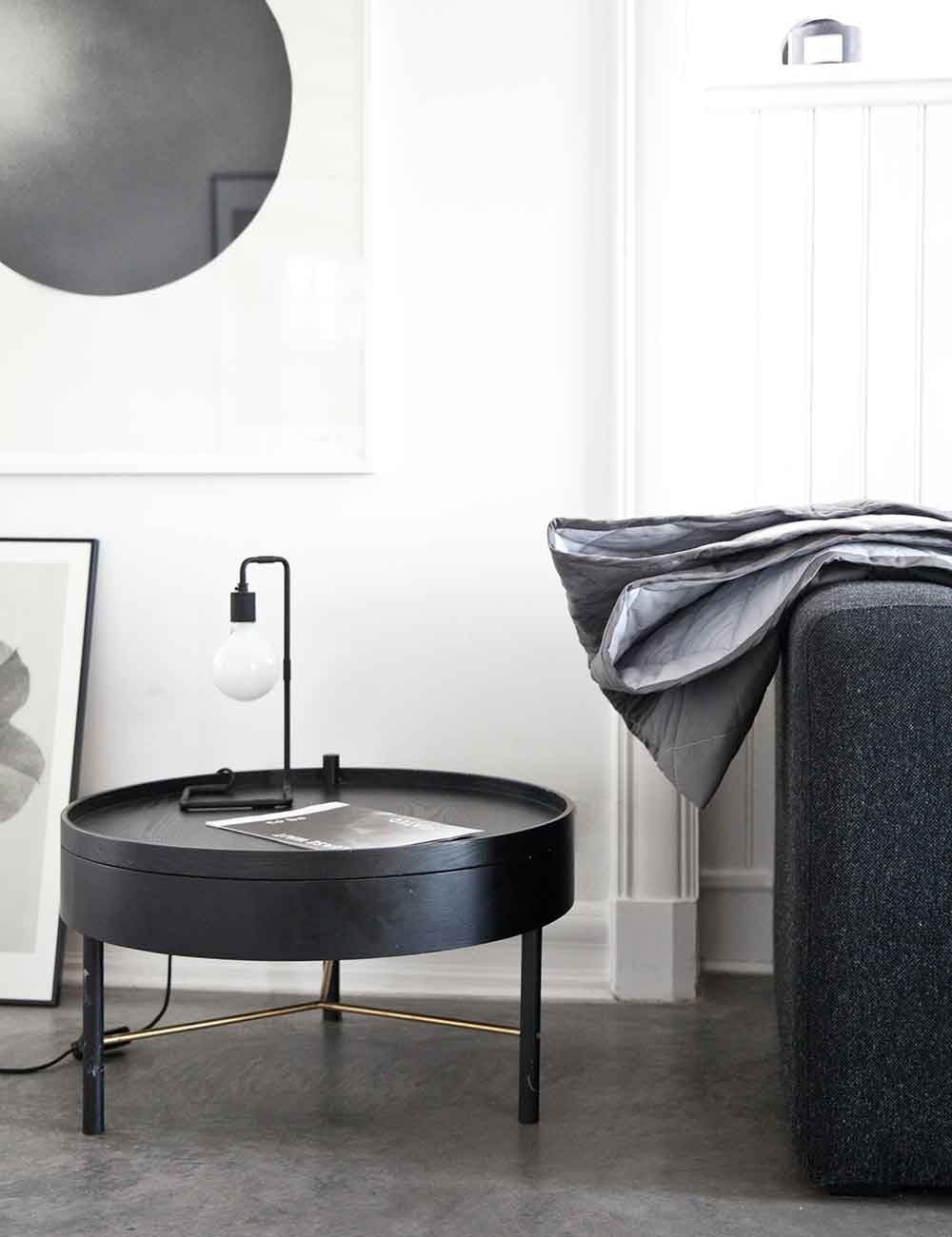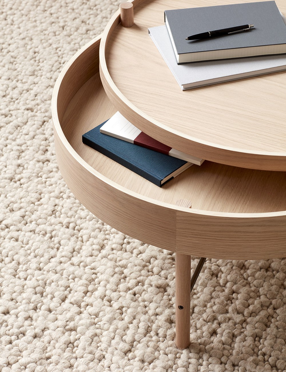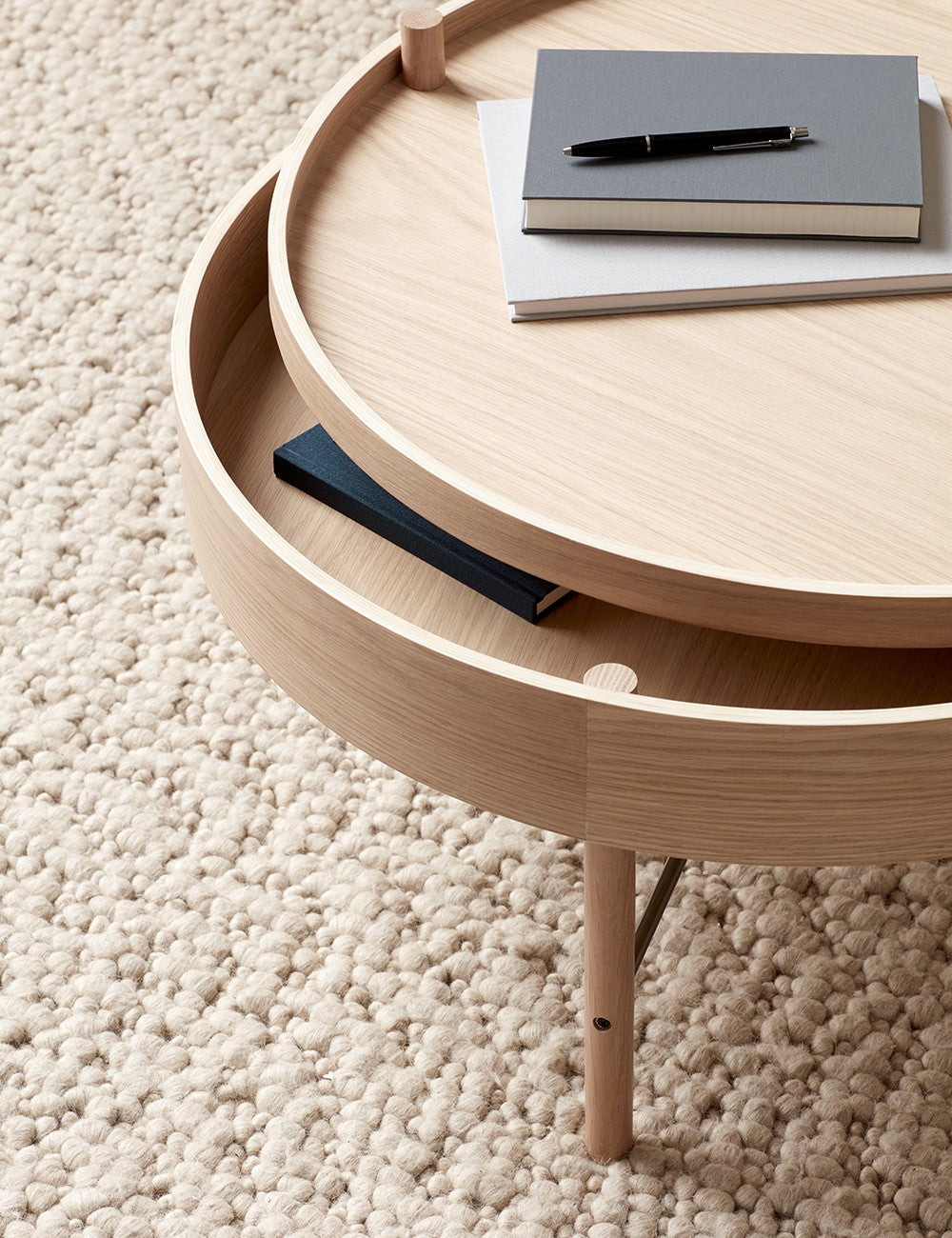 A designer alemã Theresa Rand estava a experimentar formas de combinar mesa e arrumação quando teve a ideia de uma tampa que se abre girando em torno de uma das pernas.