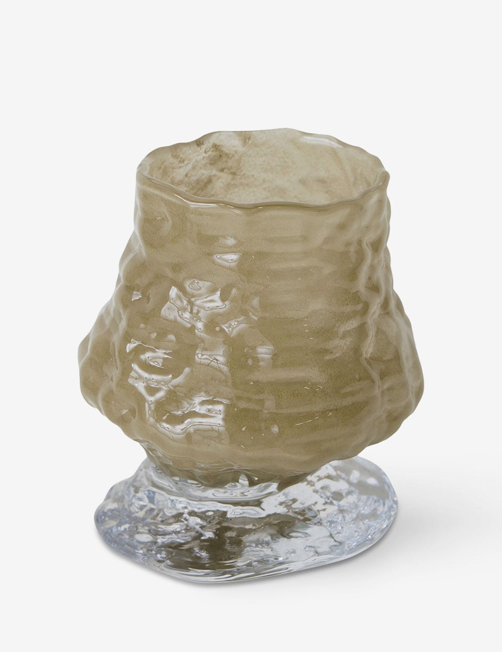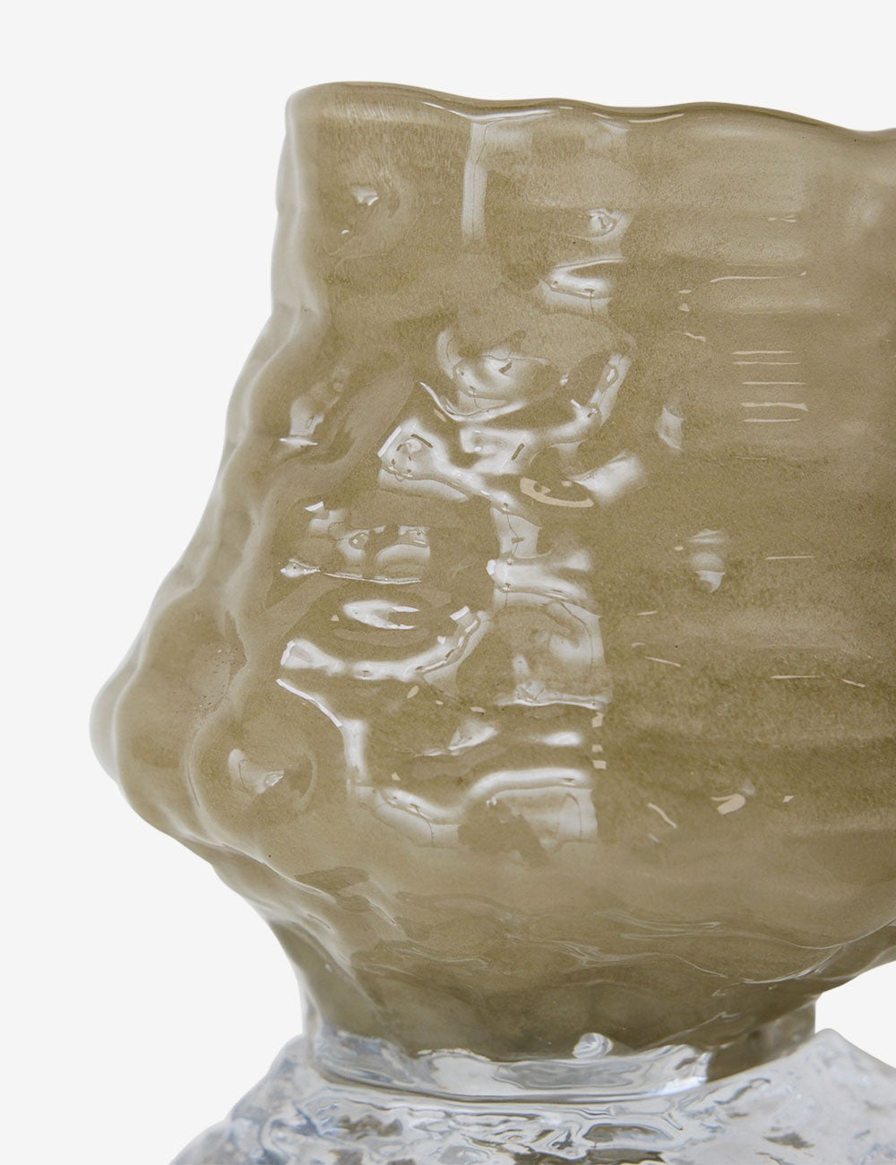 Mais objeto do que vaso, esta pequena peça de vidro destaca-se pela sua superfície texturizada e pela sua silhueta orgânica e imperfeita. Não foi concebida para flores, mas sim para dar personalidade: coloque-a numa estante, numa bandeja ou numa mesa de centro como um detalhe sutil com um toque artesanal. A sua presença discreta capta o olhar e acrescenta textura sem sobrecarregar o espaço.