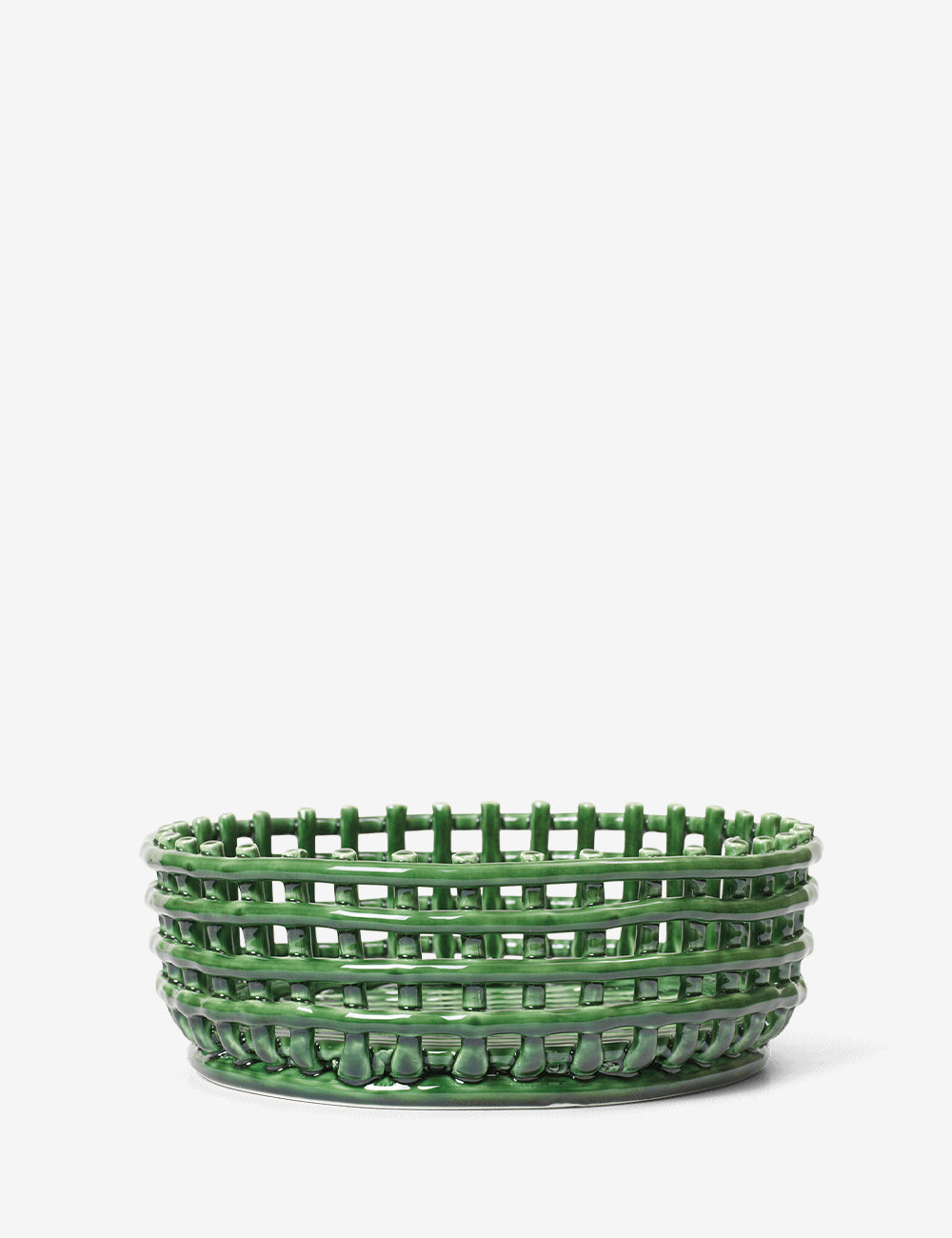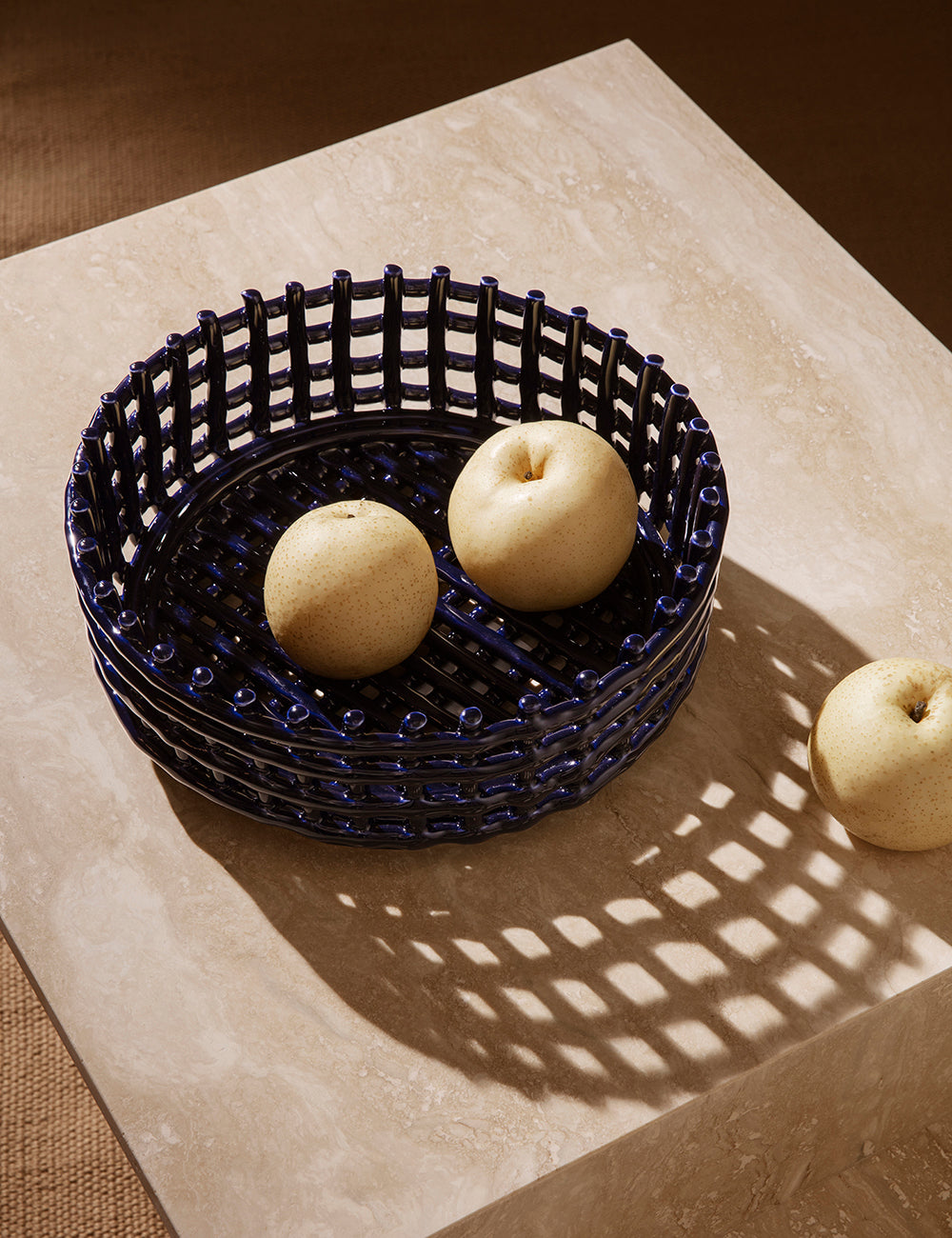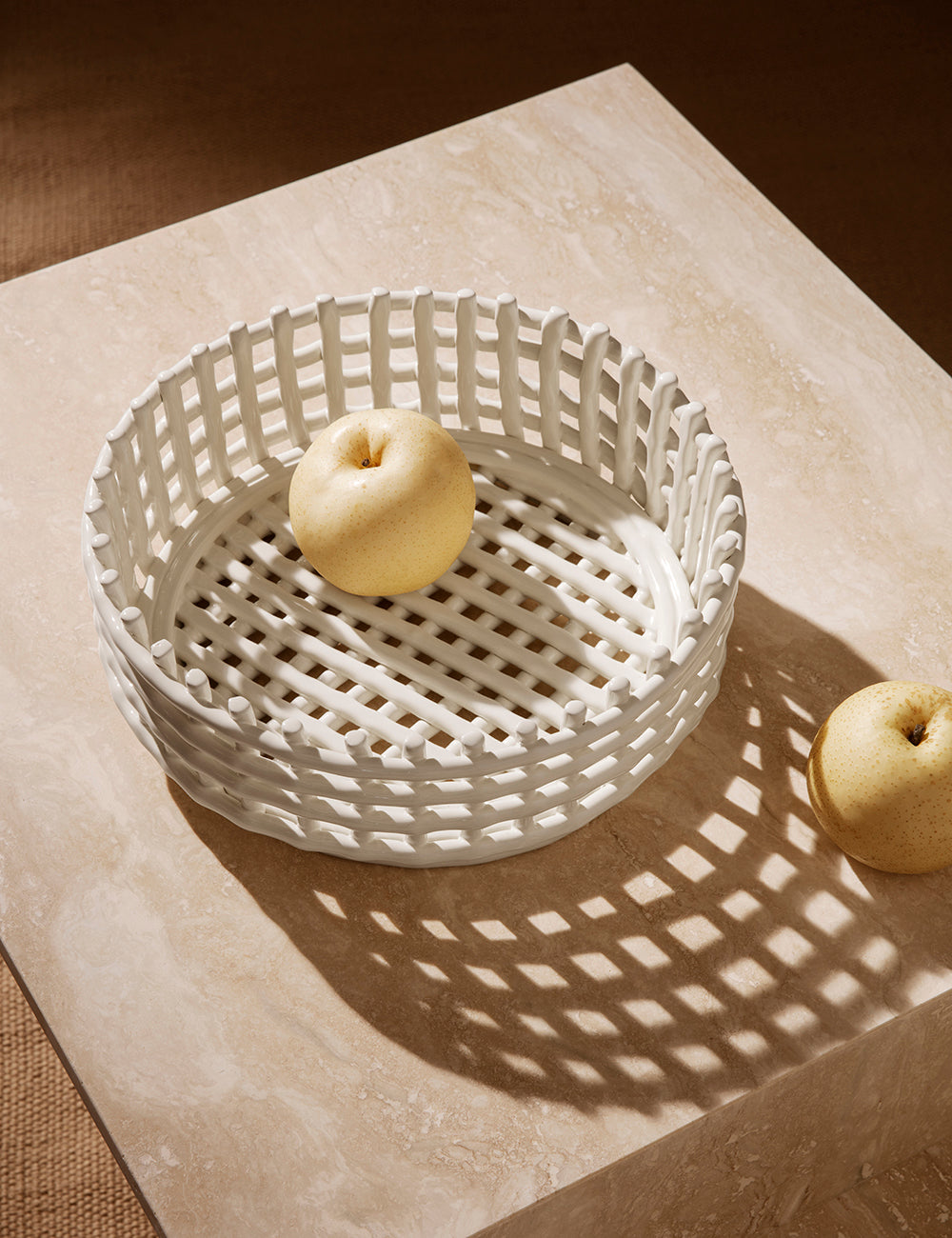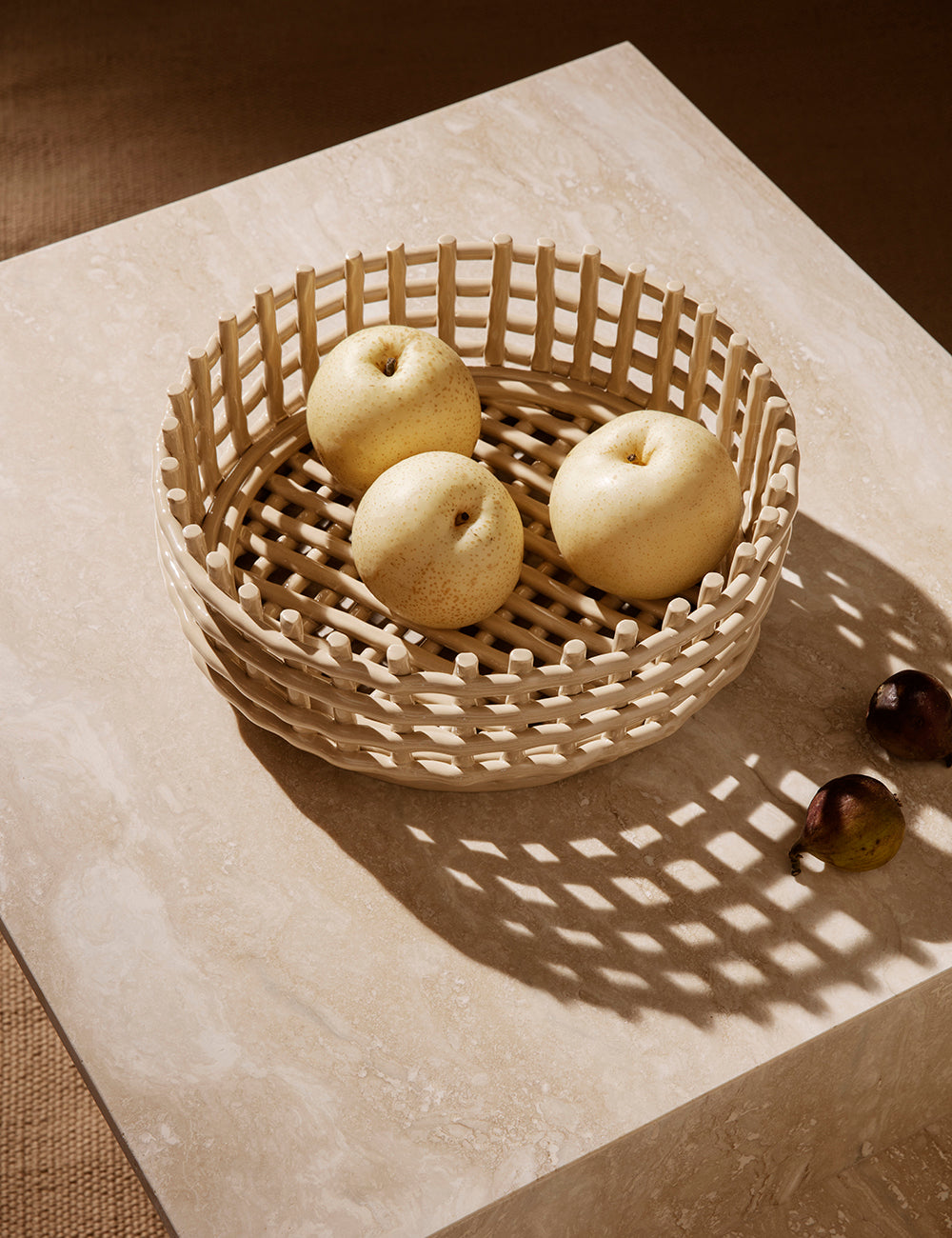 A coleção de cestos e centros de mesa em cerâmica transporta as técnicas tradicionais da cestaria para o mundo da cerâmica, recriando o aspeto e a sensação familiar dos recipientes tecidos.