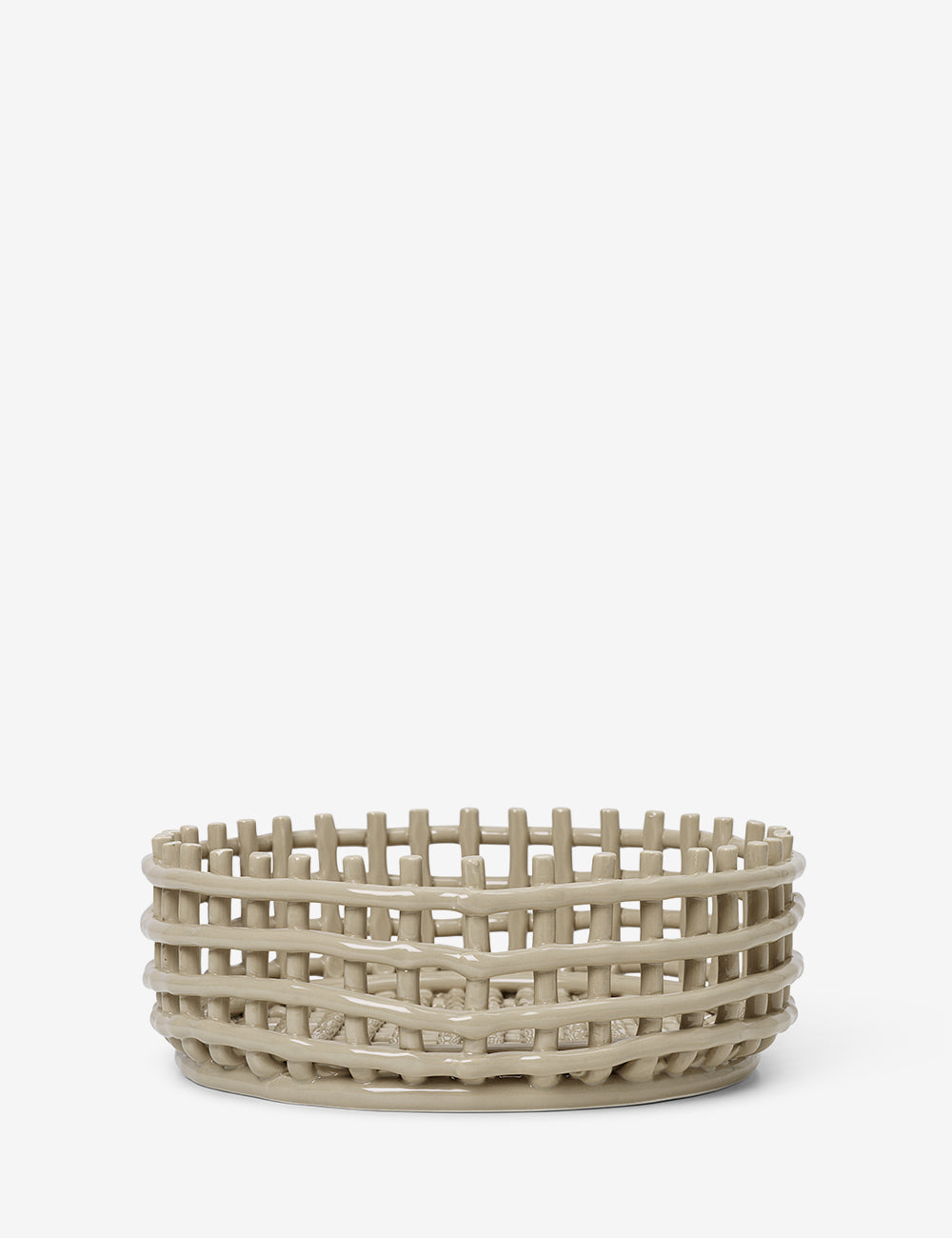 A coleção de cestos e centros de mesa em cerâmica transporta as técnicas tradicionais da cestaria para o mundo da cerâmica, recriando o aspeto e a sensação familiar dos recipientes tecidos.