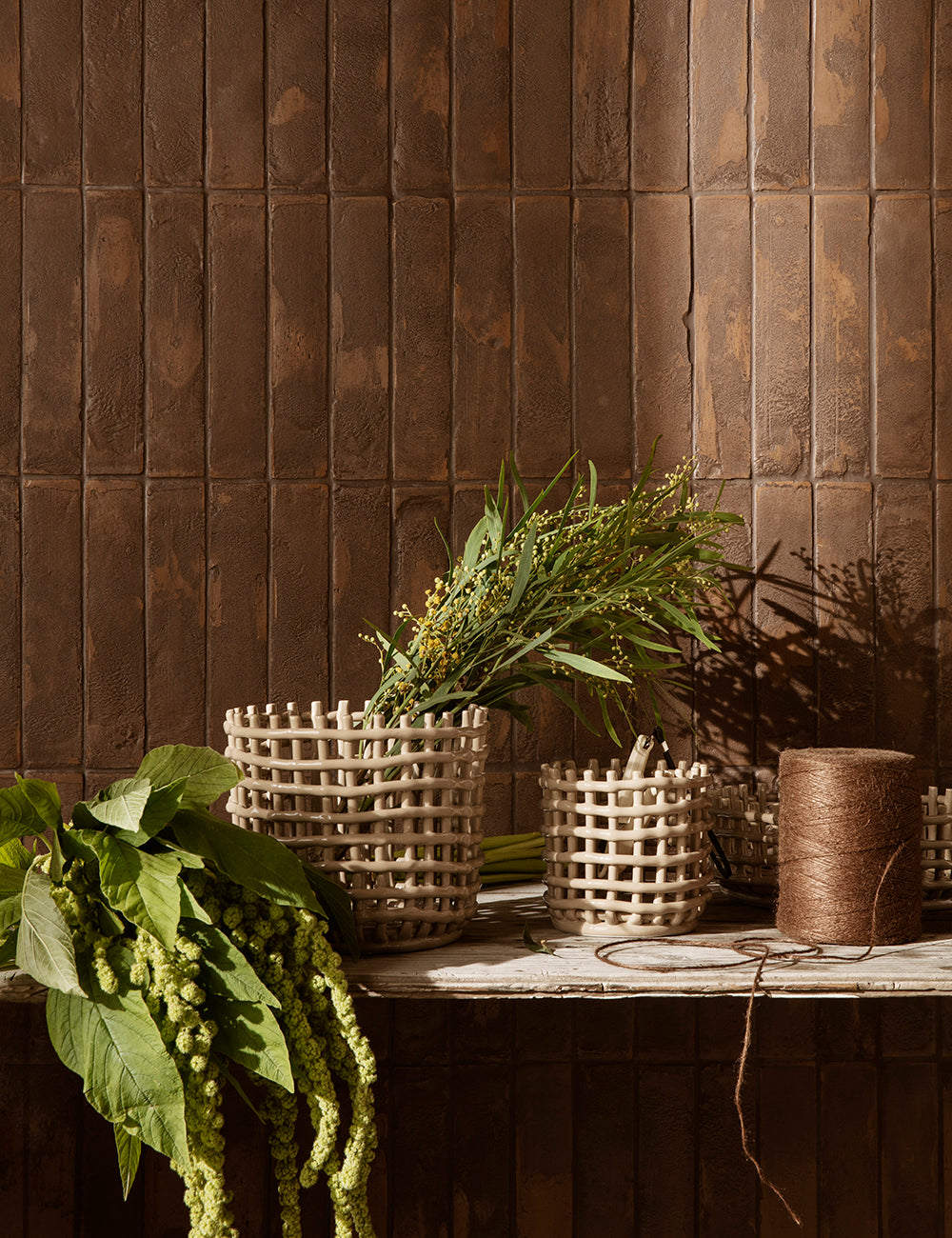 A coleção de cestos e centros de mesa em cerâmica transporta as técnicas tradicionais da cestaria para o mundo da cerâmica, recriando o aspeto e a sensação familiar dos recipientes tecidos.