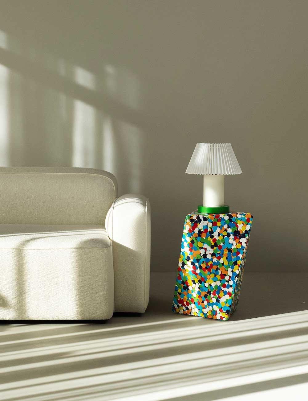 A mesa lateral Delta Proust, da Norman Copenhagen, une arte e responsabilidade material: feita de 98% de polietileno reciclado (PELD) e decorada com o padrão Proust de Alessandro Mendini. Cada peça possui um padrão único.