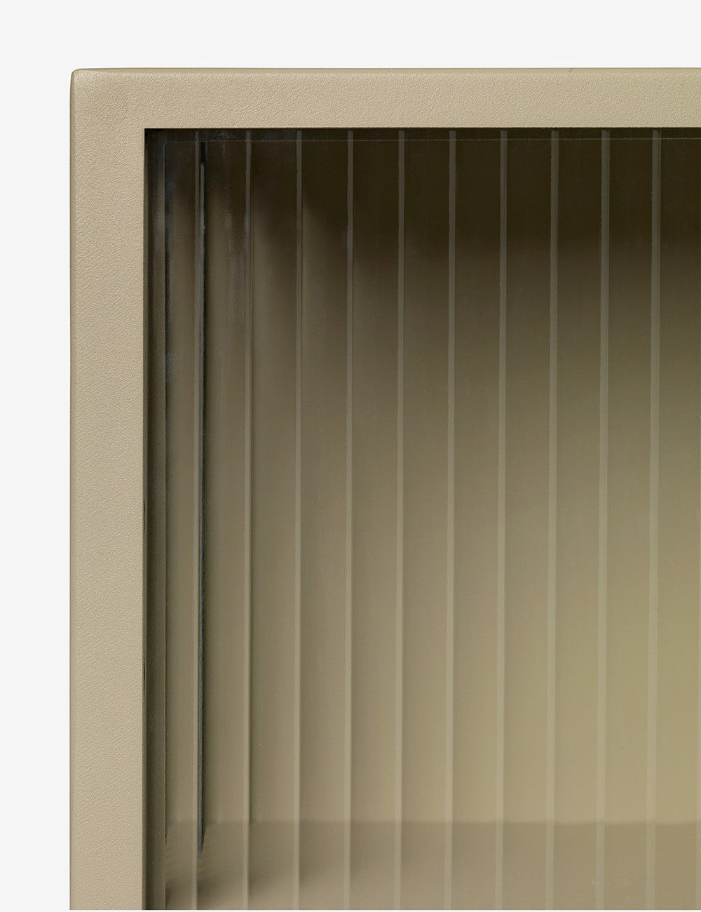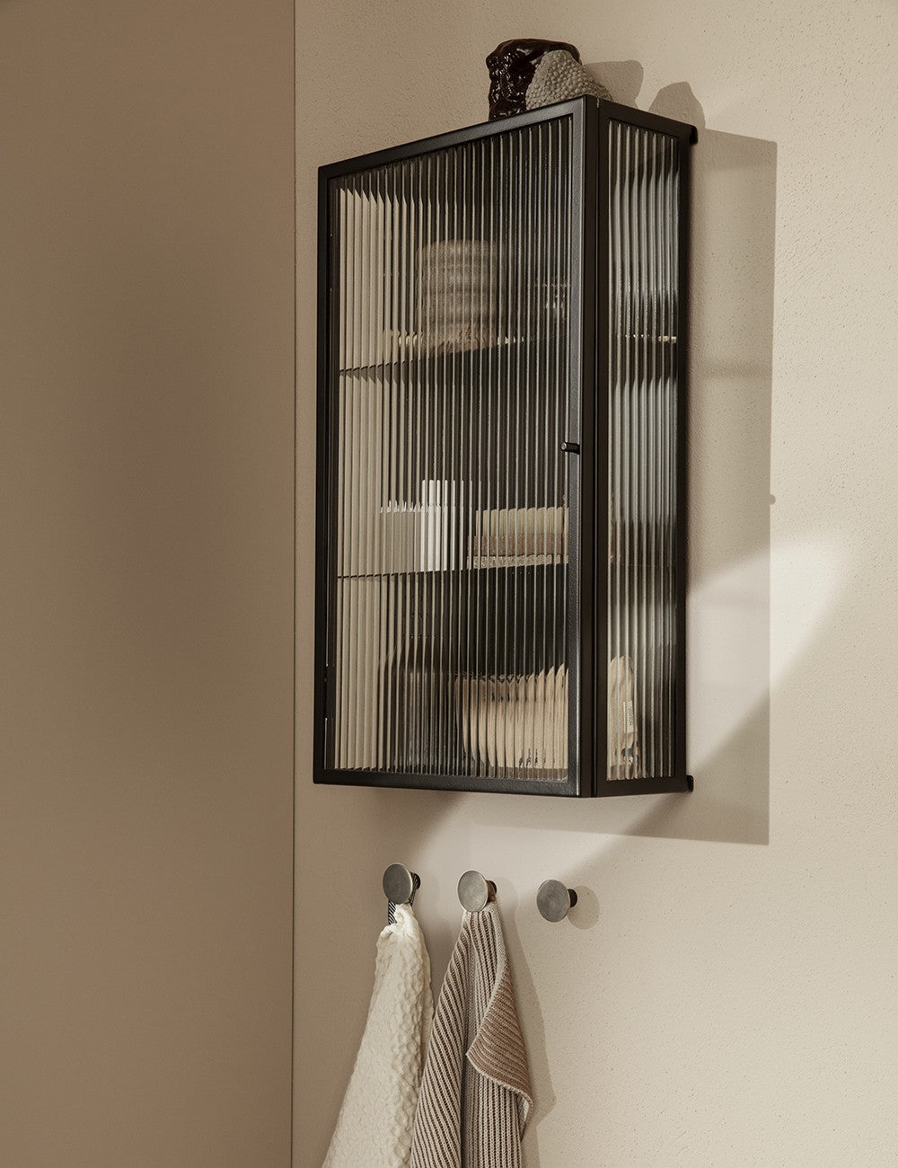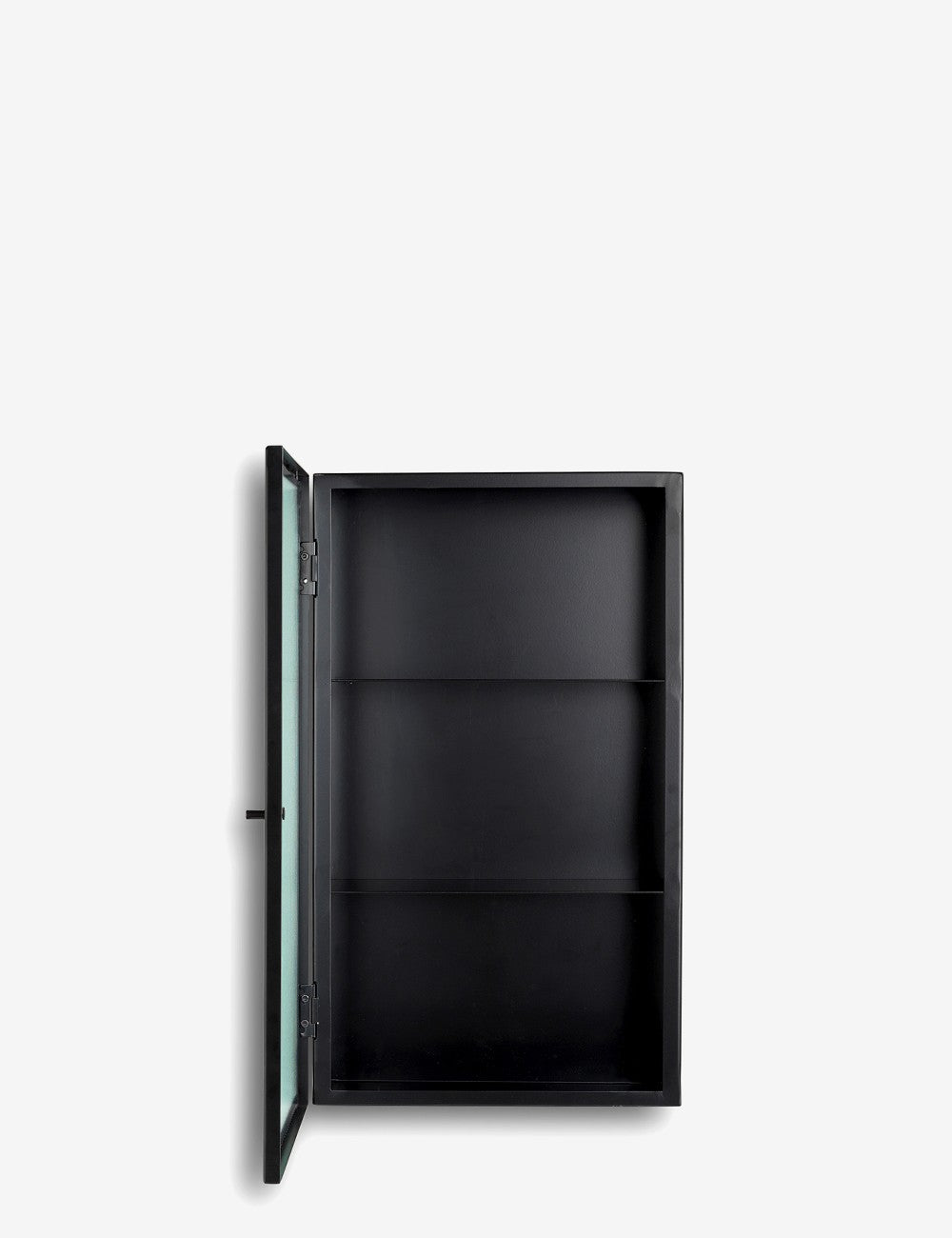 A estrutura de metal lacada serve como moldura do vidro, o protagonista deste design. O fechamento magnetizado com um botão de metal sutil que passa despercebido no conjunto dá lugar a três prateleiras robustas no interior.