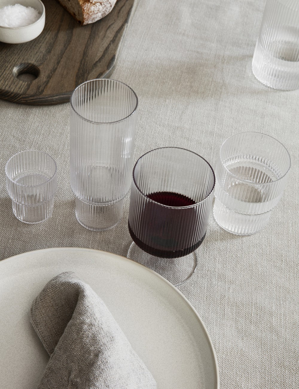 Um design sofisticado que brinca com a simetria e as ondas da superfície de cada copo. A coleção Ripple de Ferm Living é feita à mão enquanto cada peça é soprada no molde.