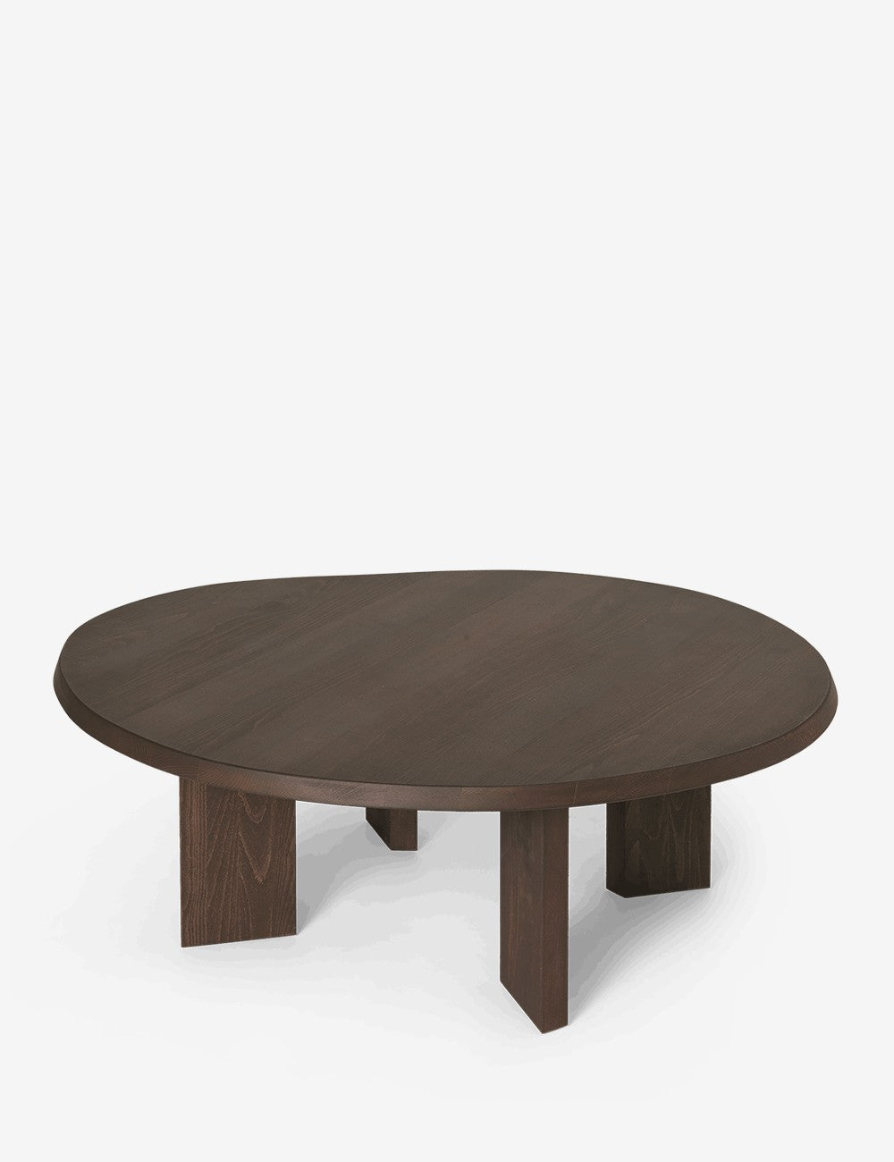 O design fluido e orgânico do tampo, contrastado por uma borda biselada e quatro pernas largas e lineares, cria uma peça visualmente marcante.