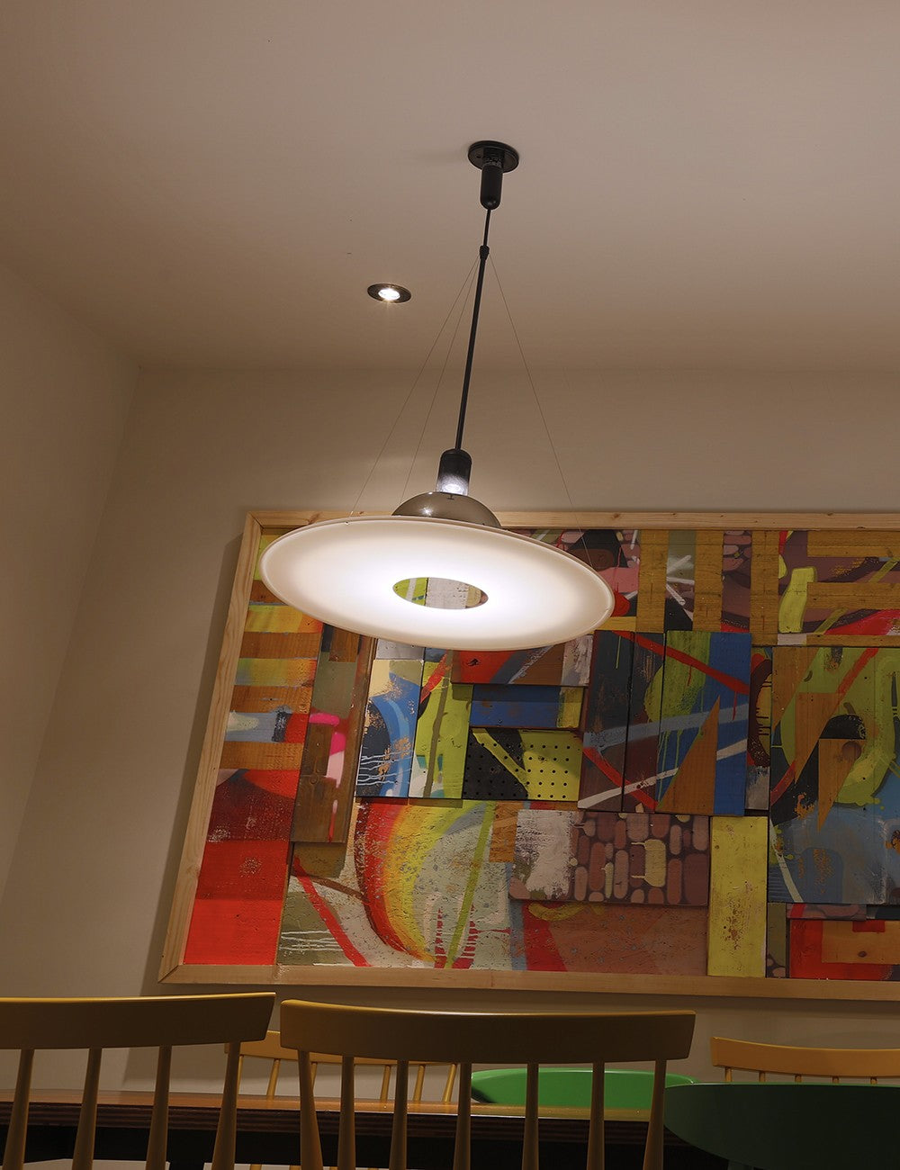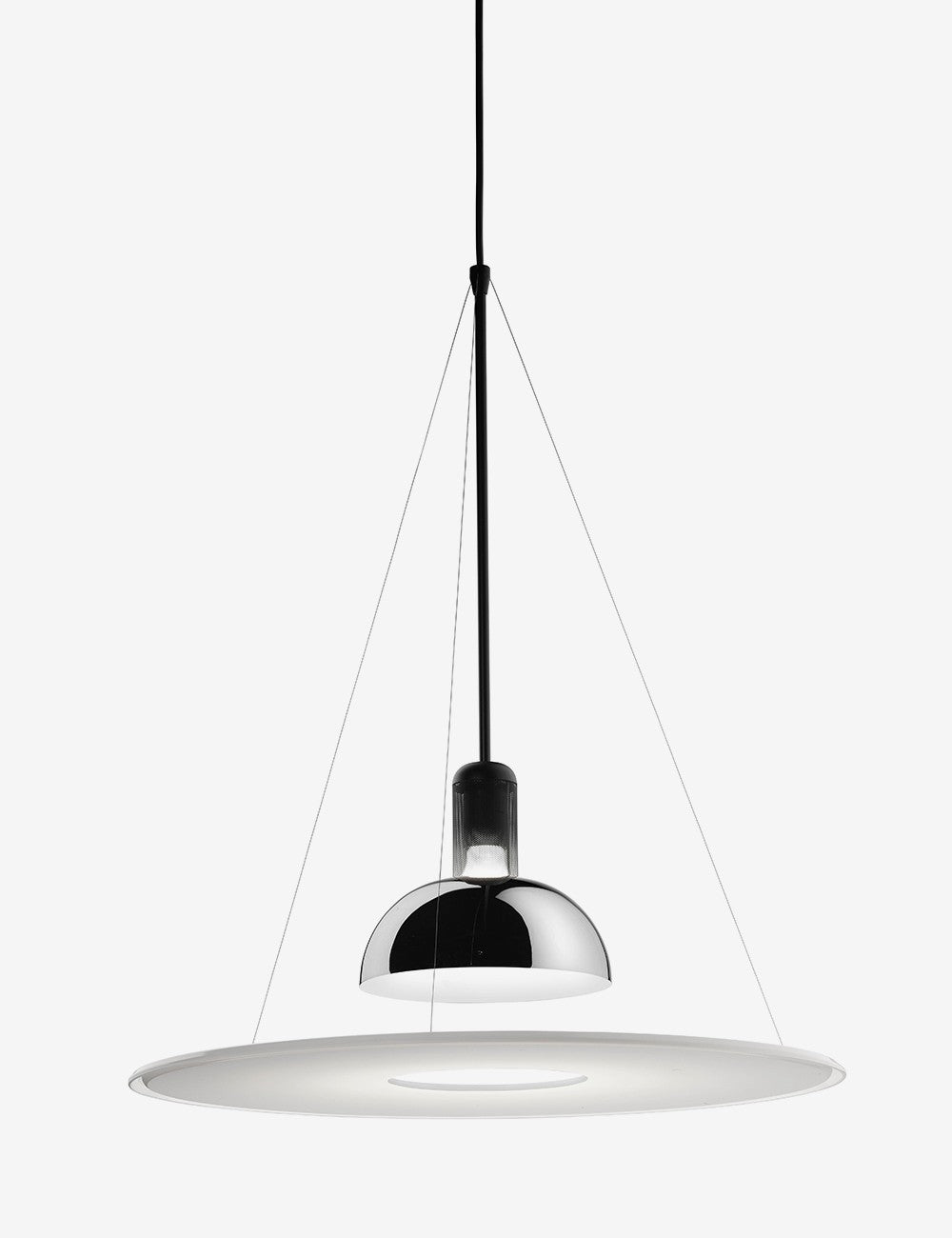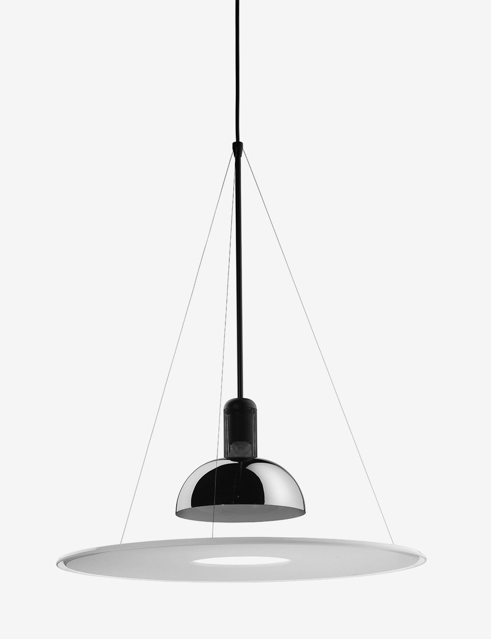 Frisbi é caracterizado pelo seu difusor de metacrilato opalino em forma de disco que fornece luz ambiente difusa e direta ao mesmo tempo, o que permite que um único candeeiro Frisbi ilumine toda o espaço.