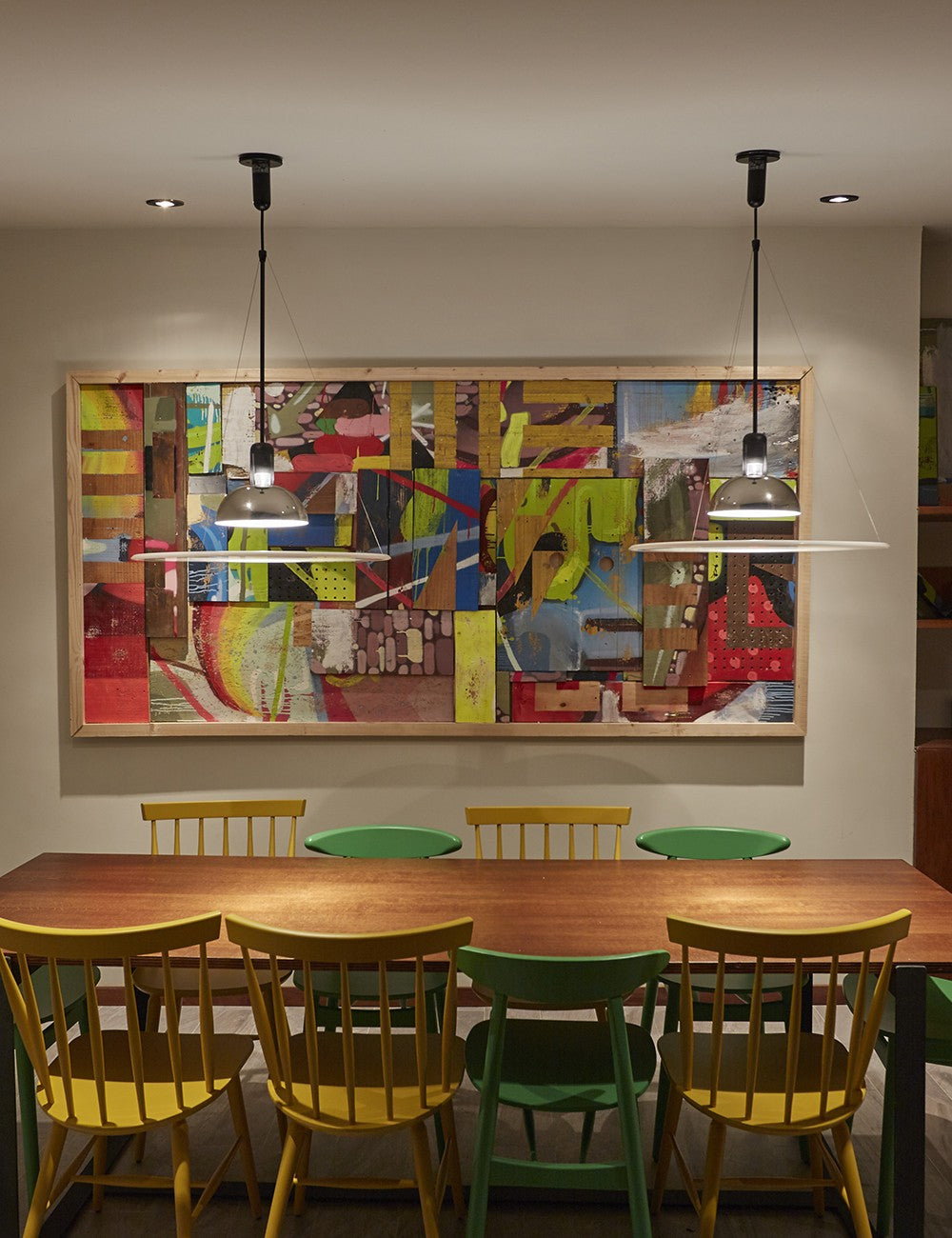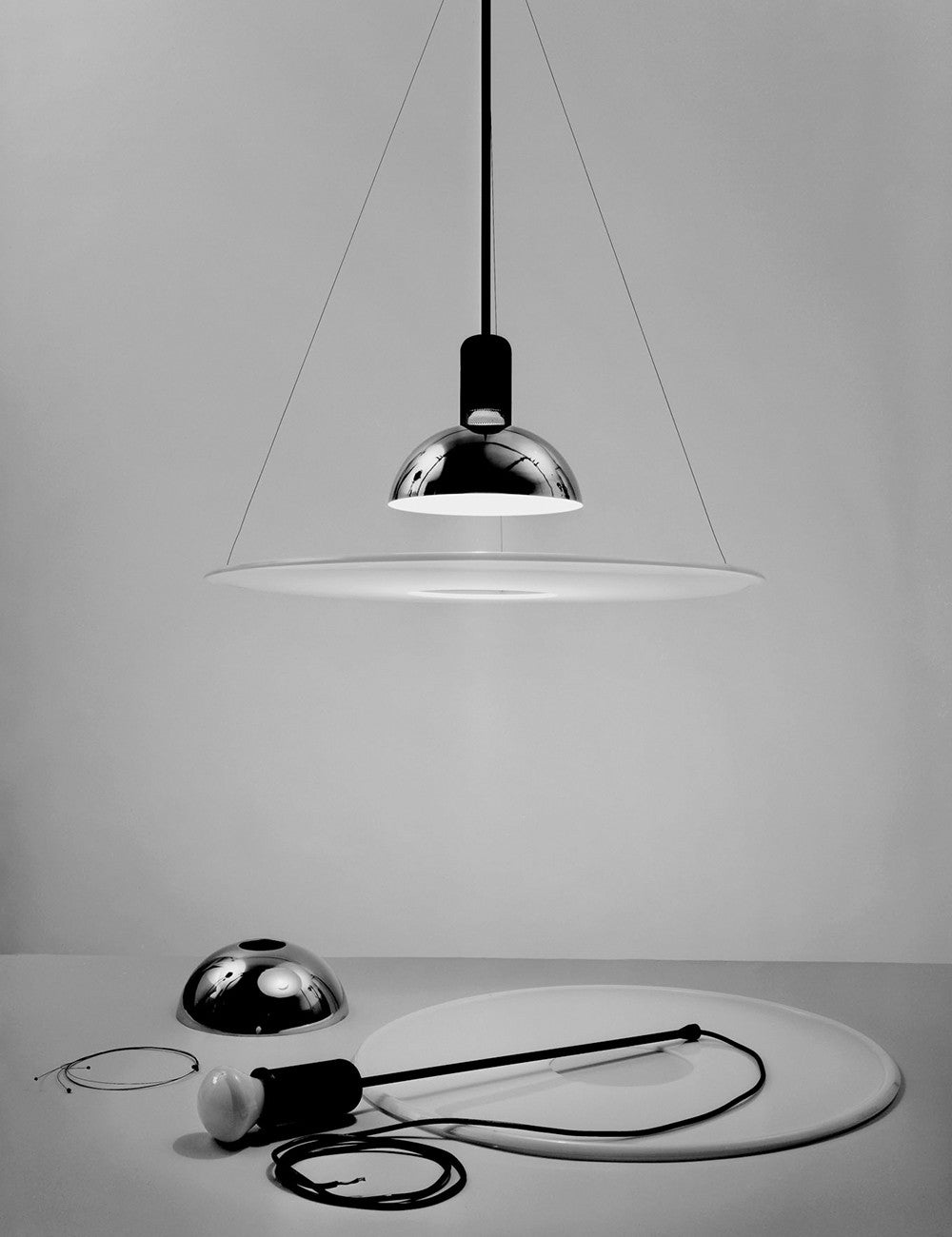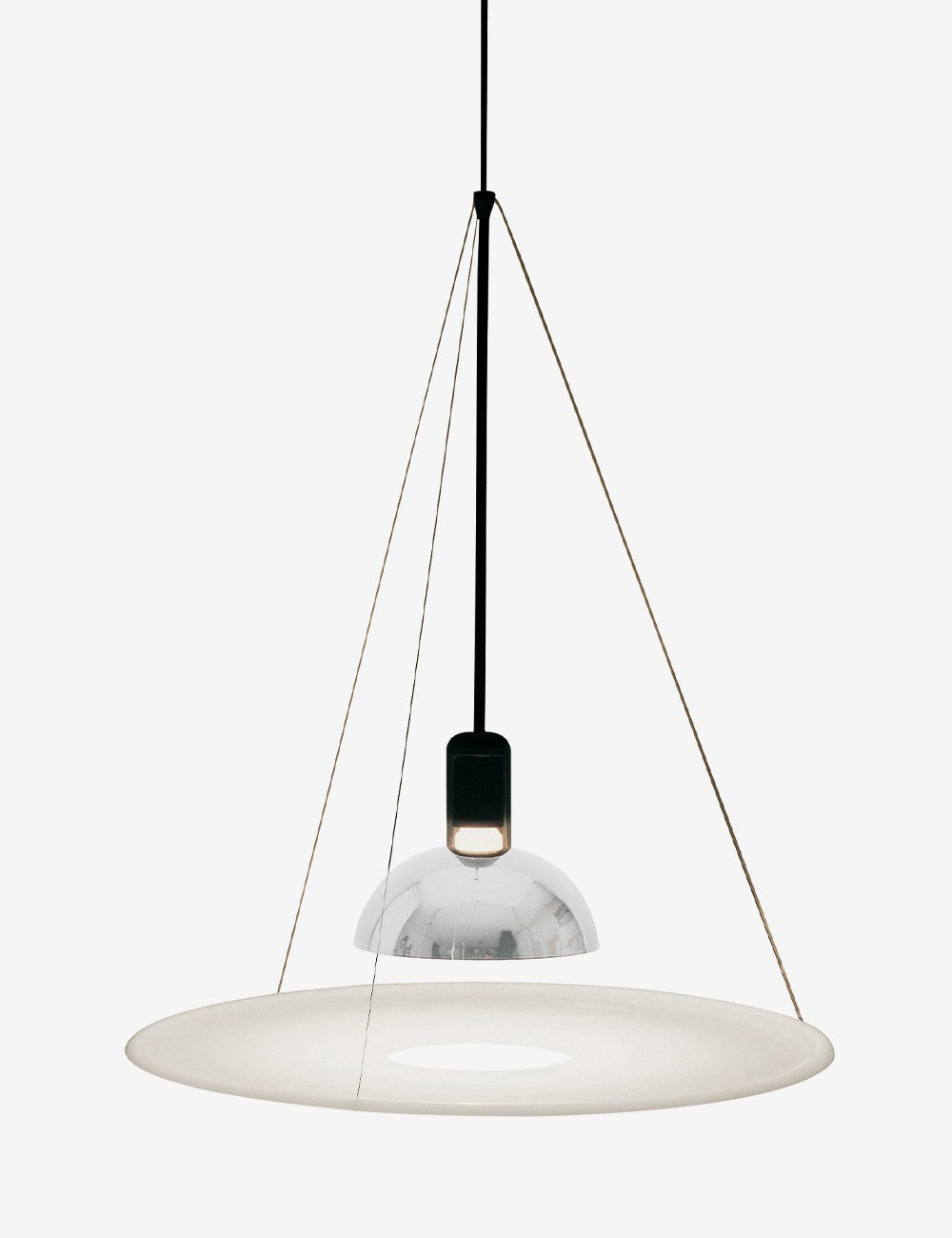 Frisbi é caracterizado pelo seu difusor de metacrilato opalino em forma de disco que fornece luz ambiente difusa e direta ao mesmo tempo, o que permite que um único candeeiro Frisbi ilumine toda o espaço.