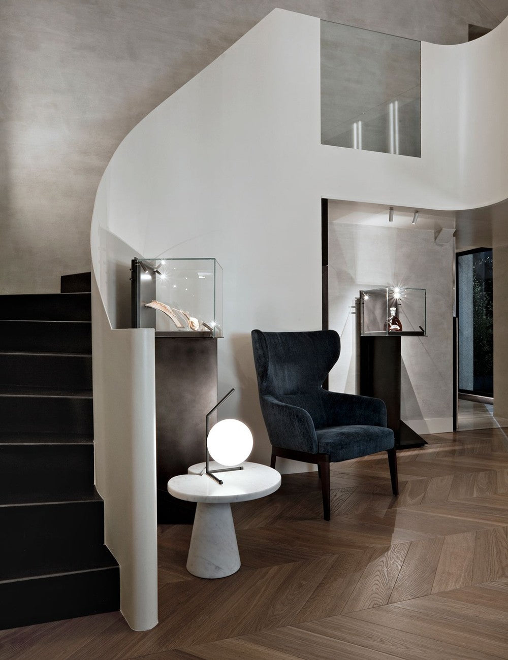 O design do IC Lights é composto por um abajur de vidro soprado esférico e uma estrutura de metal leve.