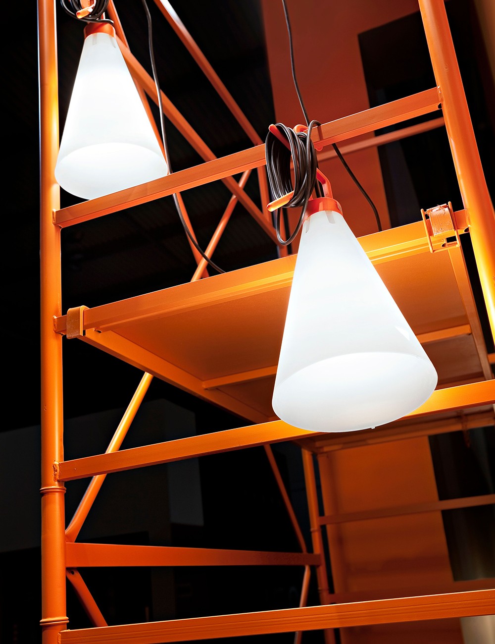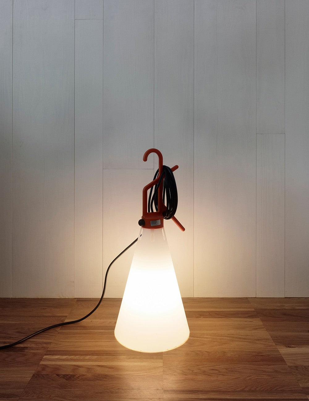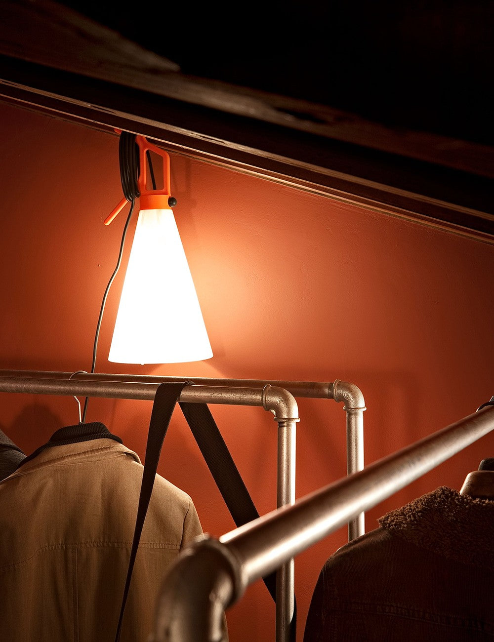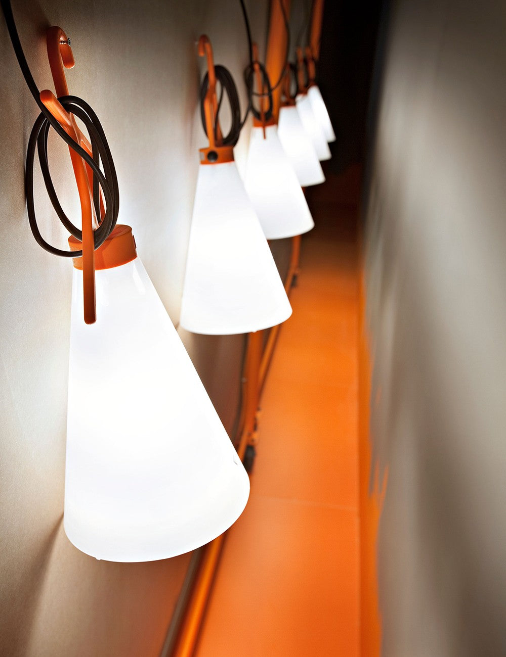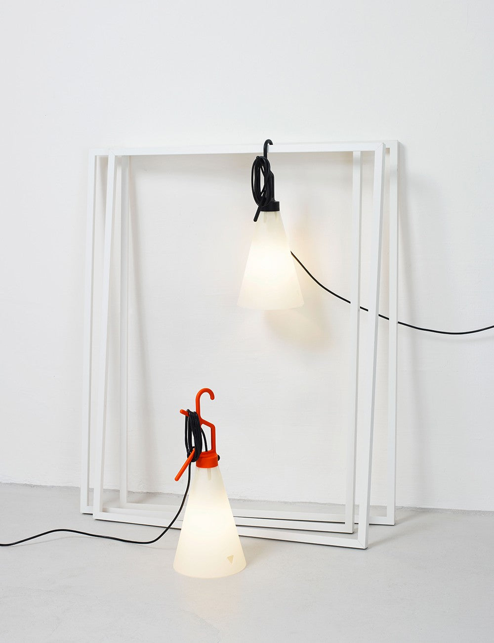 O abajur cônico e translúcido de Mayday fornece luz ambiente agradável, enquanto o seu gancho atua como alça, suporte e coletor de cabos.