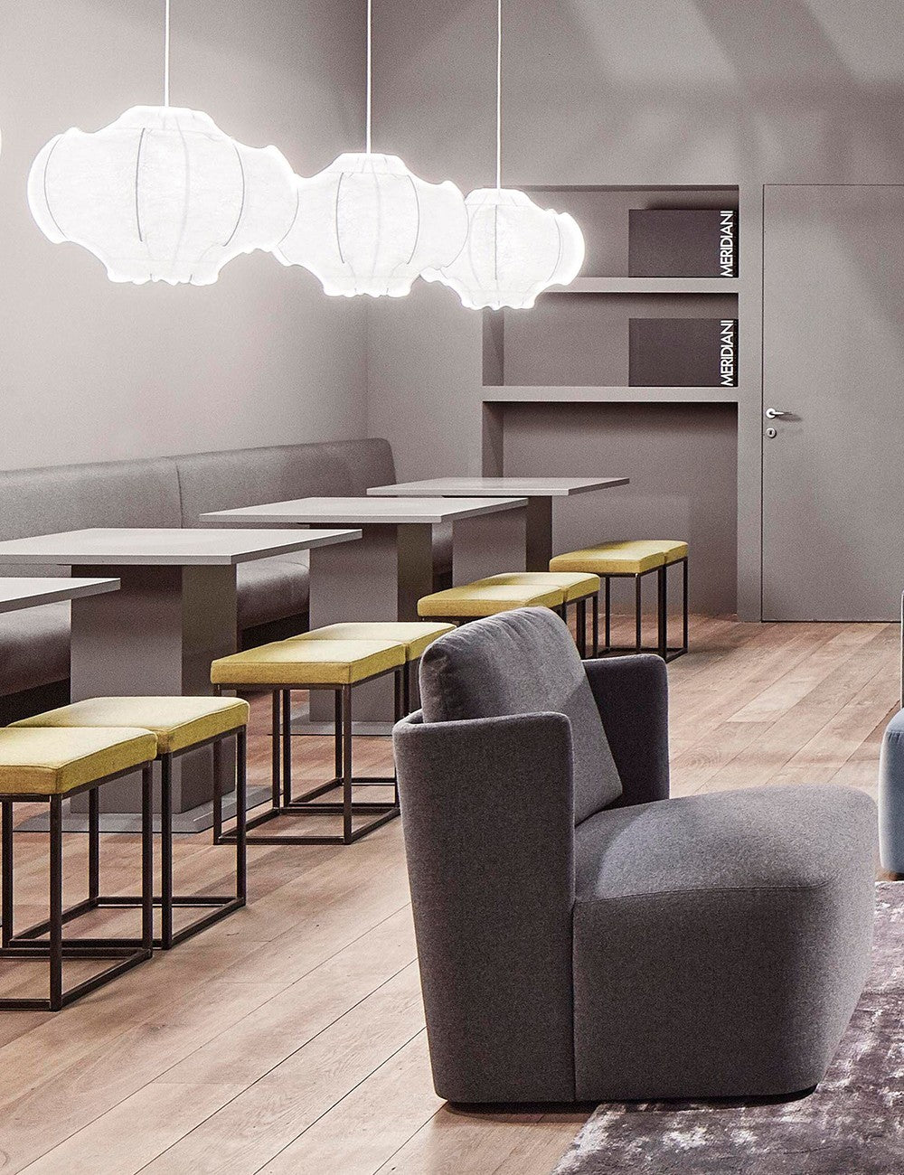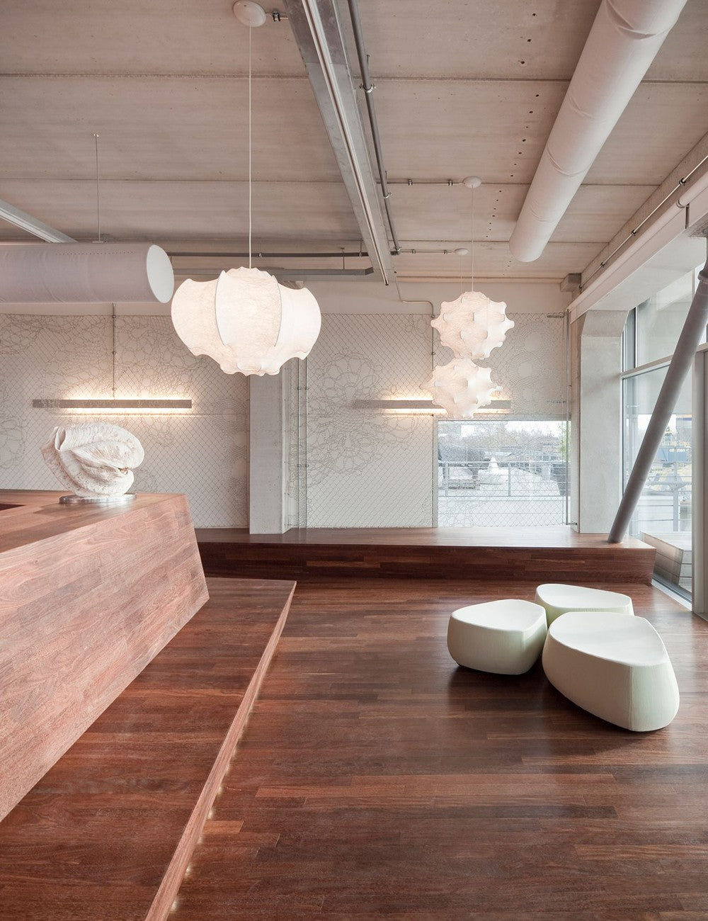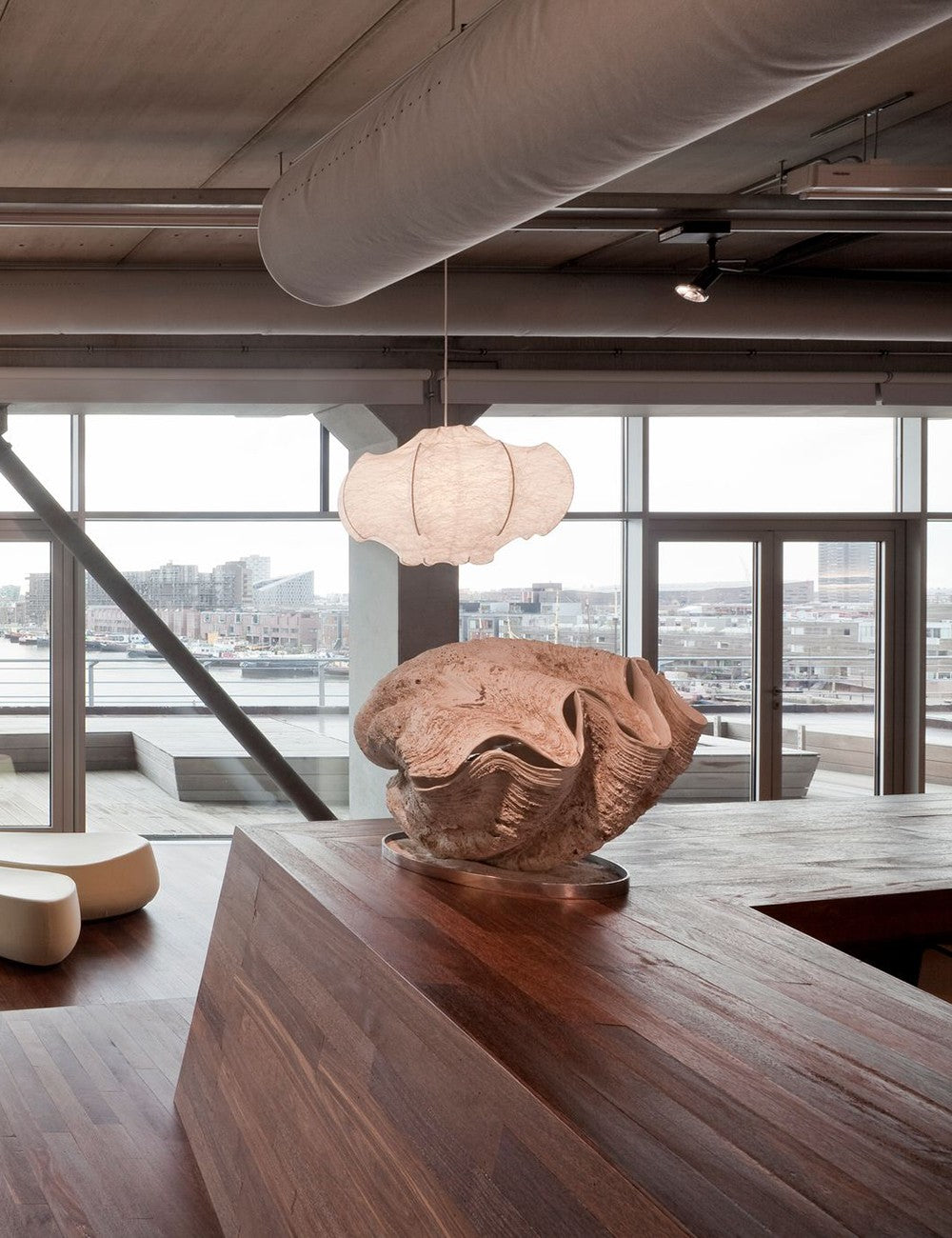 O candeeiro Viscontea é feito através de um intrincado processo em que tecido líquido é pulverizado sobre a base de alumínio, resultando em uma persiana translúcida que emite luz suave e difusa.