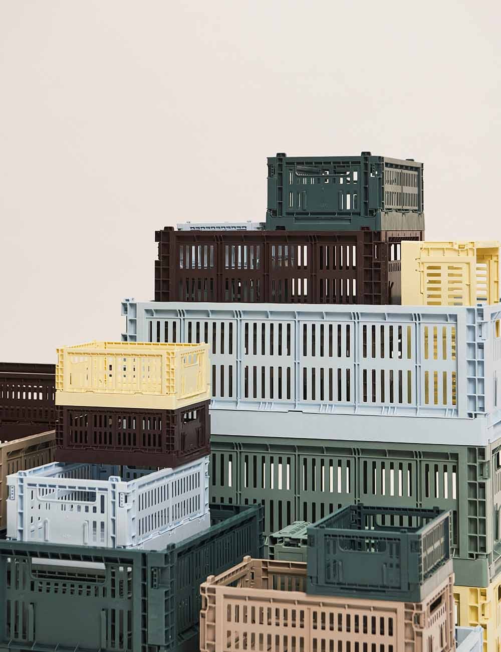 HAY Colour Crate é feito inteiramente de resíduos plásticos pós-consumo e você pode encontrá-los em uma ampla variedade de cores e tamanhos.