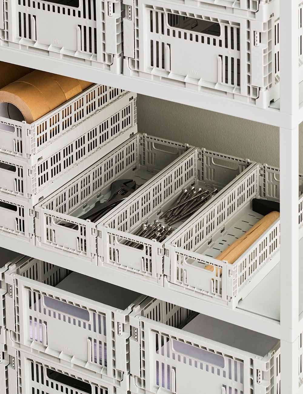 HAY Colour Crate é uma série de caixas de armazenamento coloridas com design perfurado, que também são dobráveis ​​e empilháveis.