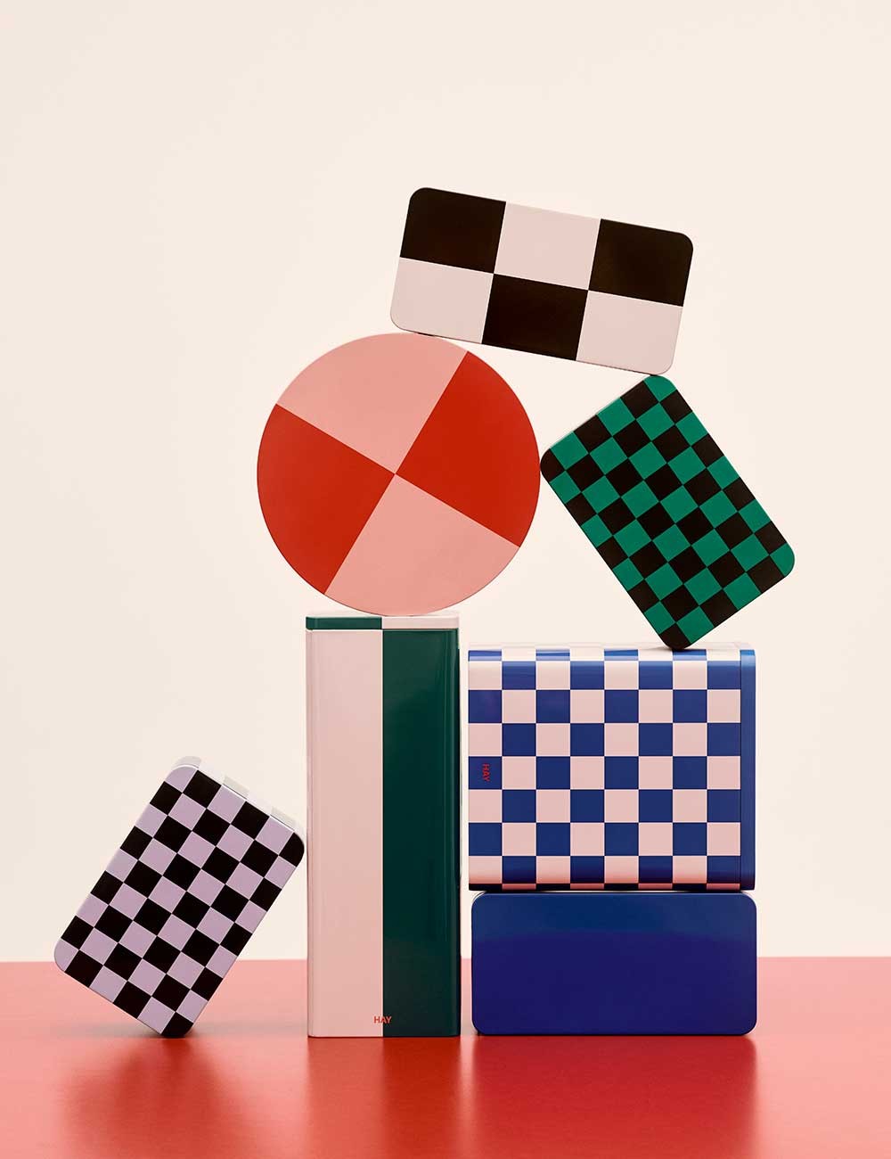 A coleção Tin da HAY é composta por uma série de caixas de arrumação funcionais e decorativas com motivos axadrezados coloridos e um acabamento brilhante.