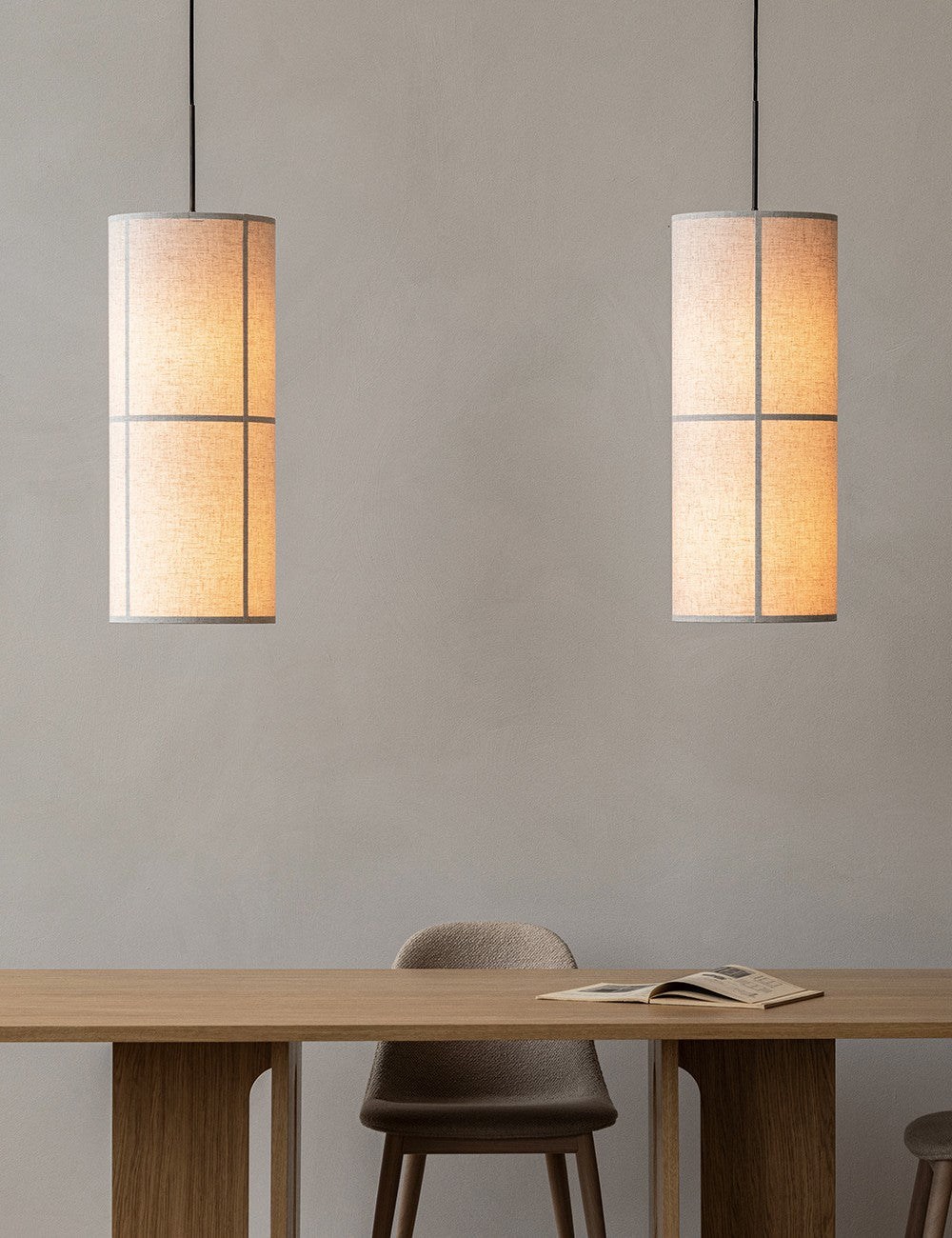 Este candeeiro suspenso faz parte da coleção Hashira e partilha a mesma silhueta colunar das versões de pé e de mesa.
