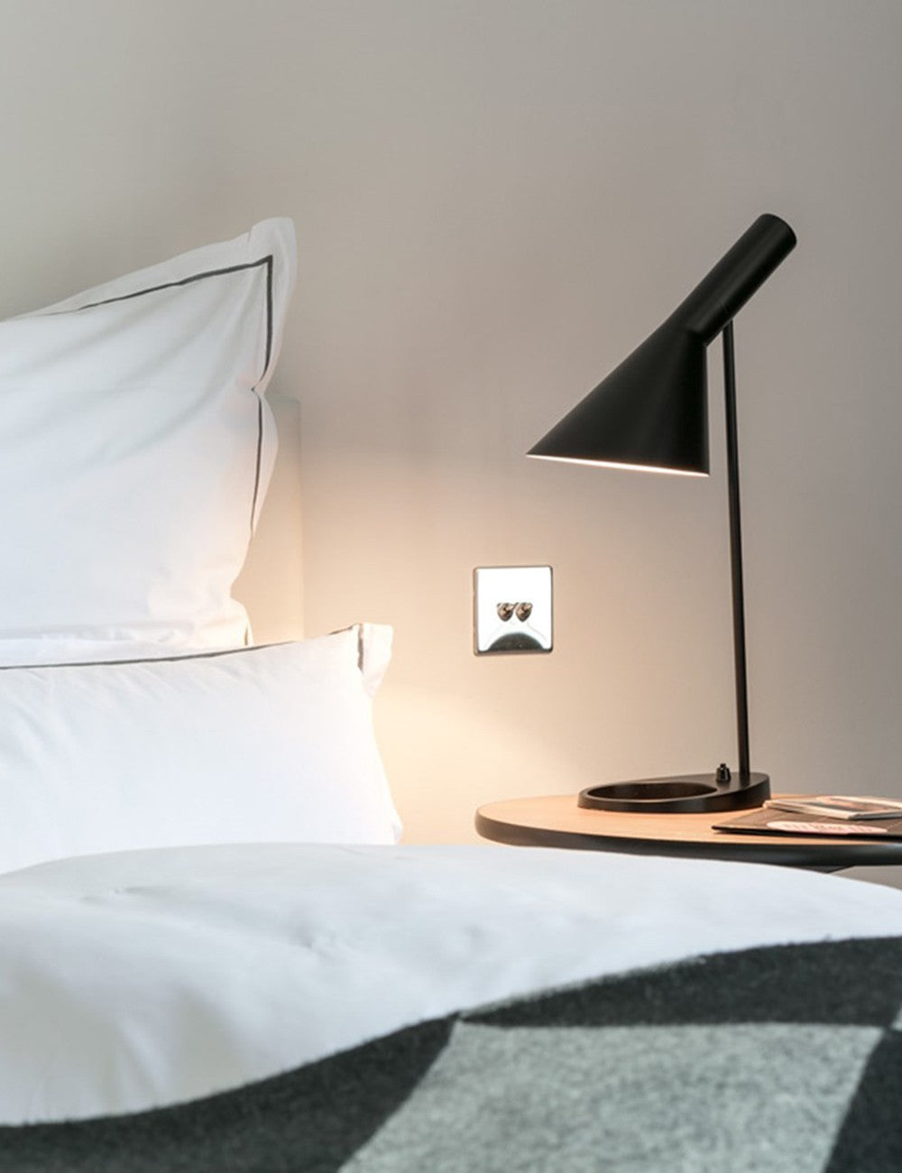 A silhueta da luminária AJ, com as suas linhas retas e a sua combinação de ângulos oblíquos e retos, faz uma clara referência aos edifícios do designer.