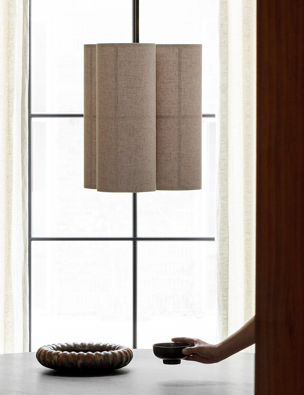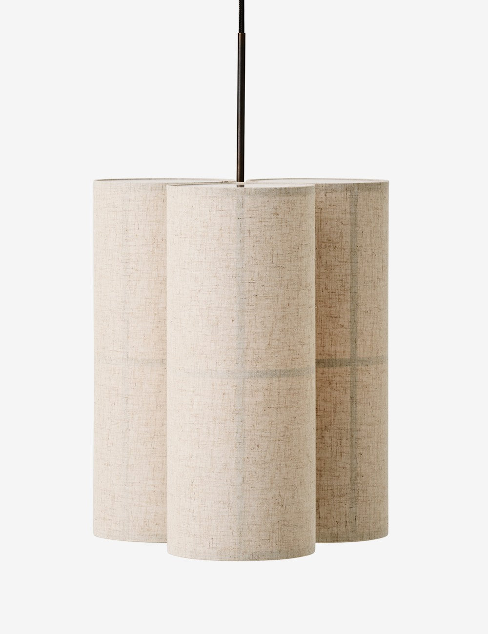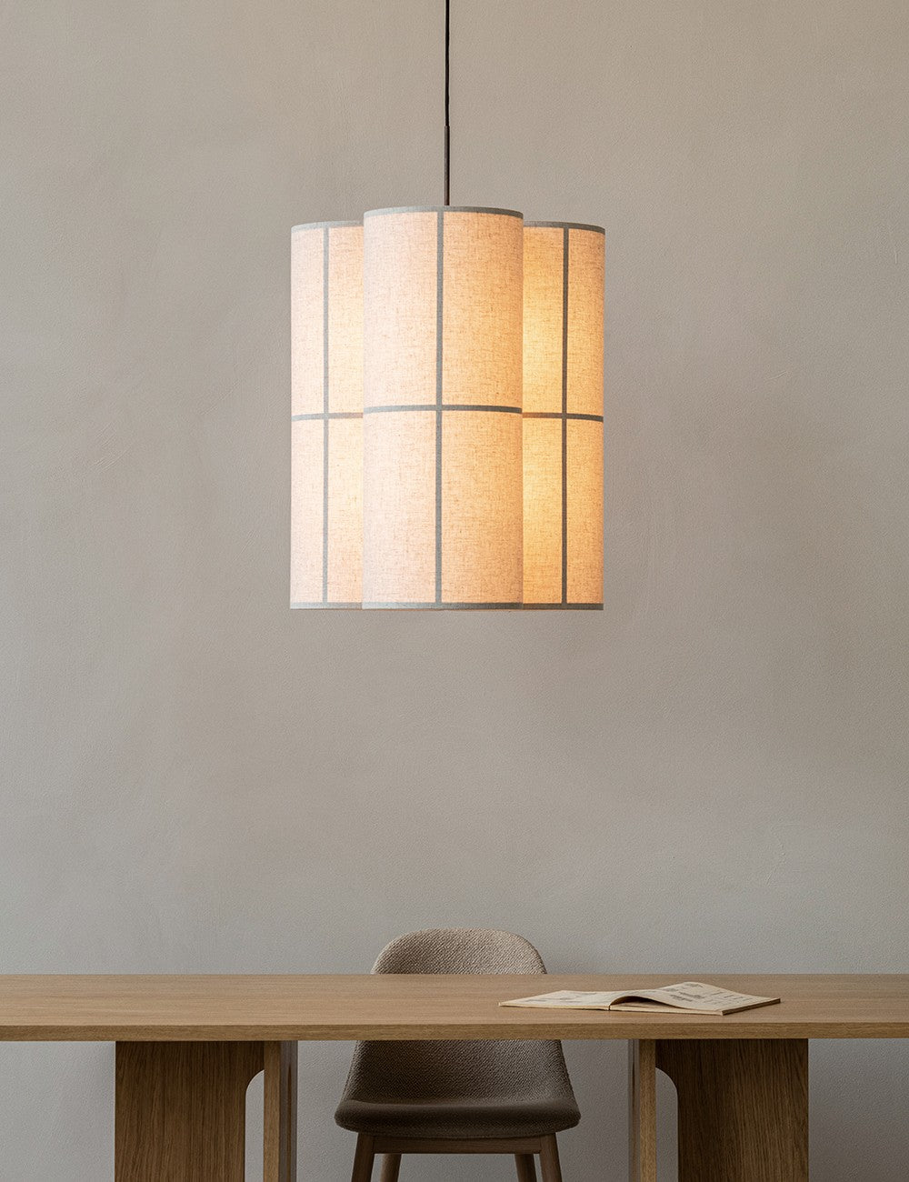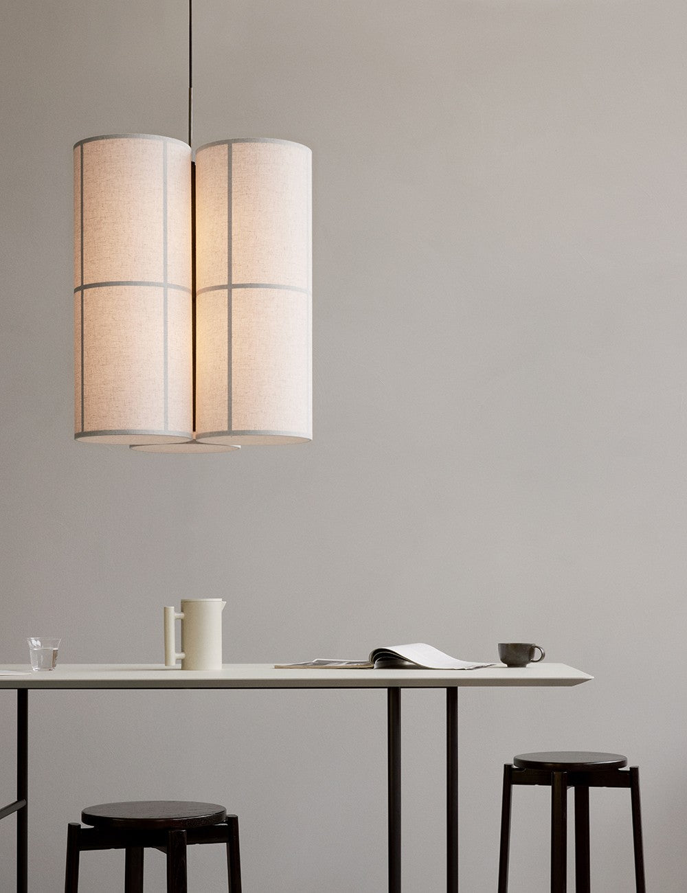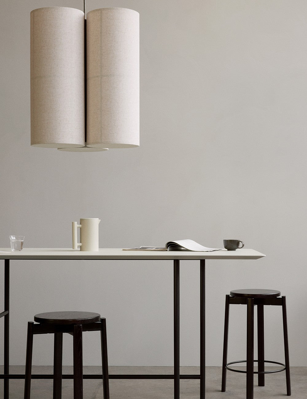 Um trio de abajures têxteis suspensos por um cabo têxtil preto cria uma peça escultural e serena, que emite luz tanto para baixo como para cima, proporcionando uma iluminação ambiente de 360 graus, acolhedora e não invasiva.