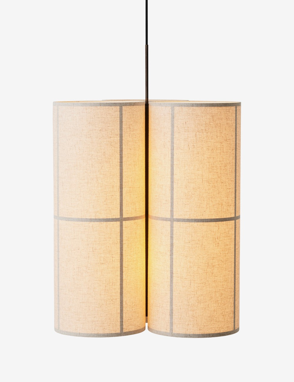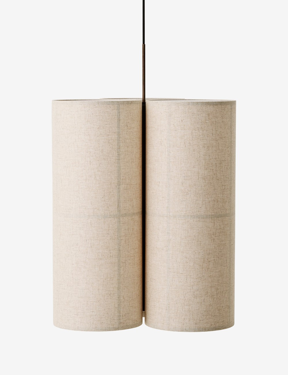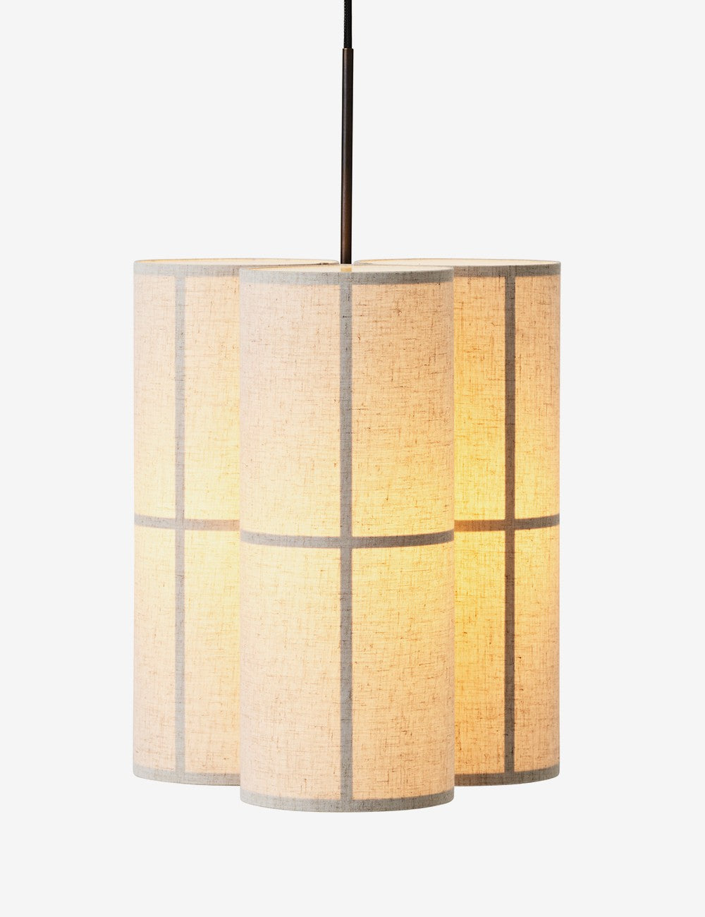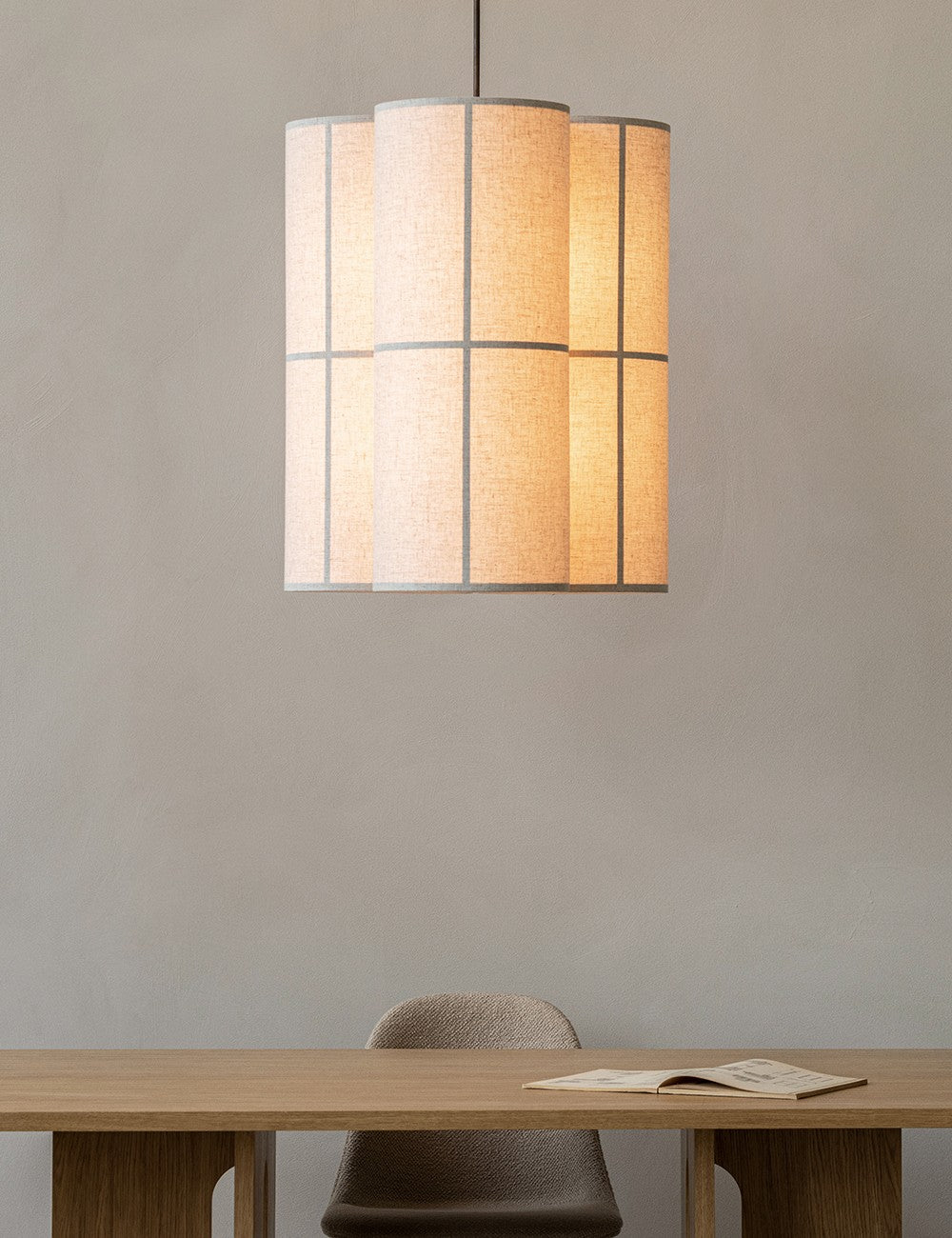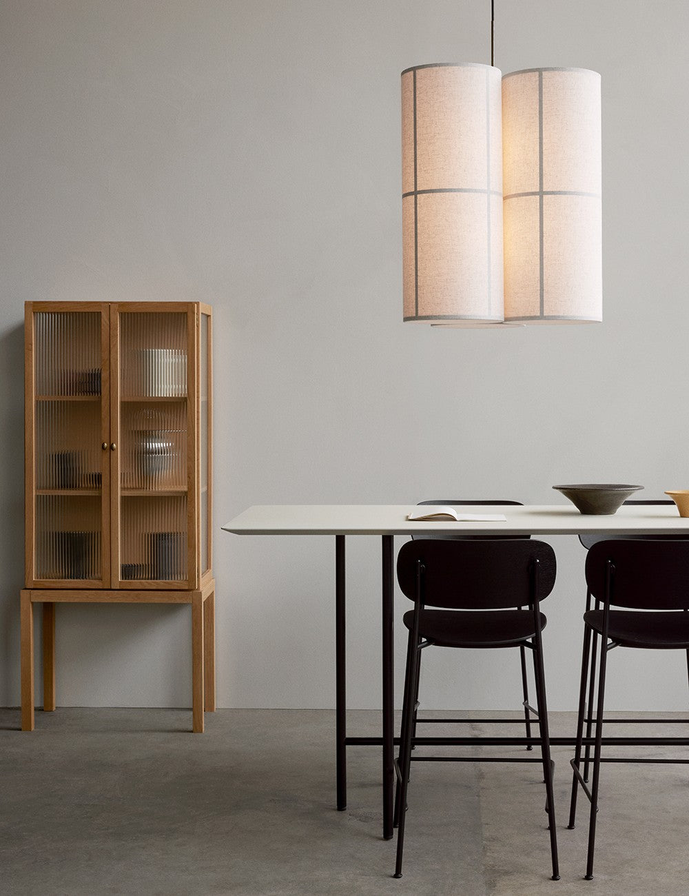 Um trio de abajures têxteis suspensos por um cabo têxtil preto cria uma peça escultural e serena, que emite luz tanto para baixo como para cima, proporcionando uma iluminação ambiente de 360 graus, acolhedora e não invasiva.