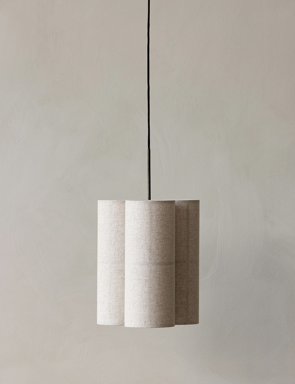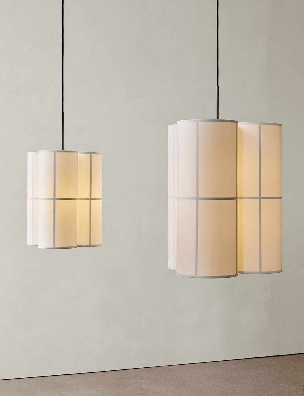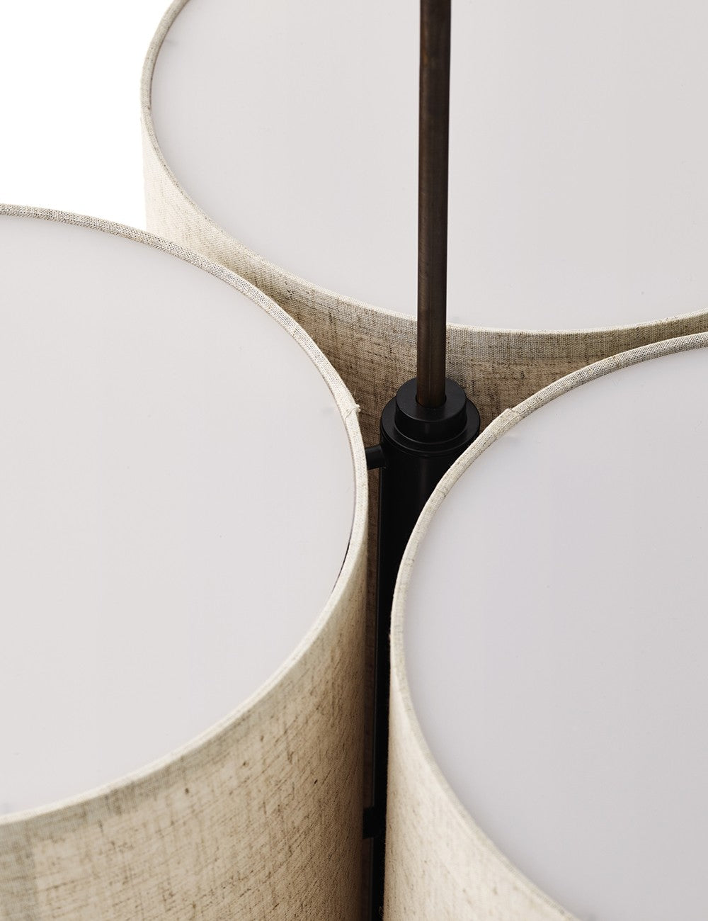 Um trio de abajures têxteis suspensos por um cabo têxtil preto cria uma peça escultural e serena, que emite luz tanto para baixo como para cima, proporcionando uma iluminação ambiente de 360 graus, acolhedora e não invasiva.