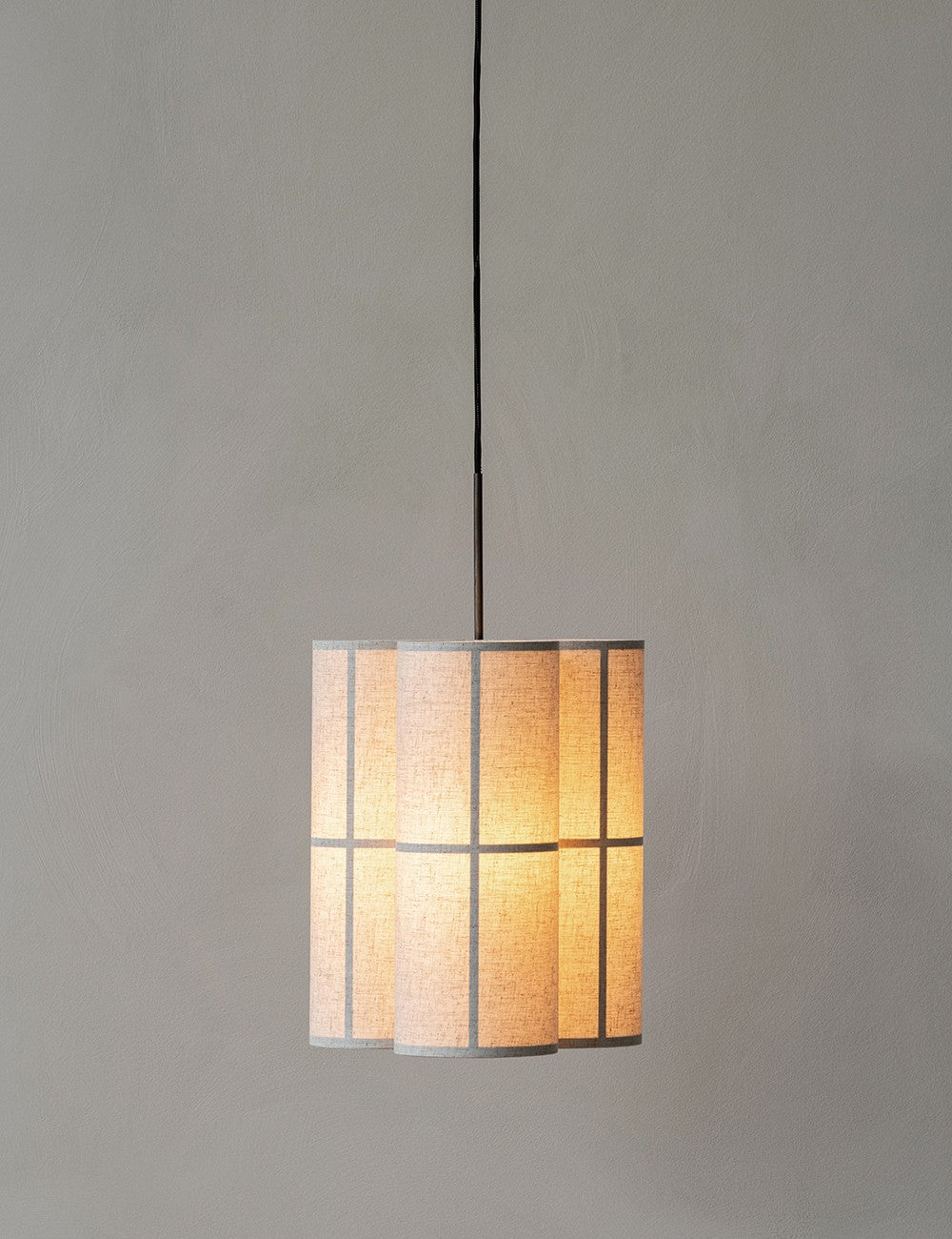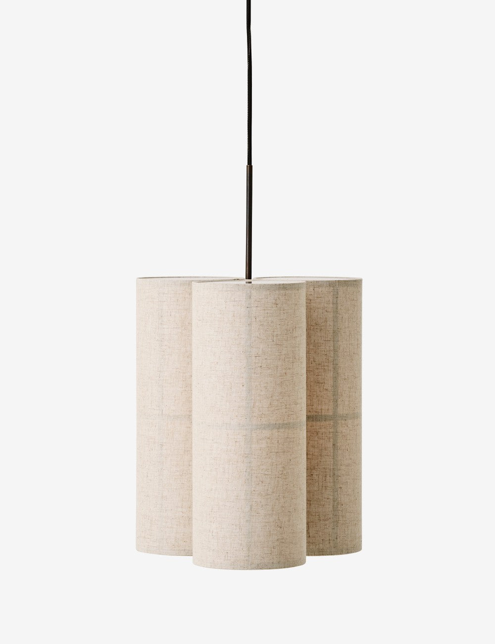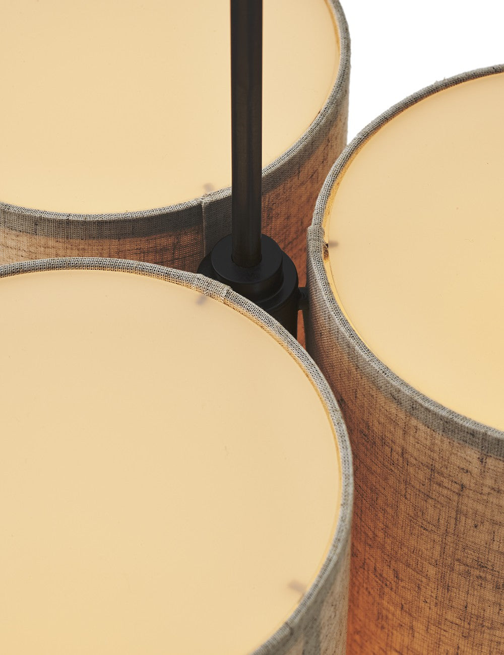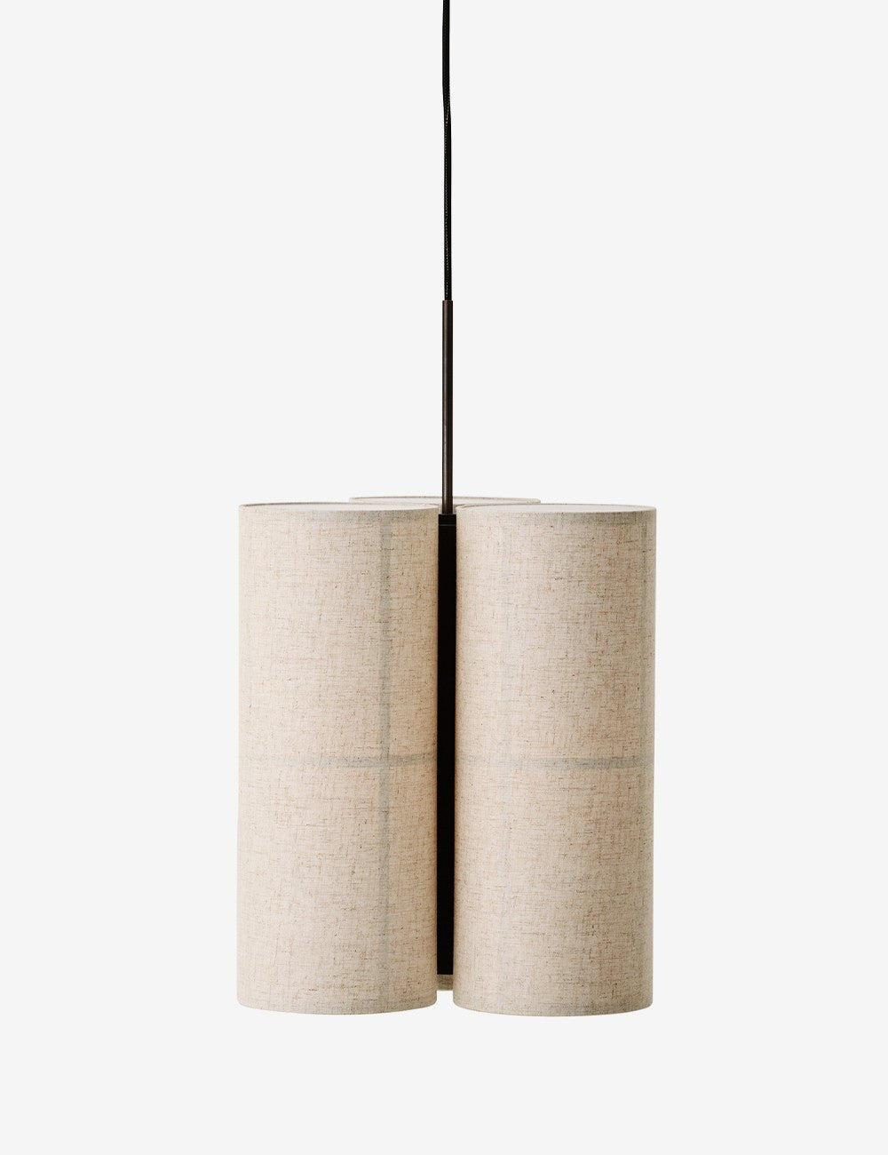 Um trio de abajures têxteis suspensos por um cabo têxtil preto cria uma peça escultural e serena, que emite luz tanto para baixo como para cima, proporcionando uma iluminação ambiente de 360 graus, acolhedora e não invasiva.