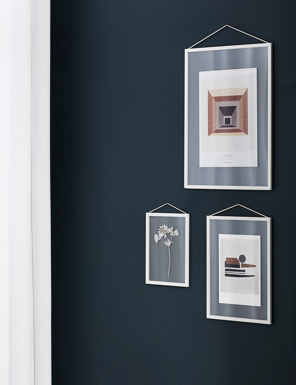 Este marco extra ligero es un diseño simple y conceptual, de la marca danesa Moebe, que está compuesto por dos láminas de metacrilato, cuatro perfiles, un cordón de caucho que une el conjunto y a su vez sirve de colgador.