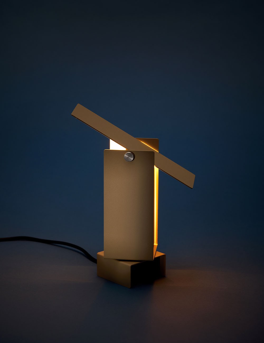É composto por quatro lâminas de aço: três são dobradas em forma de U interligado e fixadas no centro, enquanto a quarta atua como um defletor de luz no topo, permitindo um controle dinâmico da direção da luz.