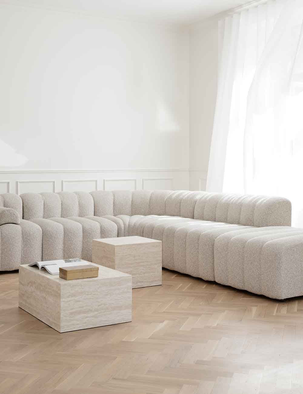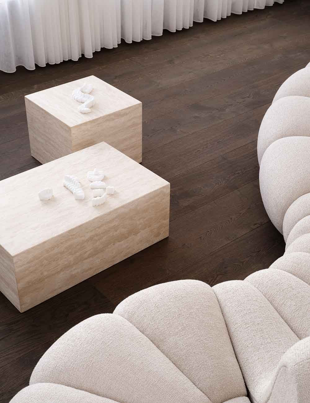 Cubism da Norr11 é composto por uma série de mesas auxiliares em travertino.