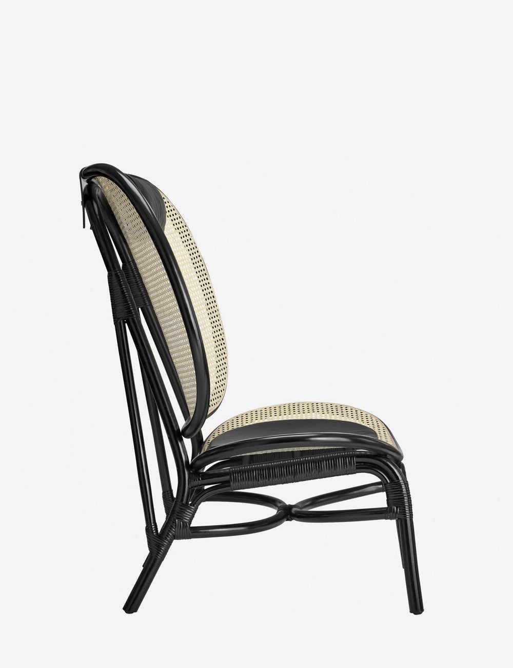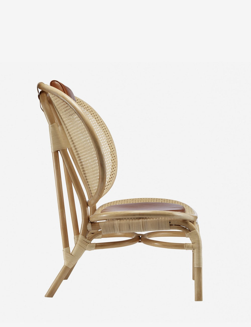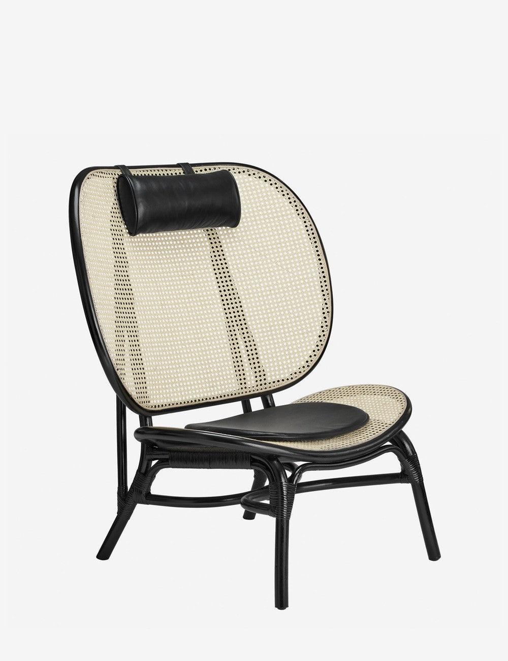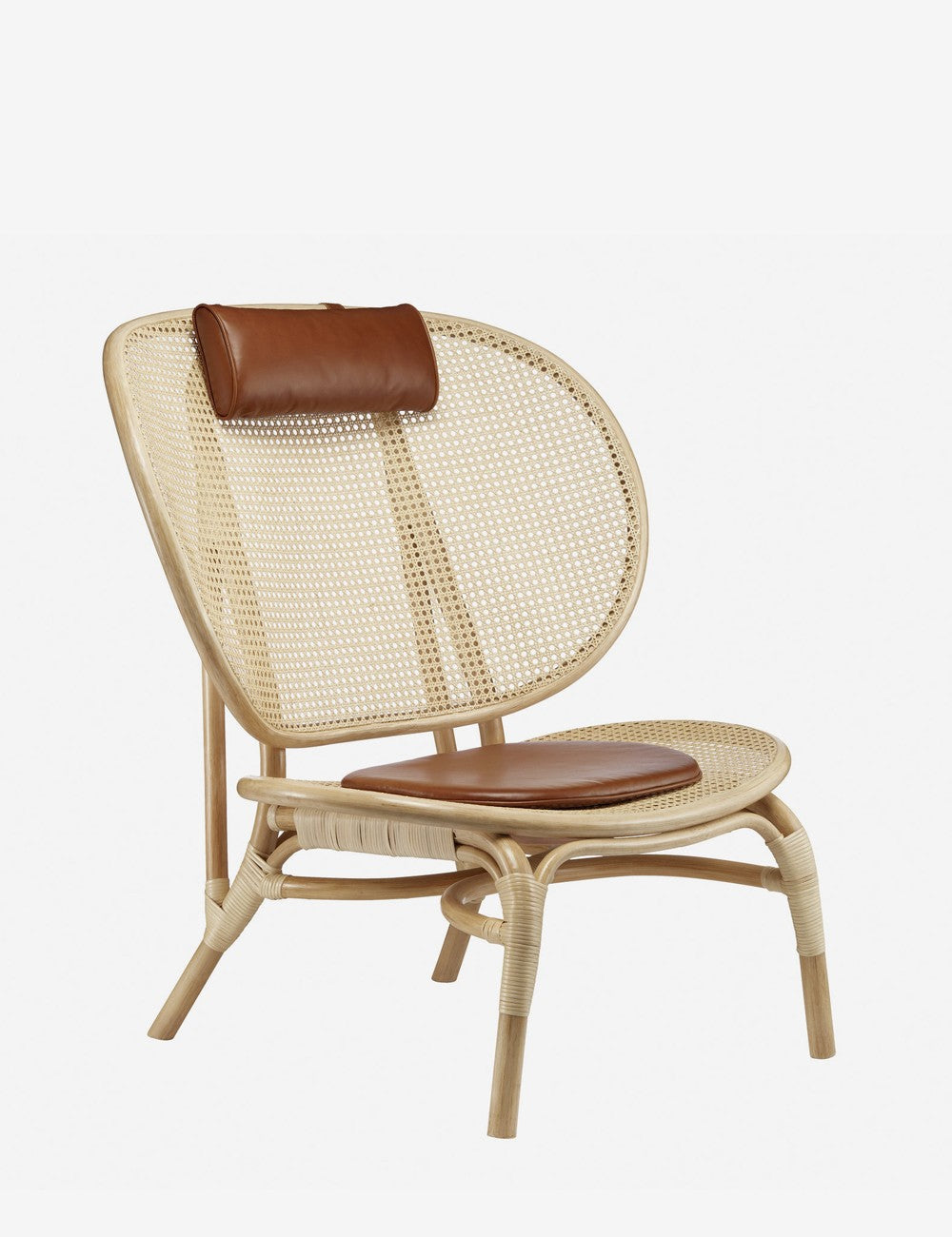 Um assento e encosto generosos, acompanhados por um apoio de cabeça e uma almofada de couro anilina, abraçam todo o corpo, criando o máximo conforto. Tanto o assento quanto o encosto são feitos com uma estrutura de bambu moldada acompanhada de rattan francês em cores naturais, criando uma peça visualmente leve.