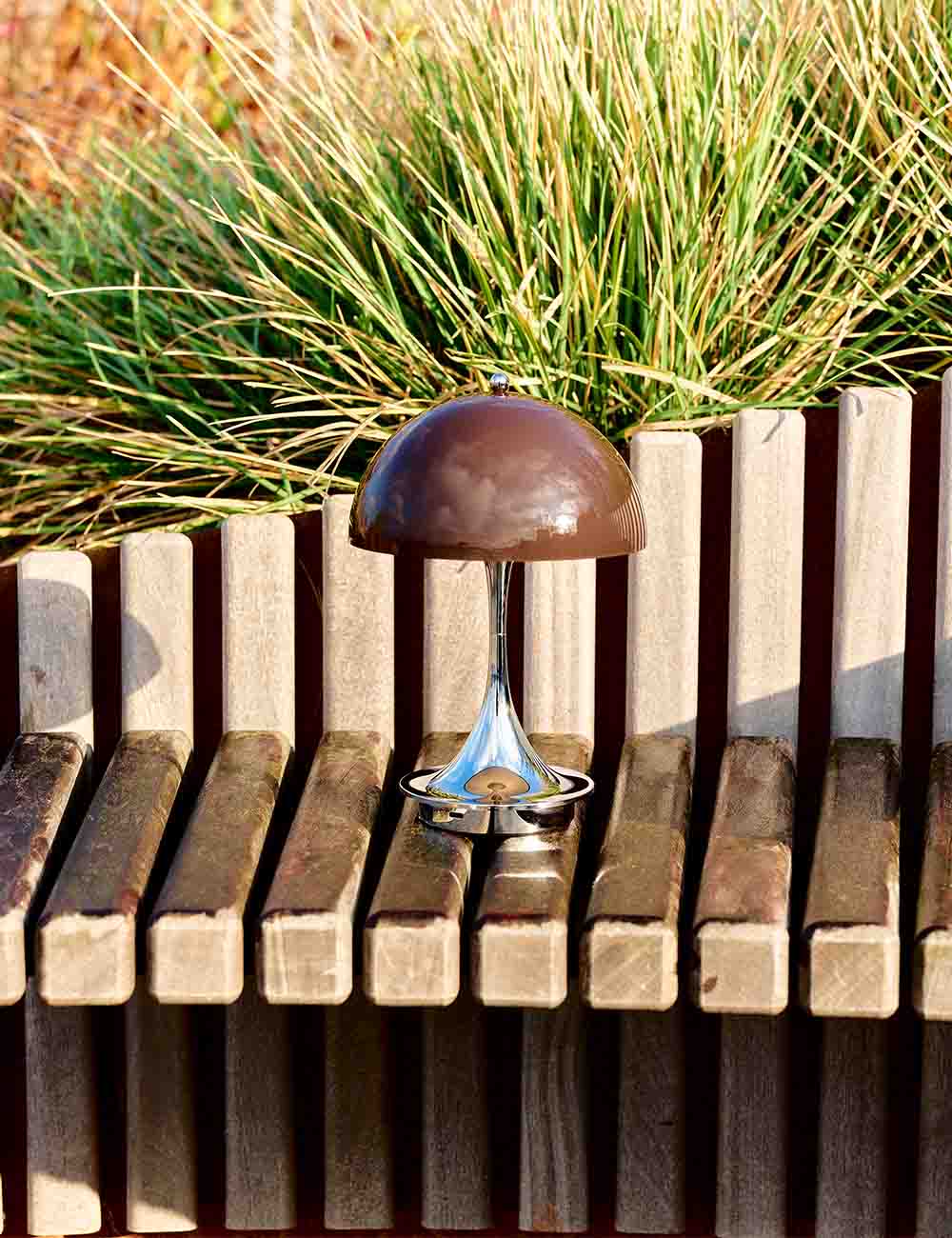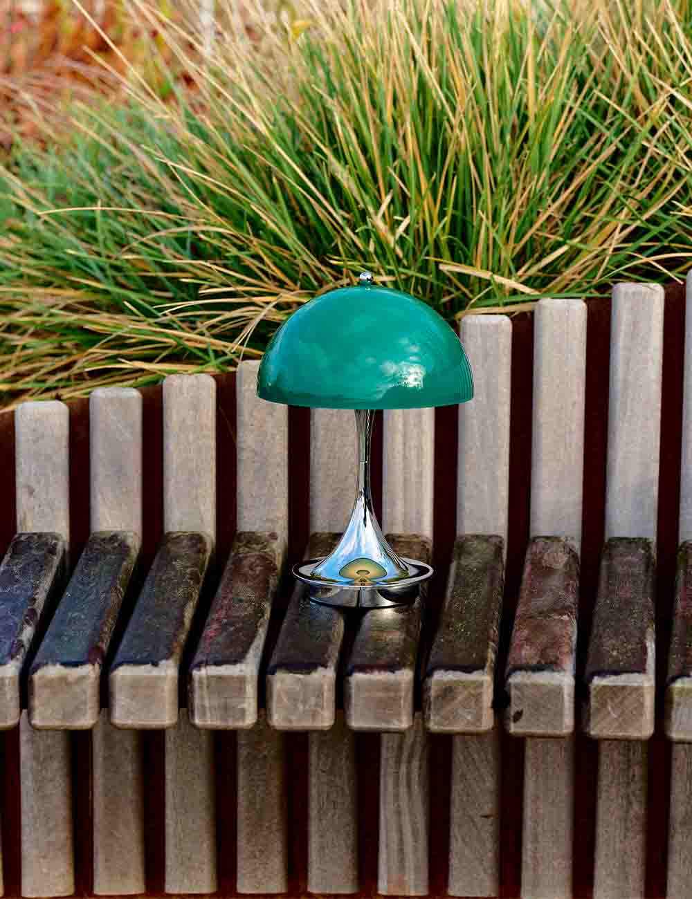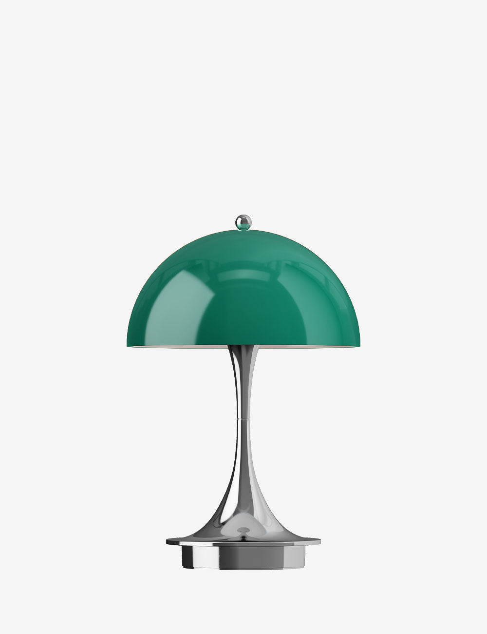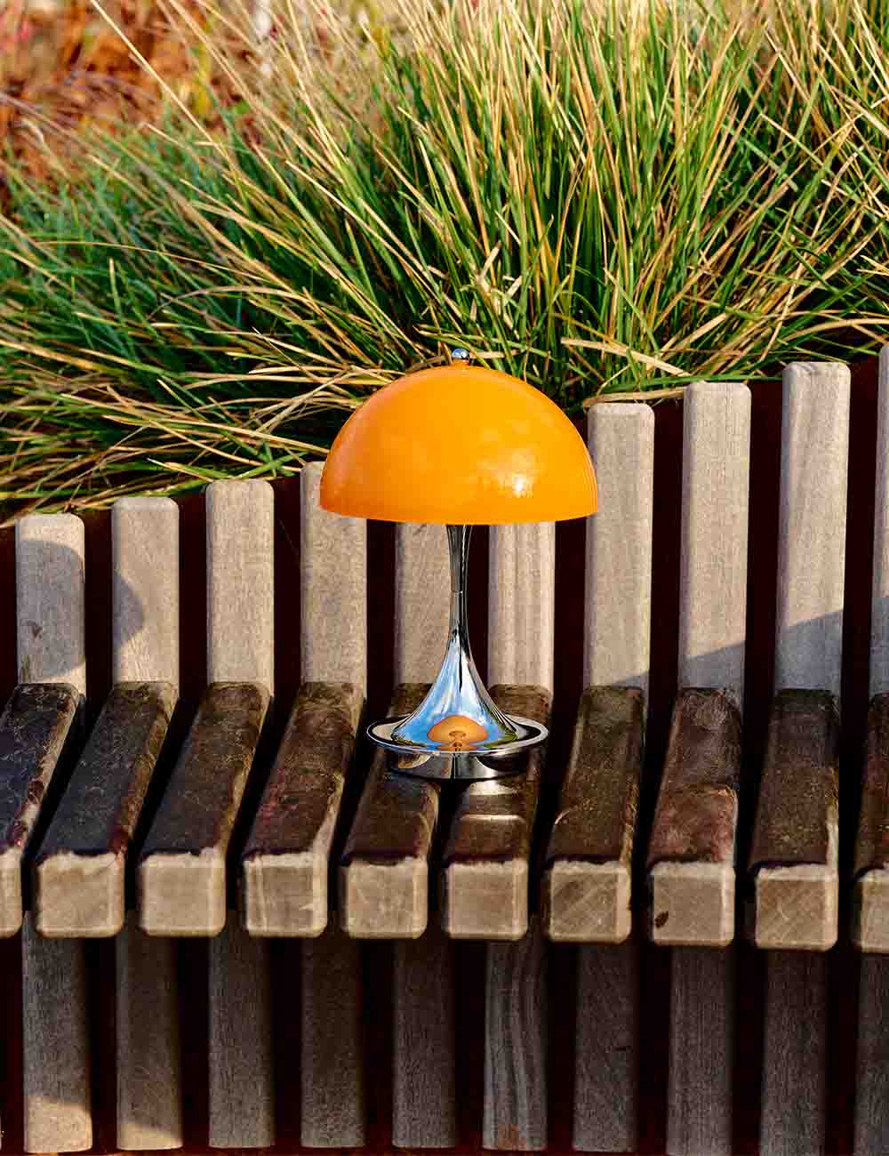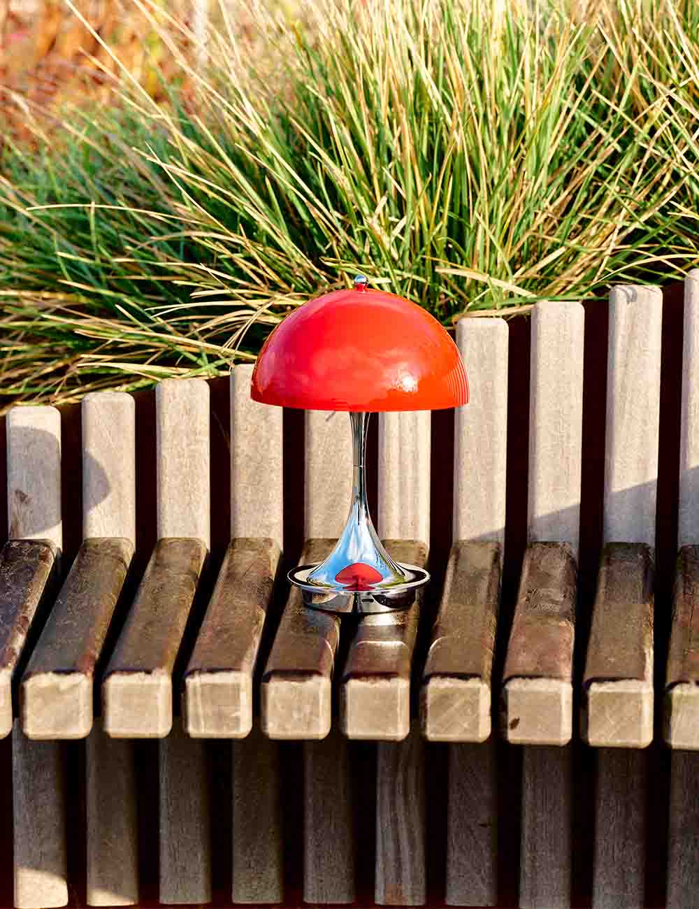 A versão portátil, com abajur acrílico opal translúcido e pé cônico, oferece uma iluminação difusa e agradável que realça pequenos recantos e ambientes íntimos. Recarregável e regulável em três níveis, oferece até 8 horas de autonomia na intensidade máxima e também pode ser utilizada no exterior. Um exemplo claro do talento de Panton para criar ambientes acolhedores e envolventes num formato compacto e versátil.