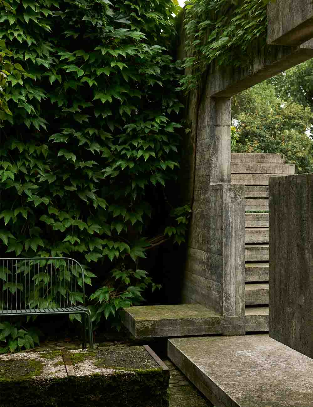 - Mobiliário de exterior com silhuetas esculpidas e jogo de luz e sombra.