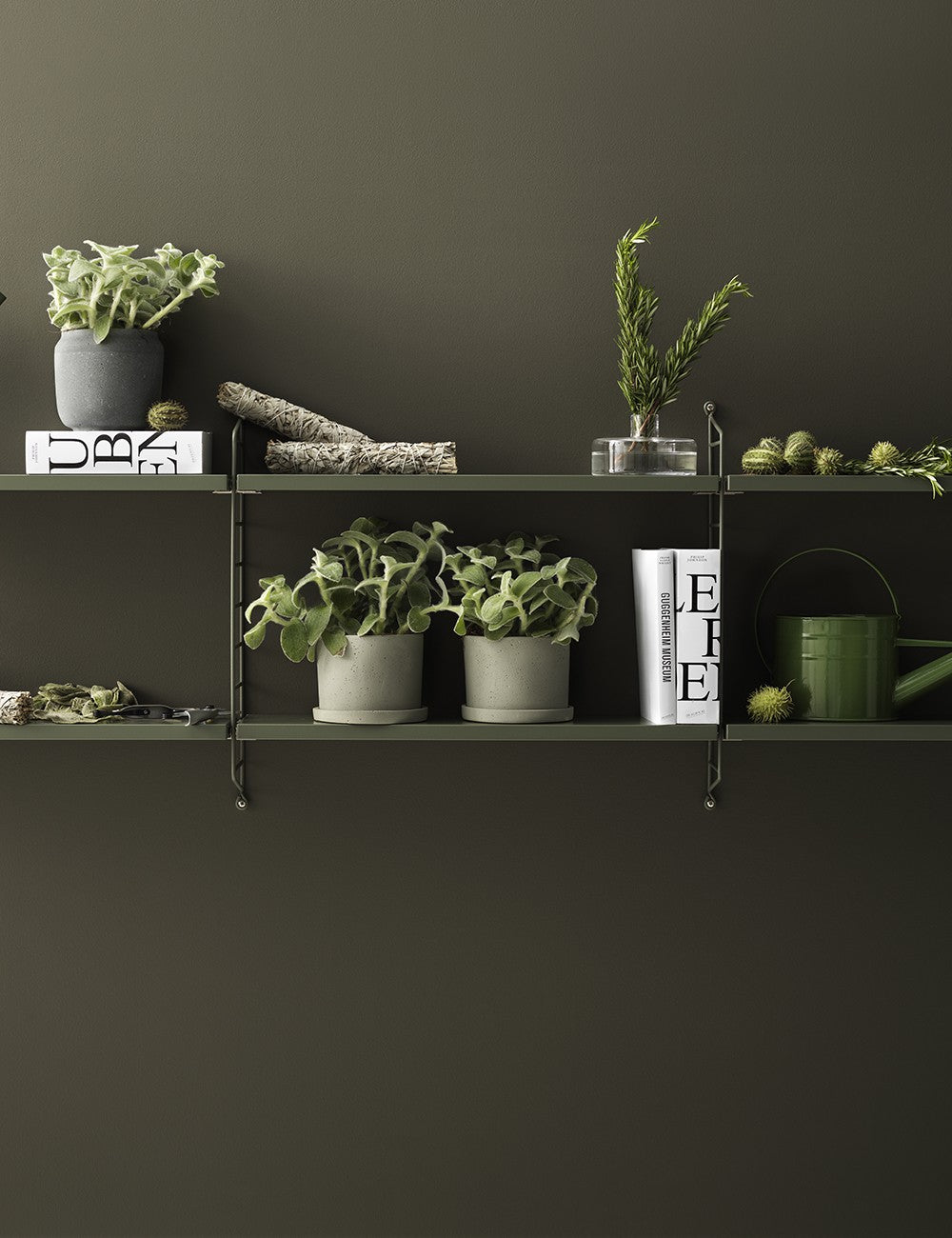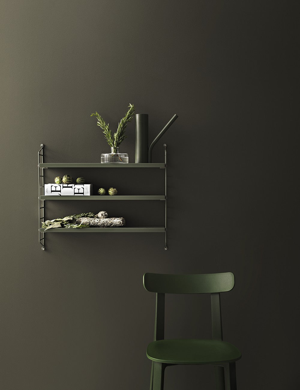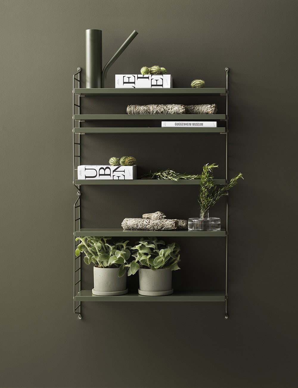String Pocket é um estante compacto e elegante para livros, colecionáveis ​​e outros itens pequenos.