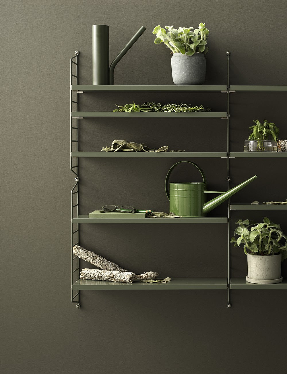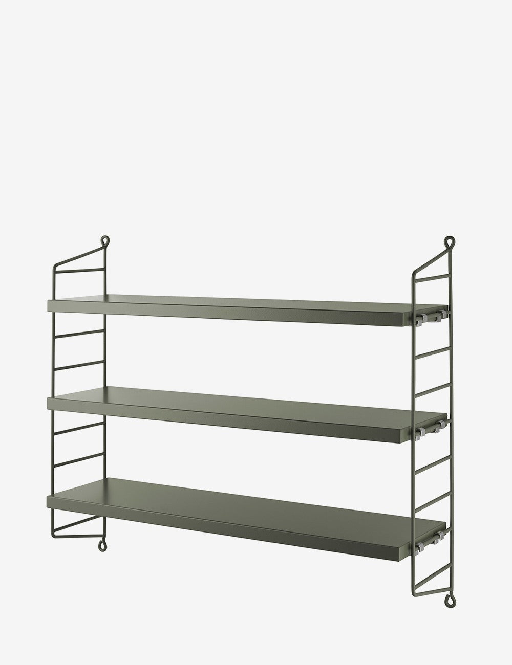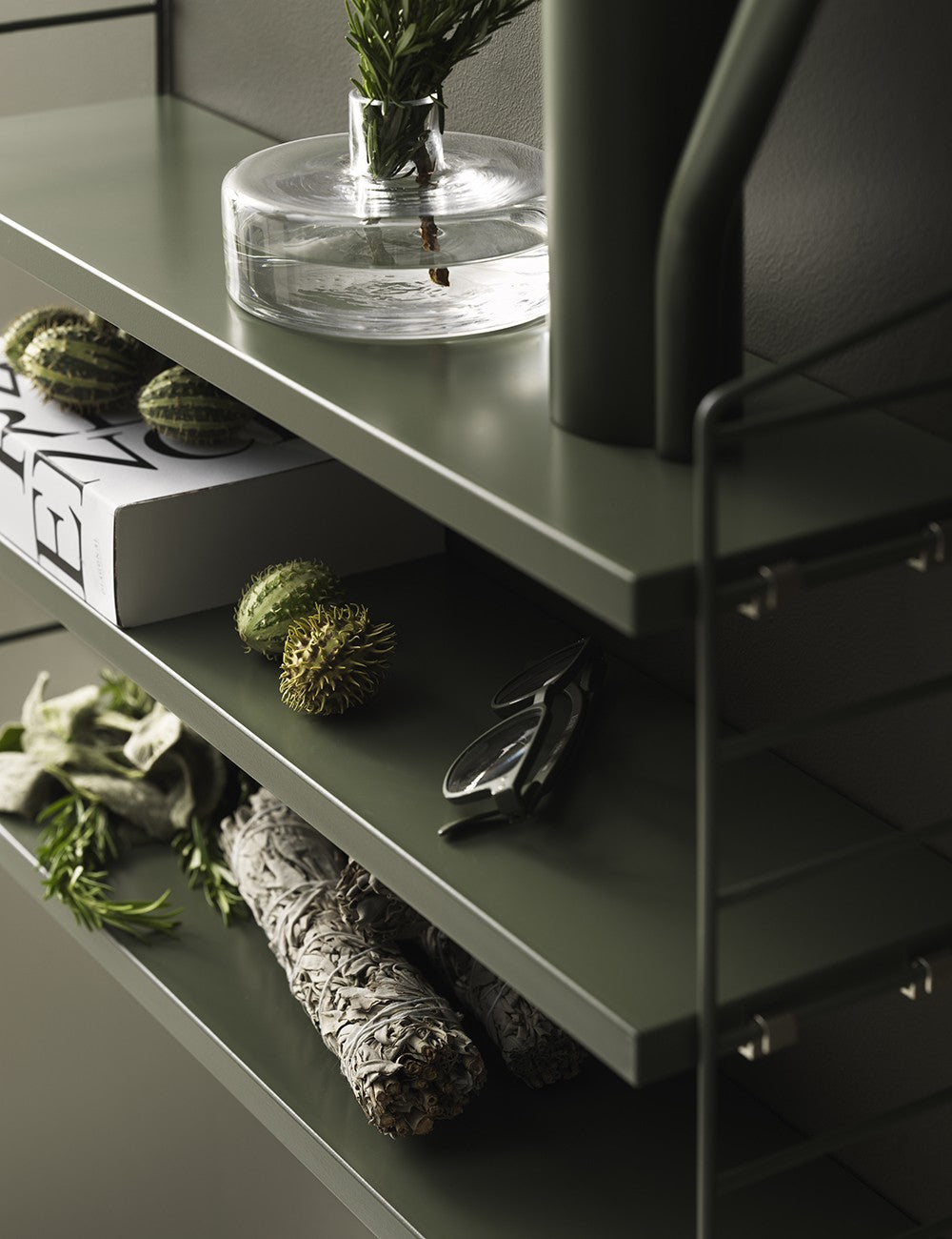 String Pocket é um estante compacto e elegante para livros, colecionáveis ​​e outros itens pequenos.