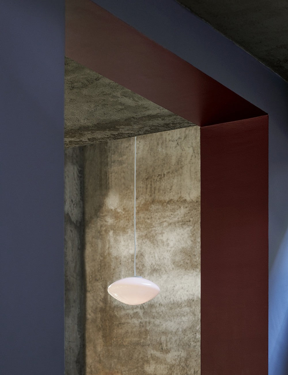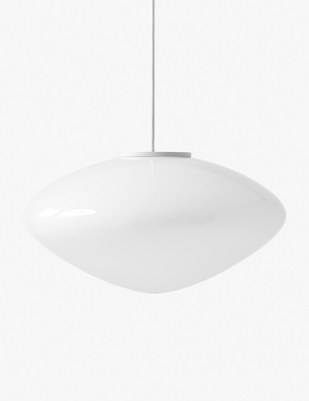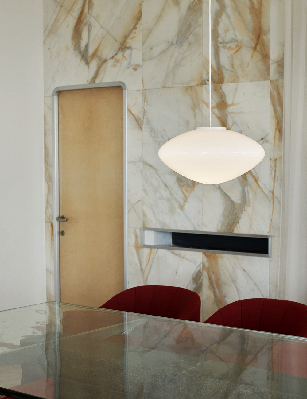 Mist é feita de vidro opalino soprado com detalhes em alumínio lacado branco.